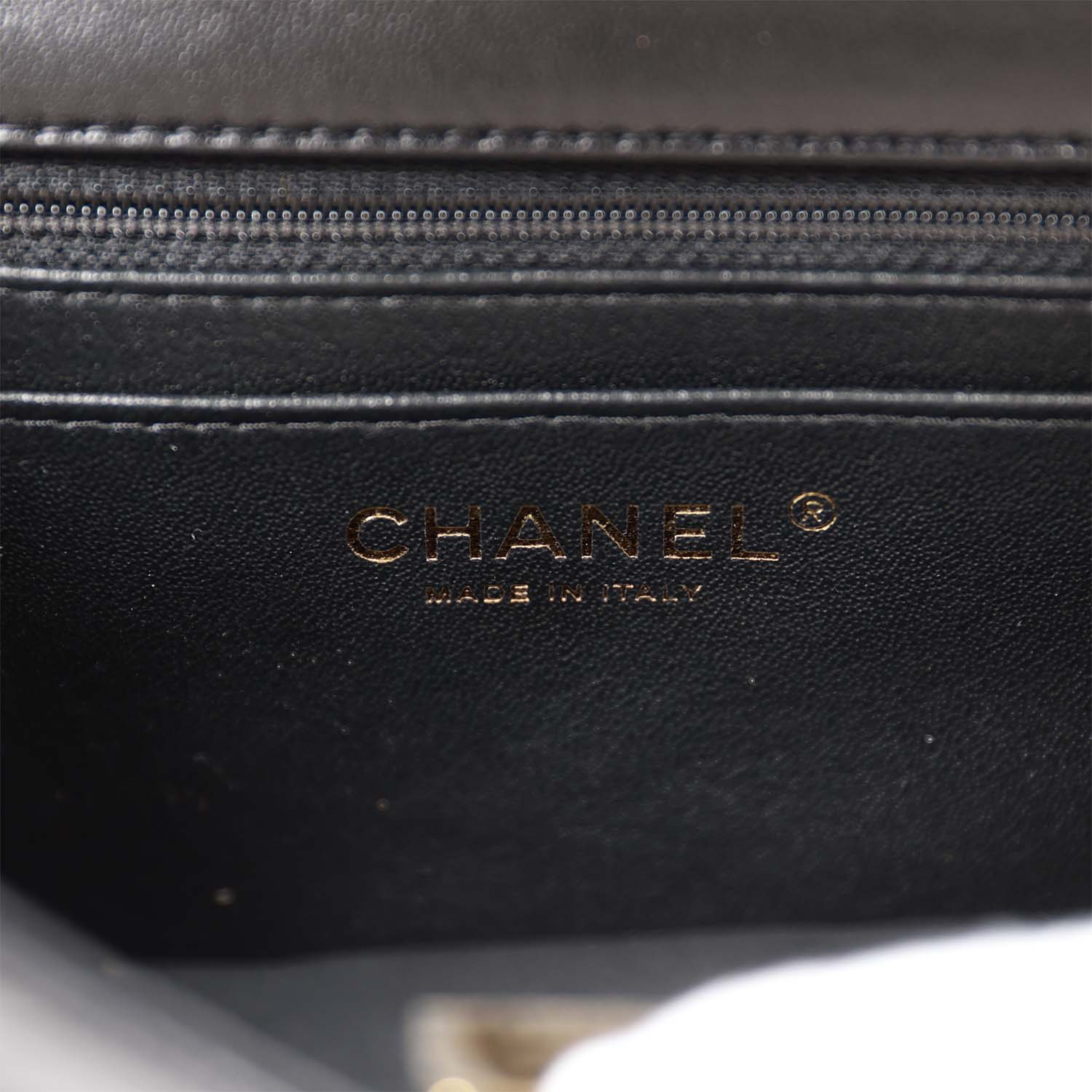The interior is lined in black leather and features a zipper pocket with Chanel pull and an open pocket below.