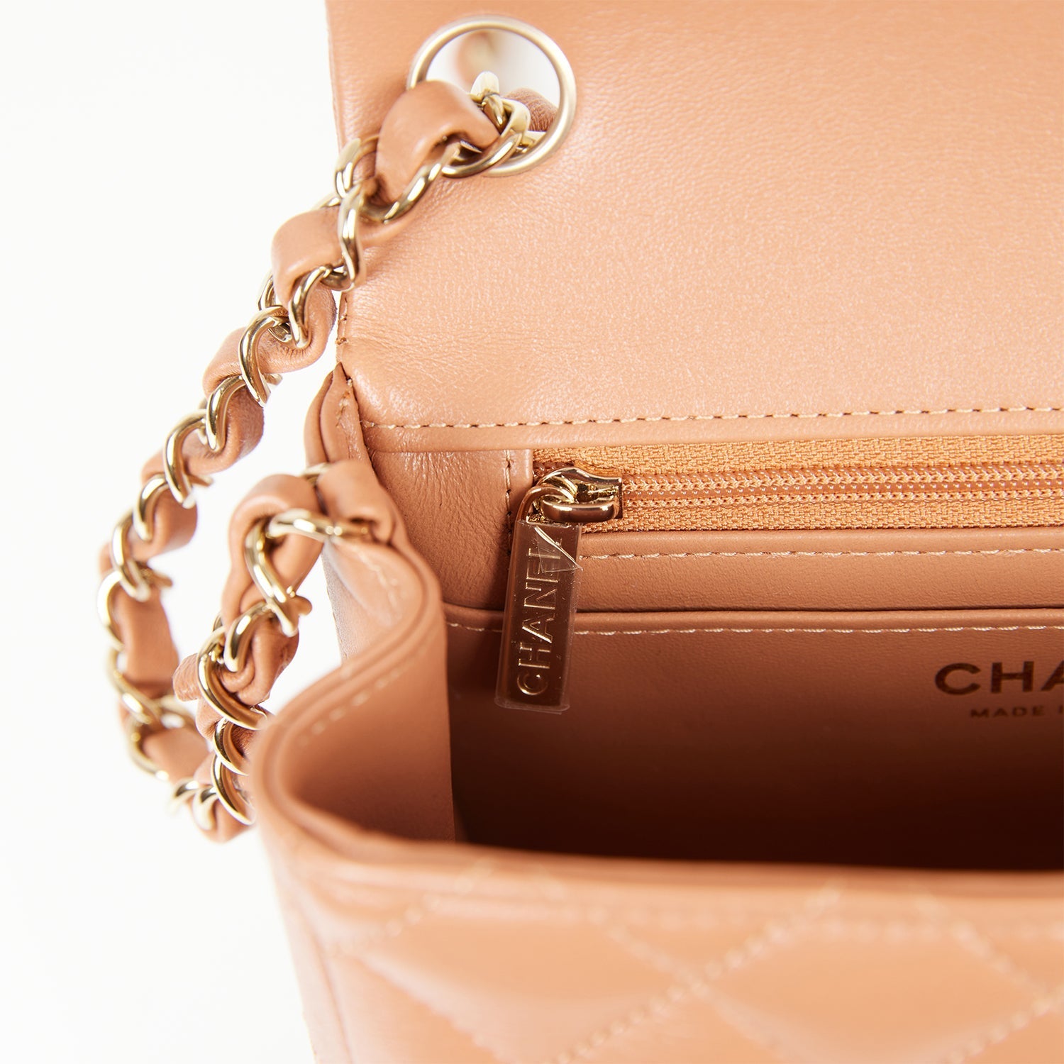 This Mini Square flap bag is in caramel lambskin with light gold tone hardware and has a front flap with signature CC turnlock closure, rear half moon pocket and single interwoven caramel leather and light gold tone chain link shoulder/crossbody strap.