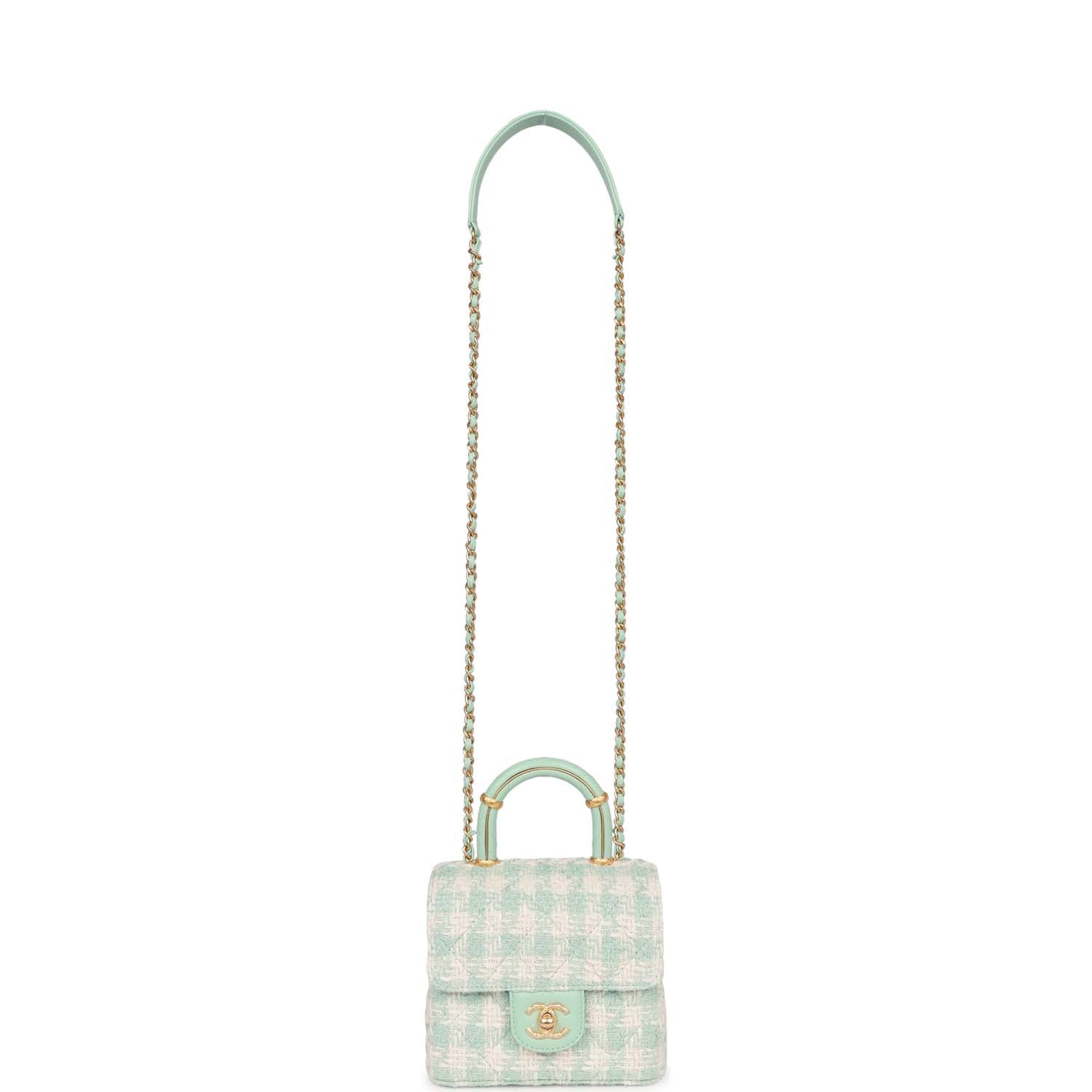 Chanel Mini Square Flap with Top Handle Turquoise and Ecru Tweed Antique Gold Hardware