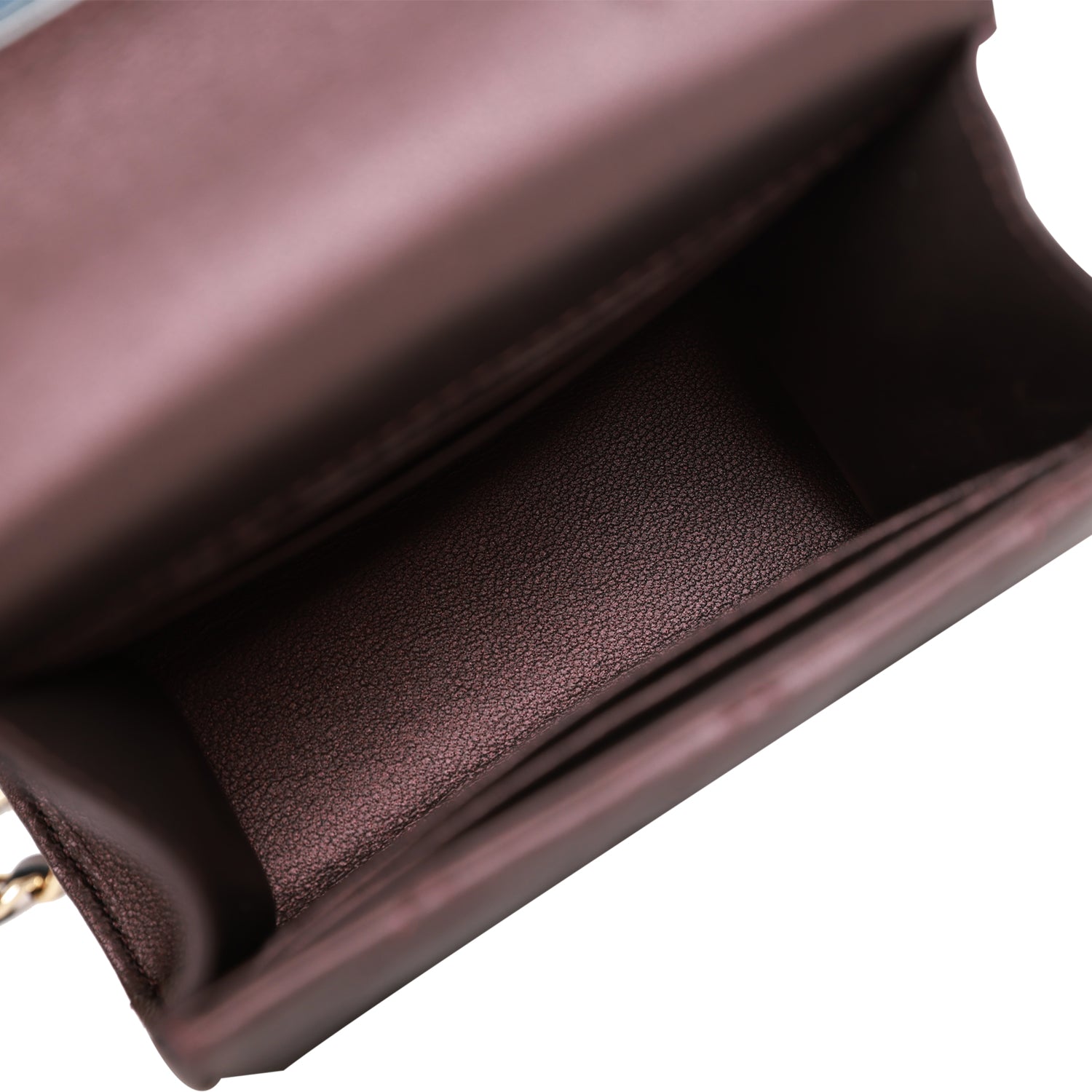 This Mini Top Handle Clutch with Chain bag is of burgundy iridescent lambskin leather with light gold tone hardware and has a front flap with signature CC, magnetic closure, single interwoven burgundy leather and light gold tone chain link shoulder/crossbody strap.