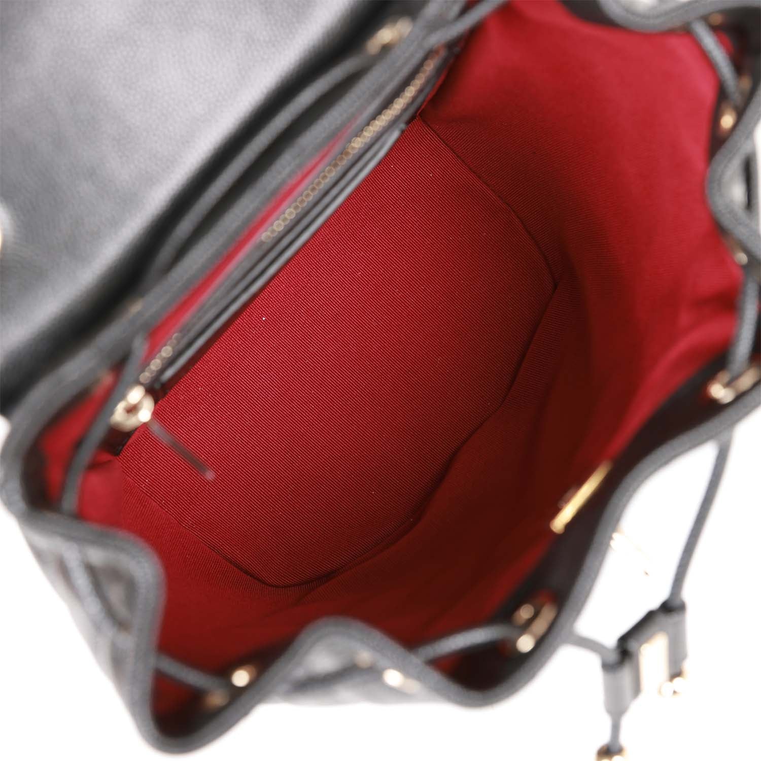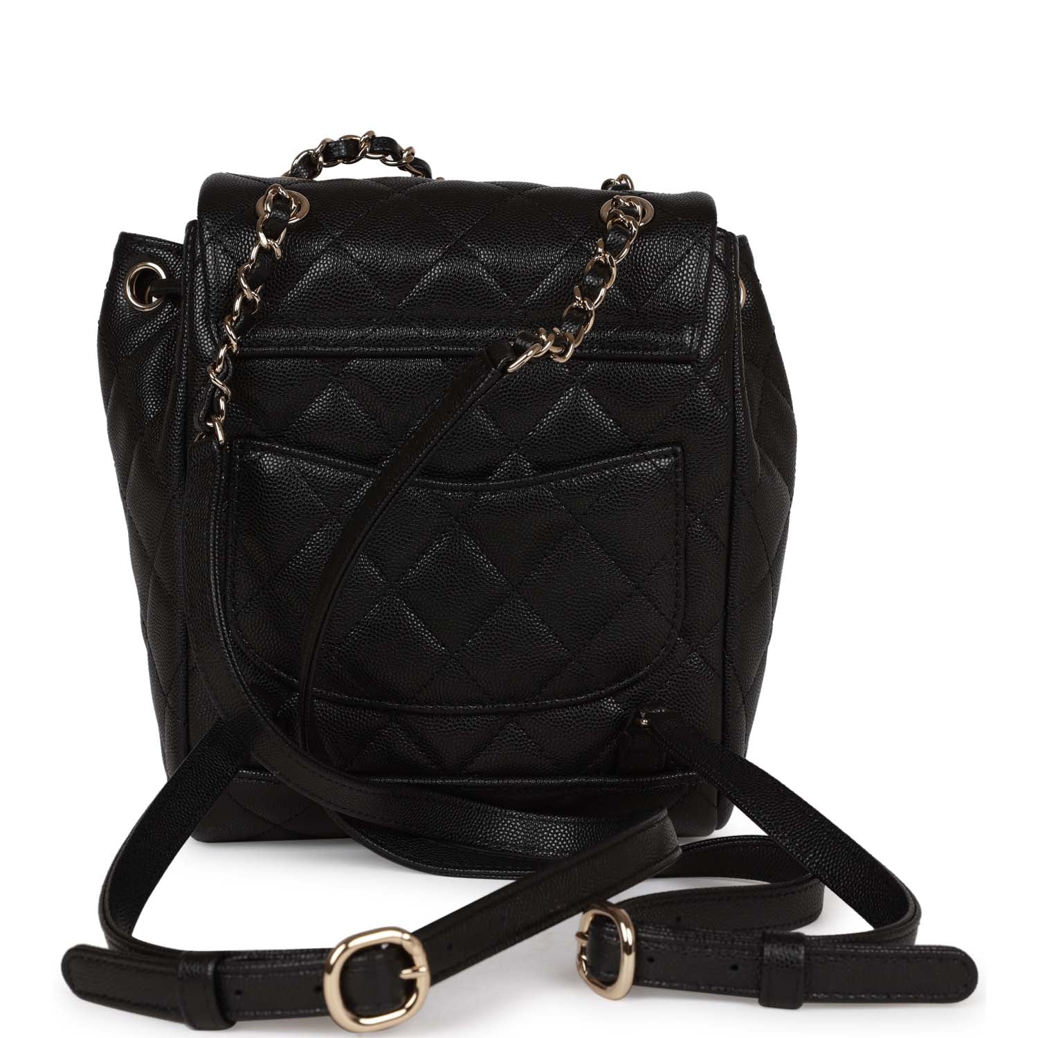 This Mini Urban Spirit backpack is of black caviar leather with gold tone hardware and has a front flap with signature CC logo, rear slip pocket, single interwoven black leather and gold tone chain link top handle and adjustable straps.
