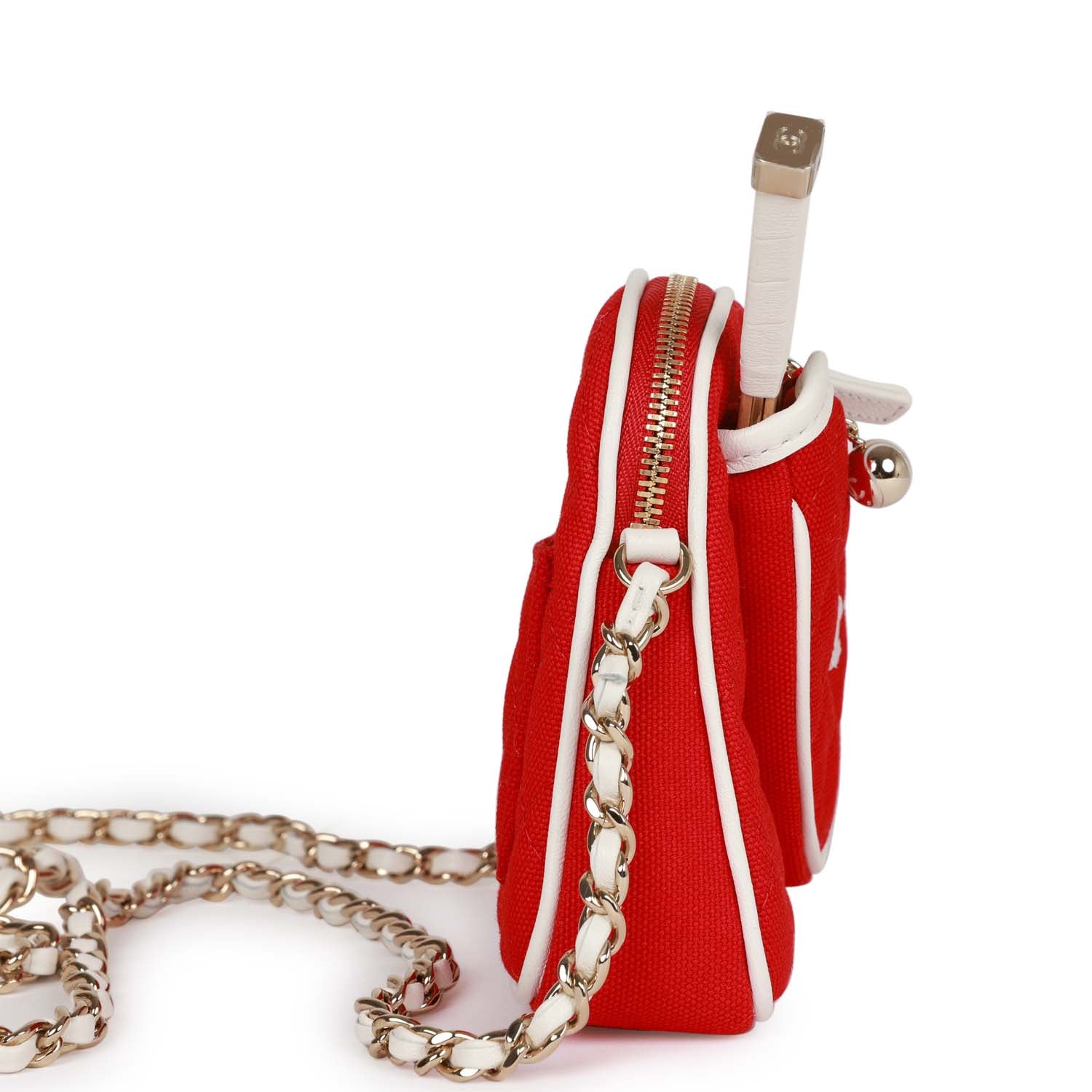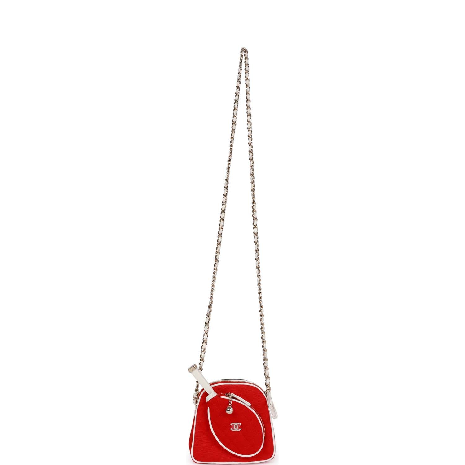 This "Monte-Carlo" mini crossbody tennis bag is in red canvas with light gold tone hardware and has a pocket for tennis racquet mirror, half moon back pocket and an interwoven light gold tone metal chain link and white leather cross body strap.