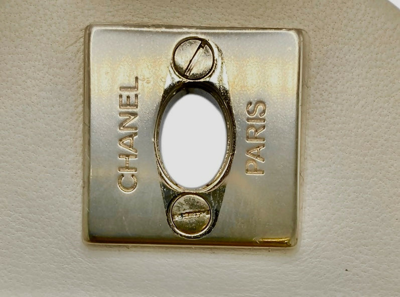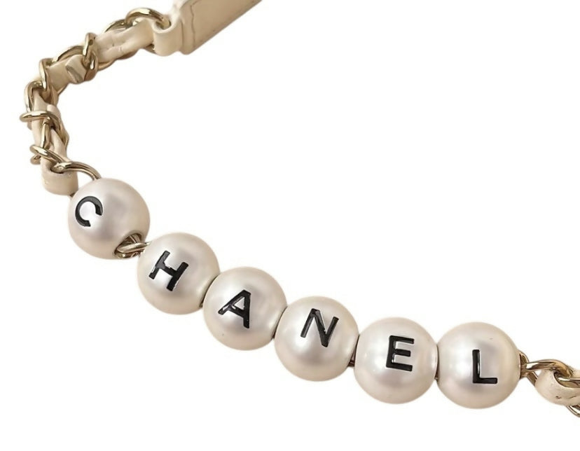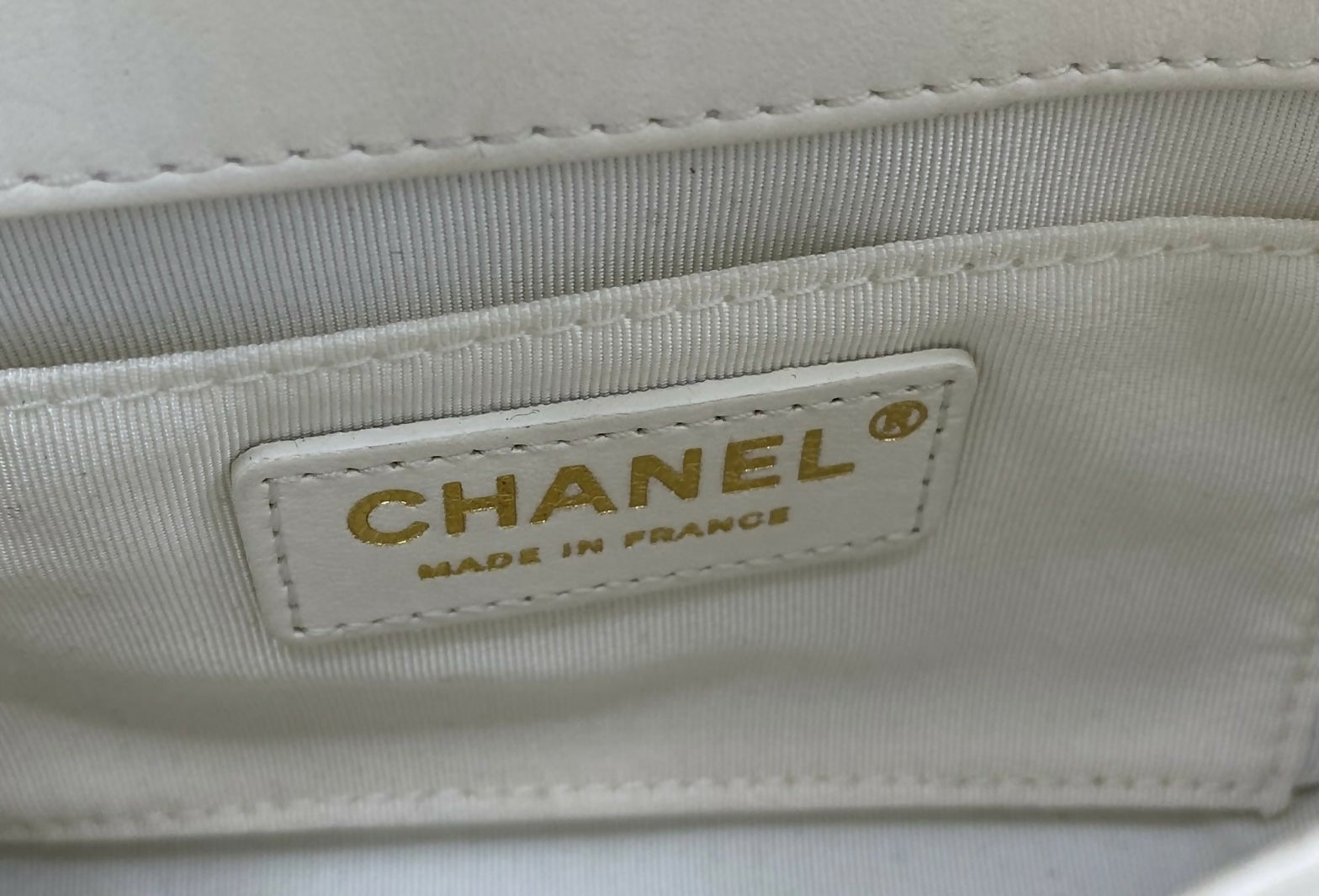 This petite belt bag bag is Chanel’s ‘Winter White’ white ivory cream butter soft Lambskin leather quilted leather with campaign gold hardware. The bag features leather threaded silver chain-link chain detail, set on a white leather waist strap, and accented by resin pearls spelling CHANEL. The envelope flap opens with a silver Chanel CC turn lock to a white fabric interior with a patch pocket.