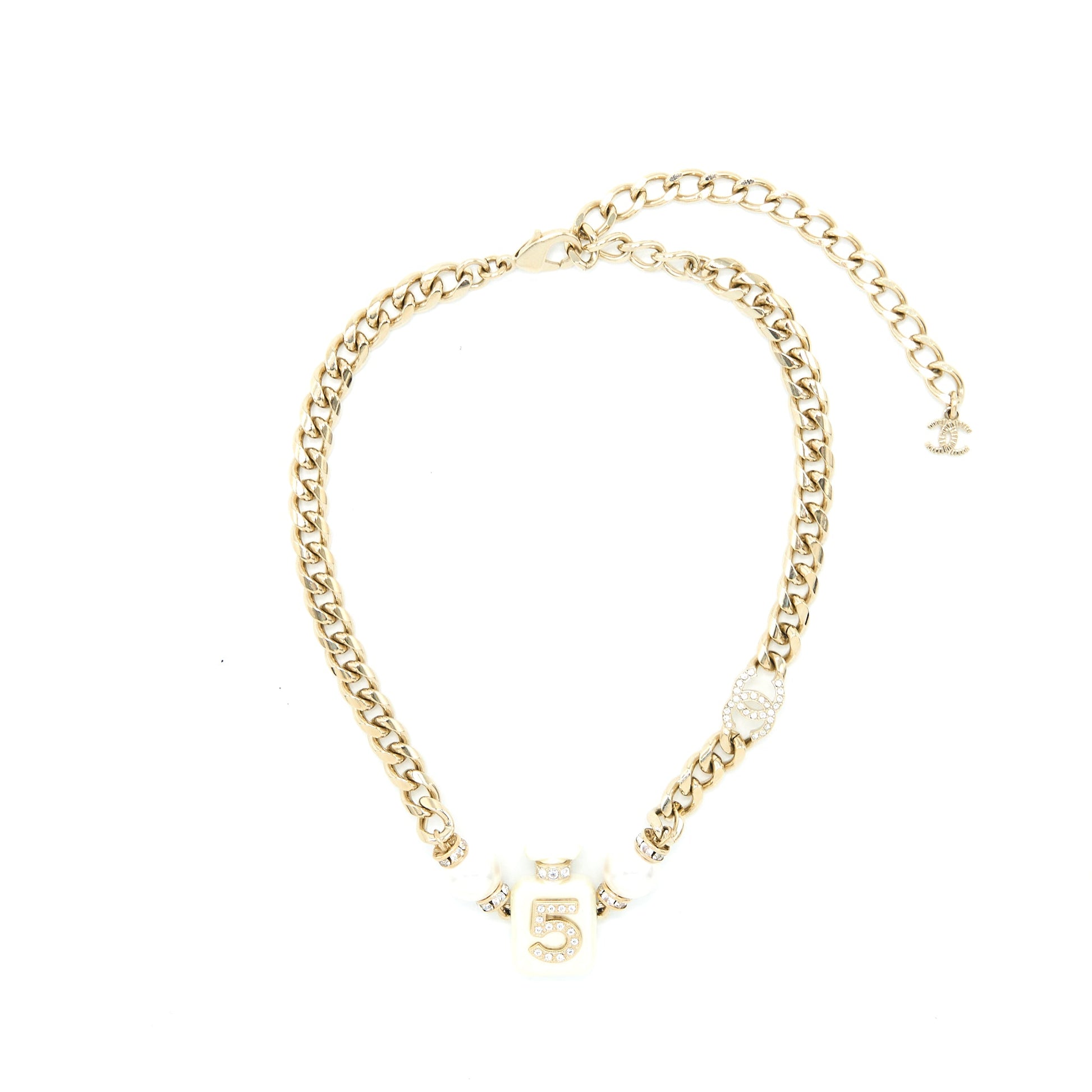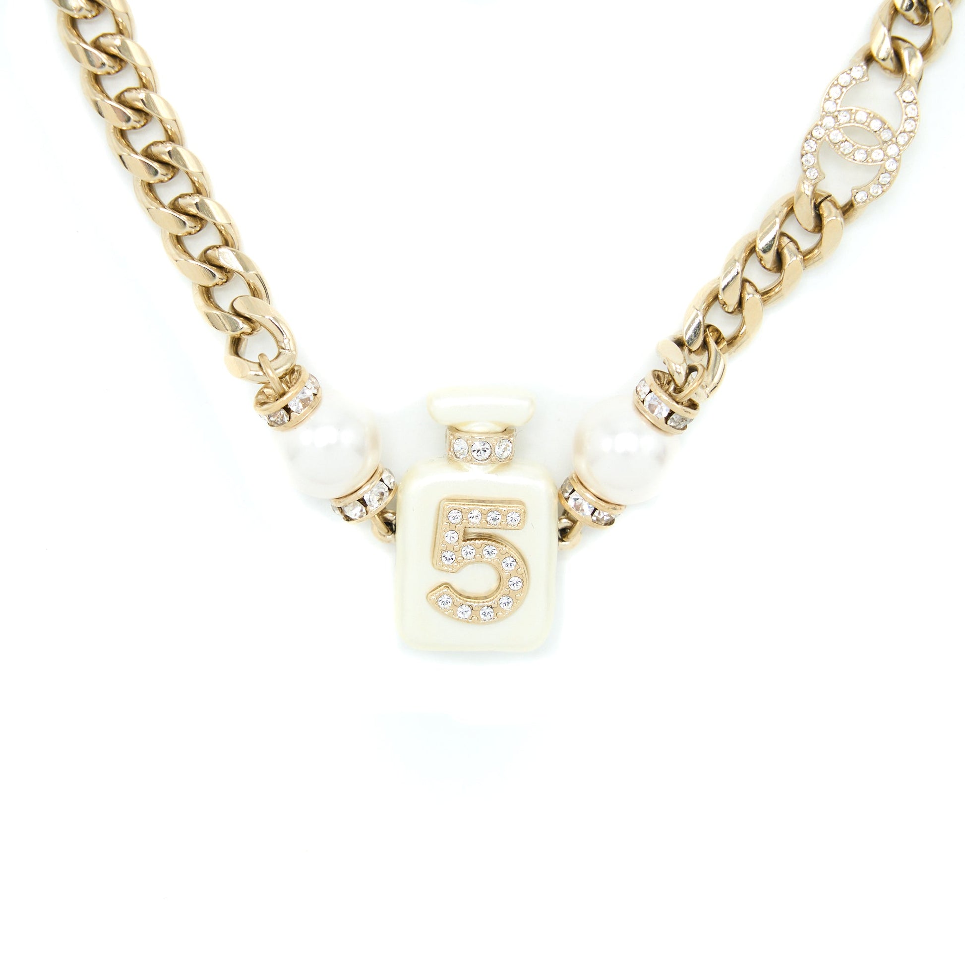 Chanel No.5 Perfume Bottle Chocker/ Necklace Crystal/Pearl Light Gold Tone