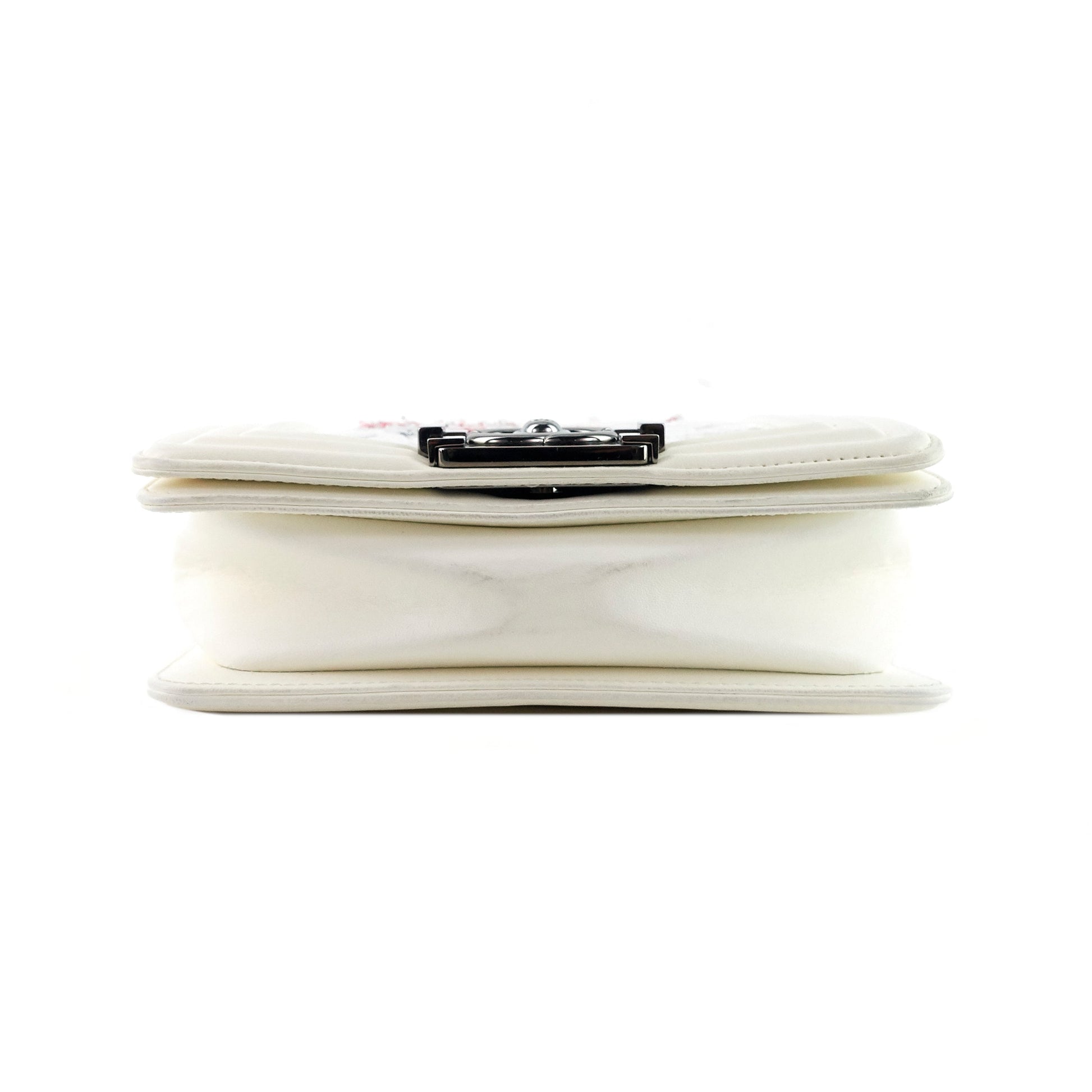 A Chanel Boy bag in lambskin leather detailed with Chanel No 5 graffiti. True to the style, it features a quilted border with sleek lines, a chunky chain strap, and an easily recognizable Double C clasp.