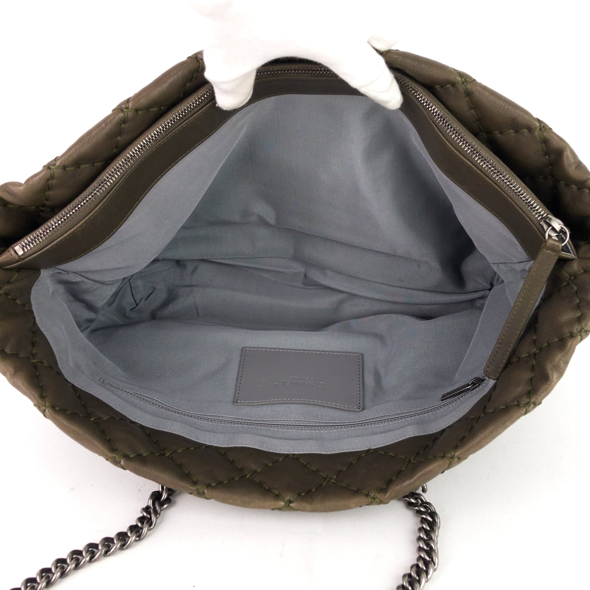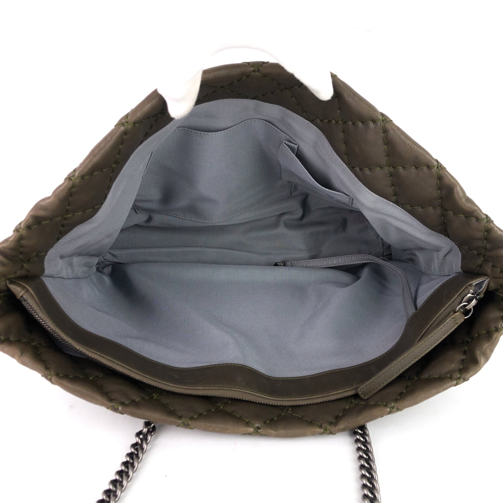 Prominent diamond quilting distinguishes a calfskin leather tote that's packed with a variety of pockets and topped with elongated leather-and-chain straps.