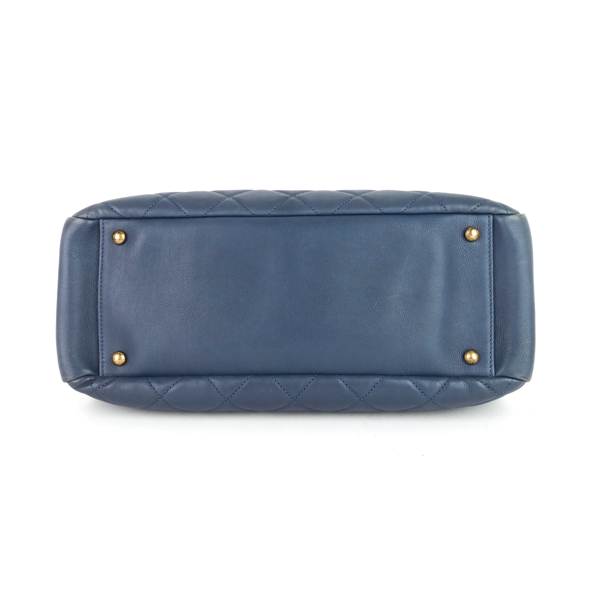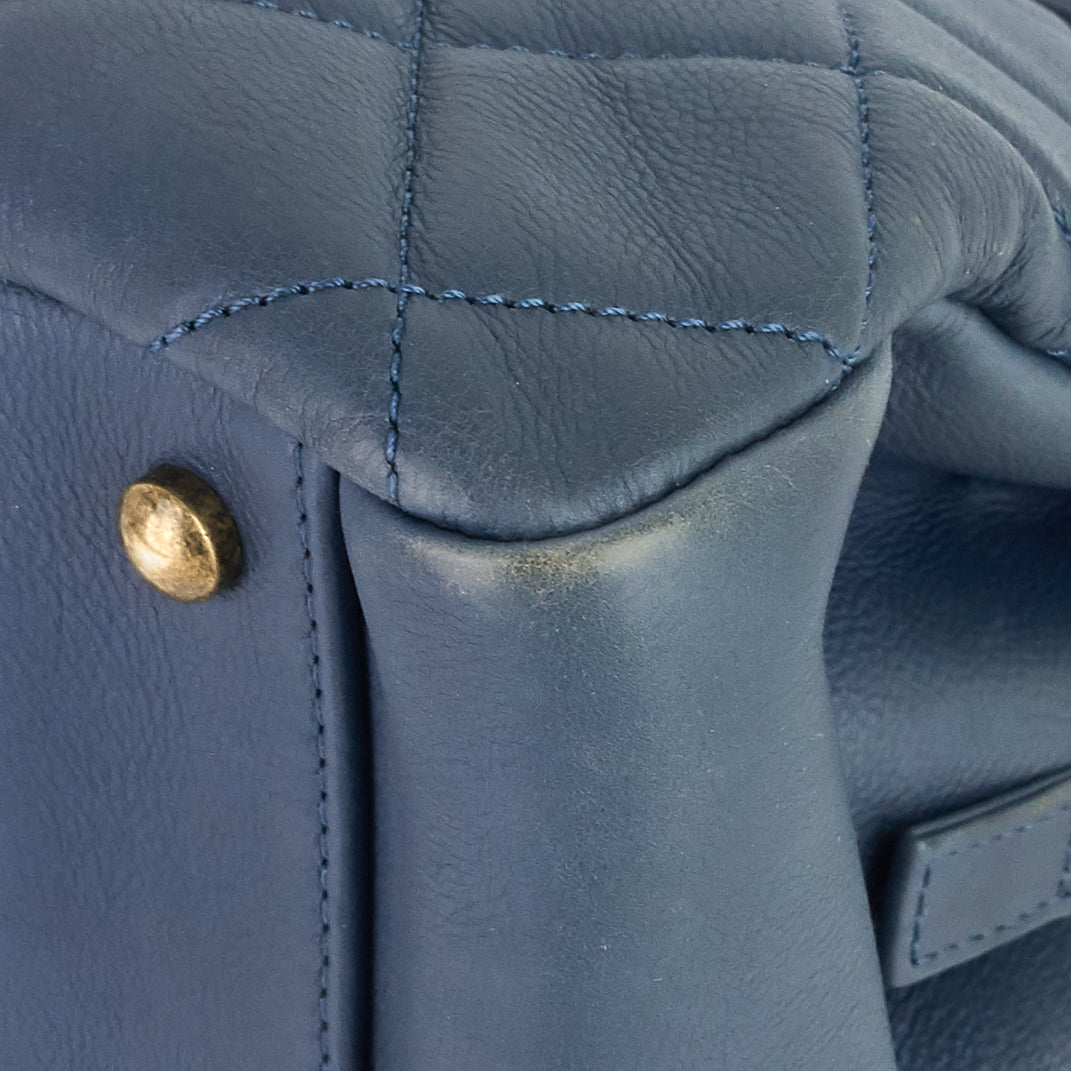 A diamond-quilted calfskin tote featuring chain-and-leather straps and a divided interior for easy organization. Antique brass hardware hardware completes the luxe look and lends the style a vintage flair.