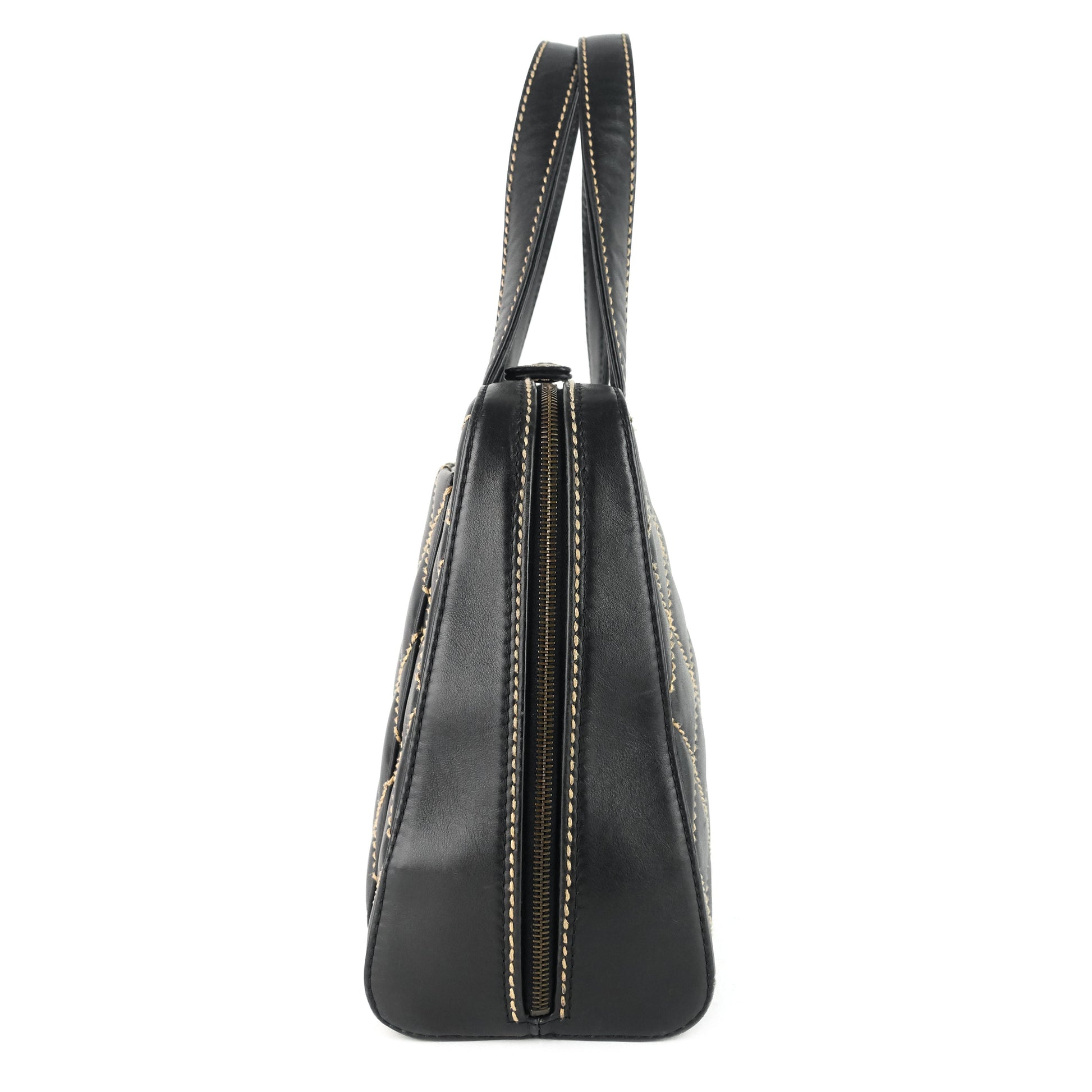This vintage leather bowler bag designed with bold contrast stitching and a miniature monogram accessory is topped with long top carry handles for comfortable, all-day wear. The design is by Karl Lagerfeld, and dates from around the turn of the century.