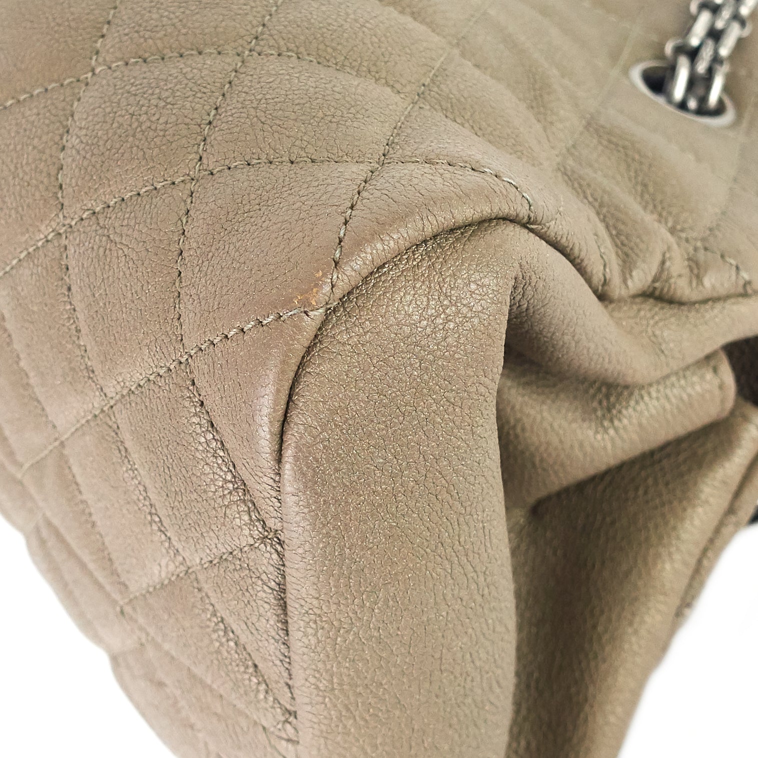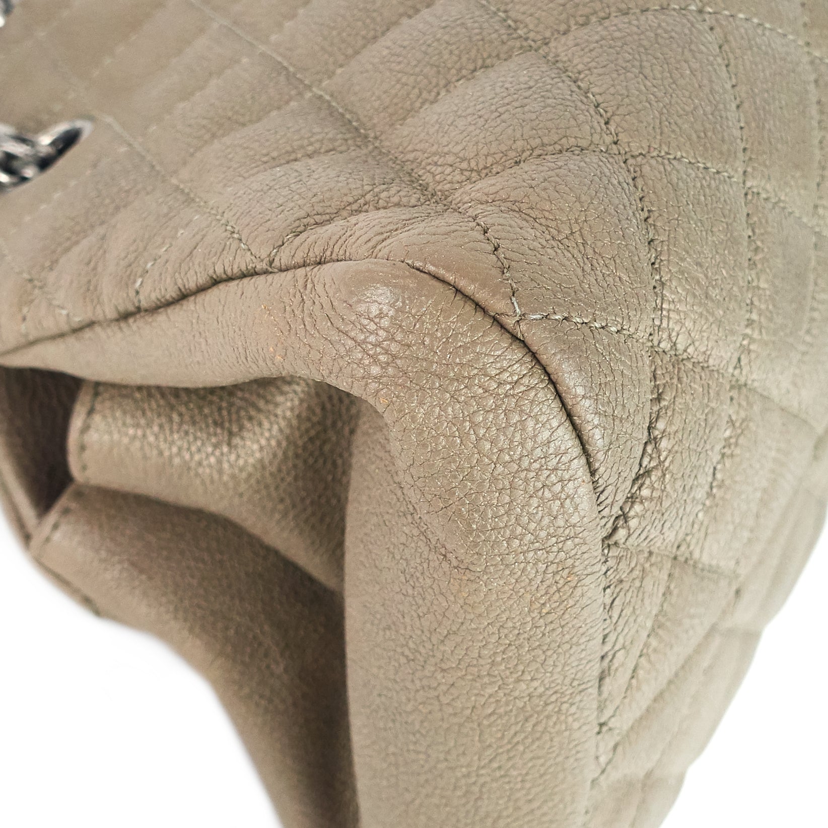 This spacious shoulder bag made from diamond-quilted caviar leather features a pull-through chain-link strap, a dangling interlocking-C charm, and a trio of compartments for easy organization.