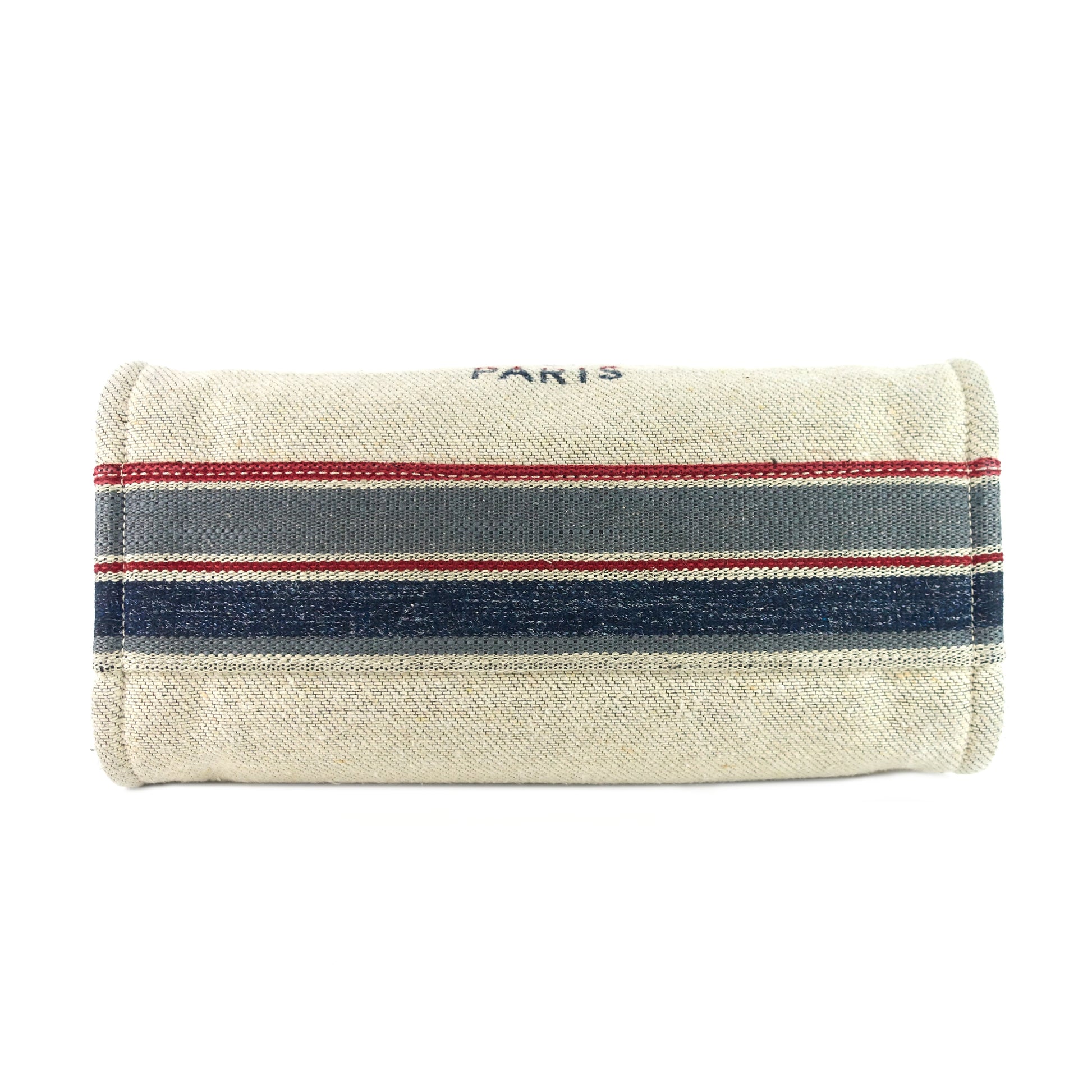 A spacious striped-canvas tote detailed with Chanel's double-C logo and the address of Gabrielle Chanel's first boutique.