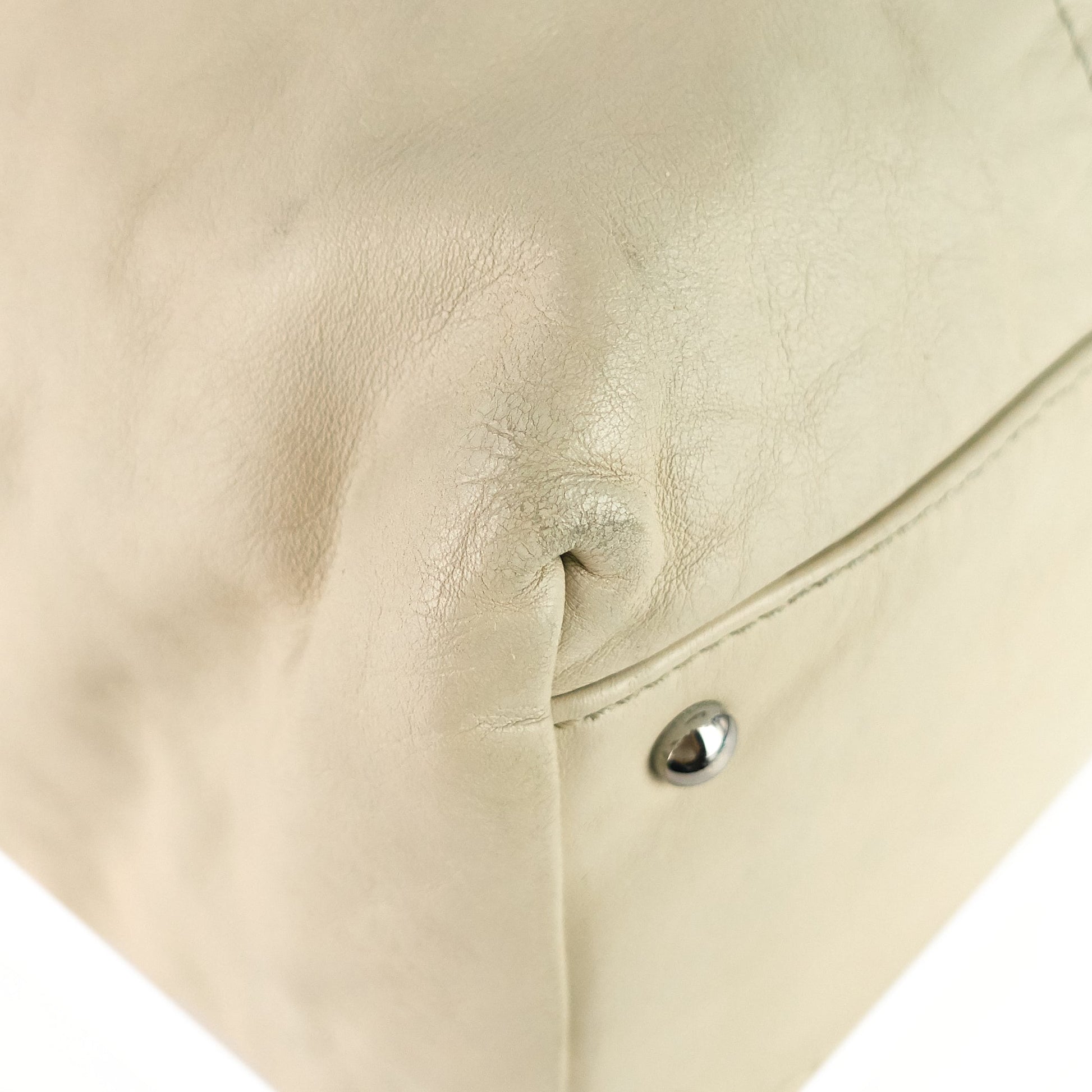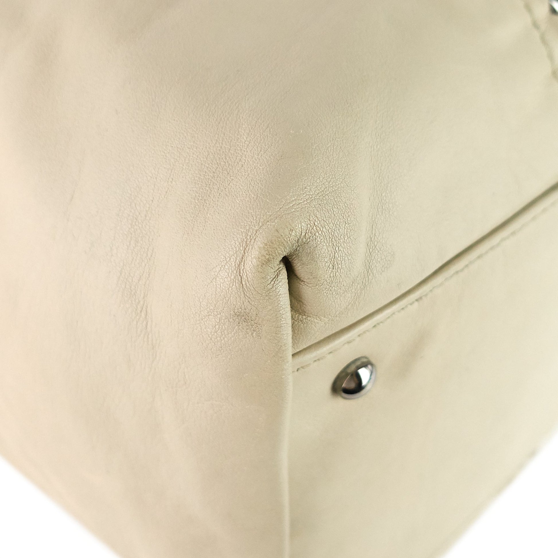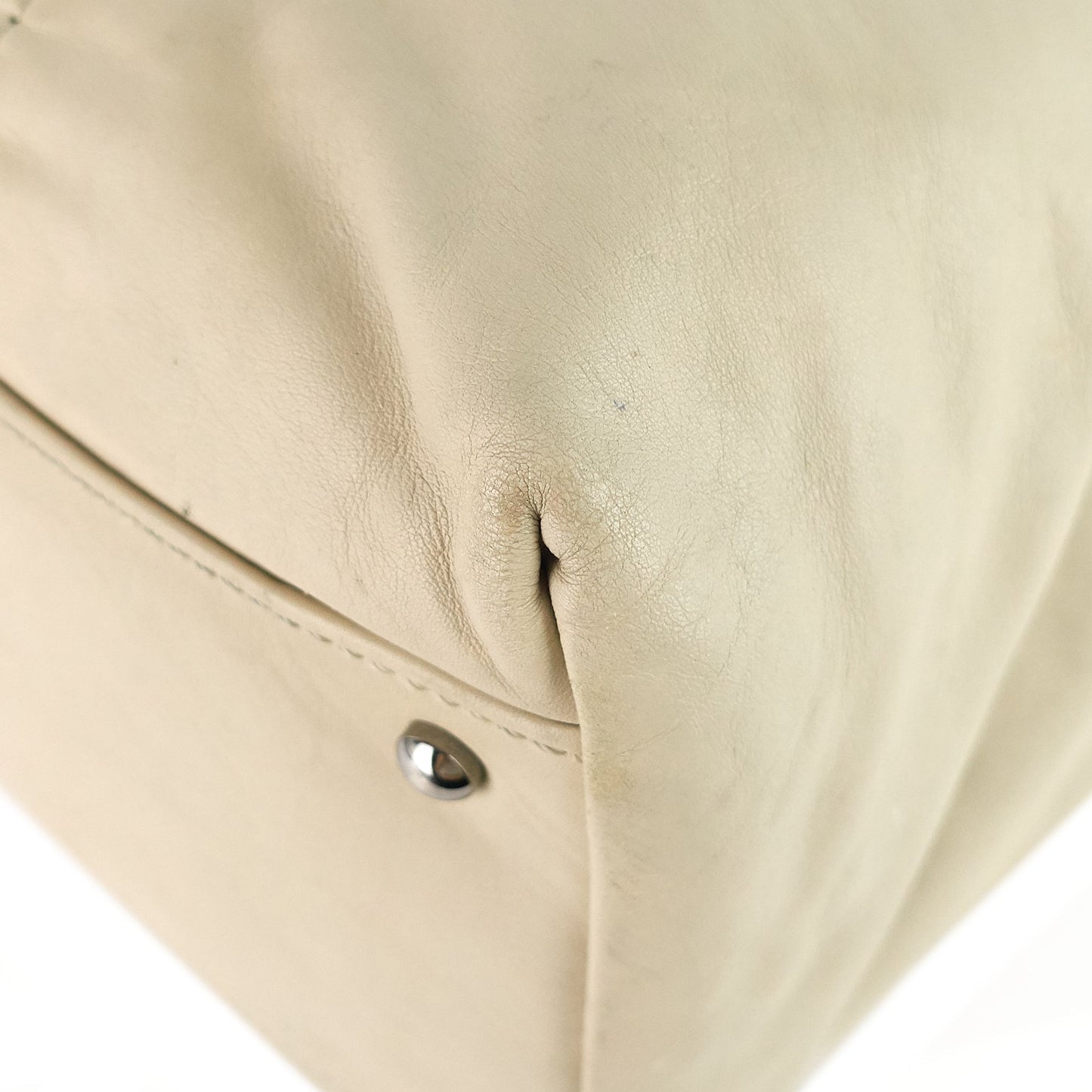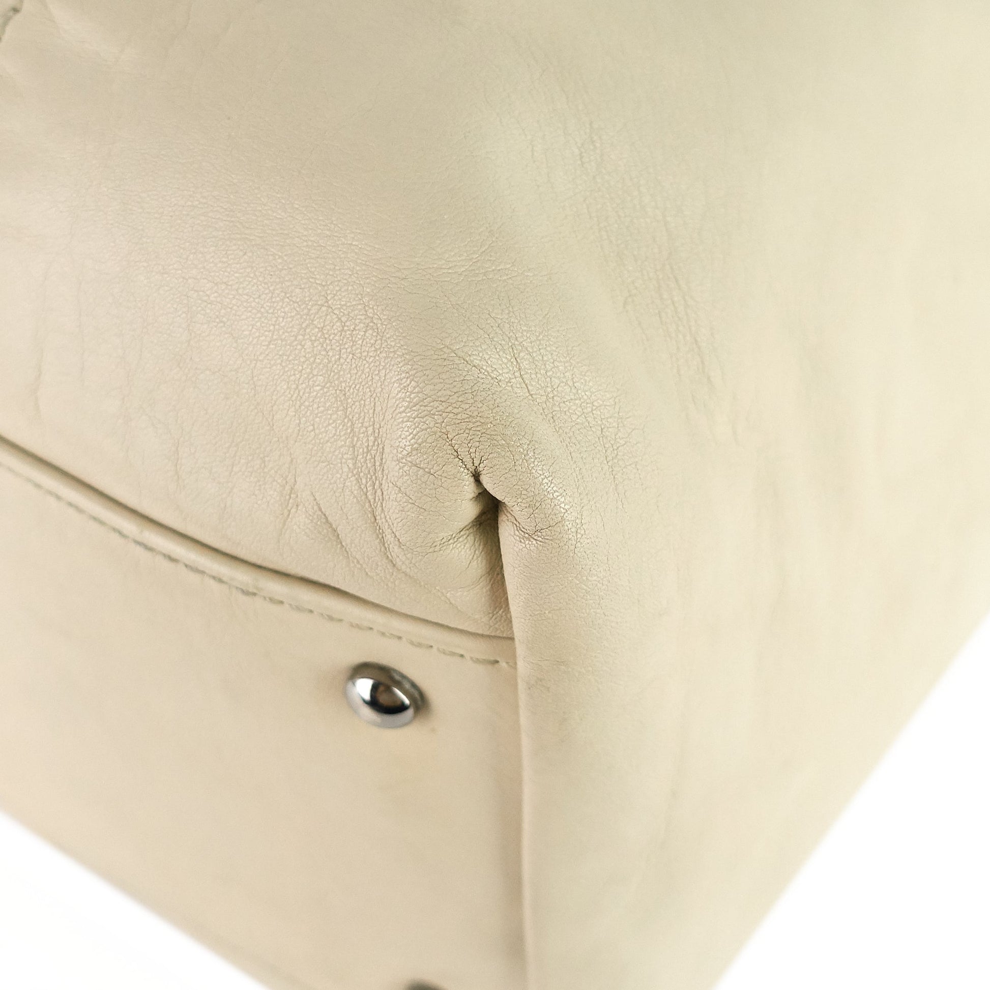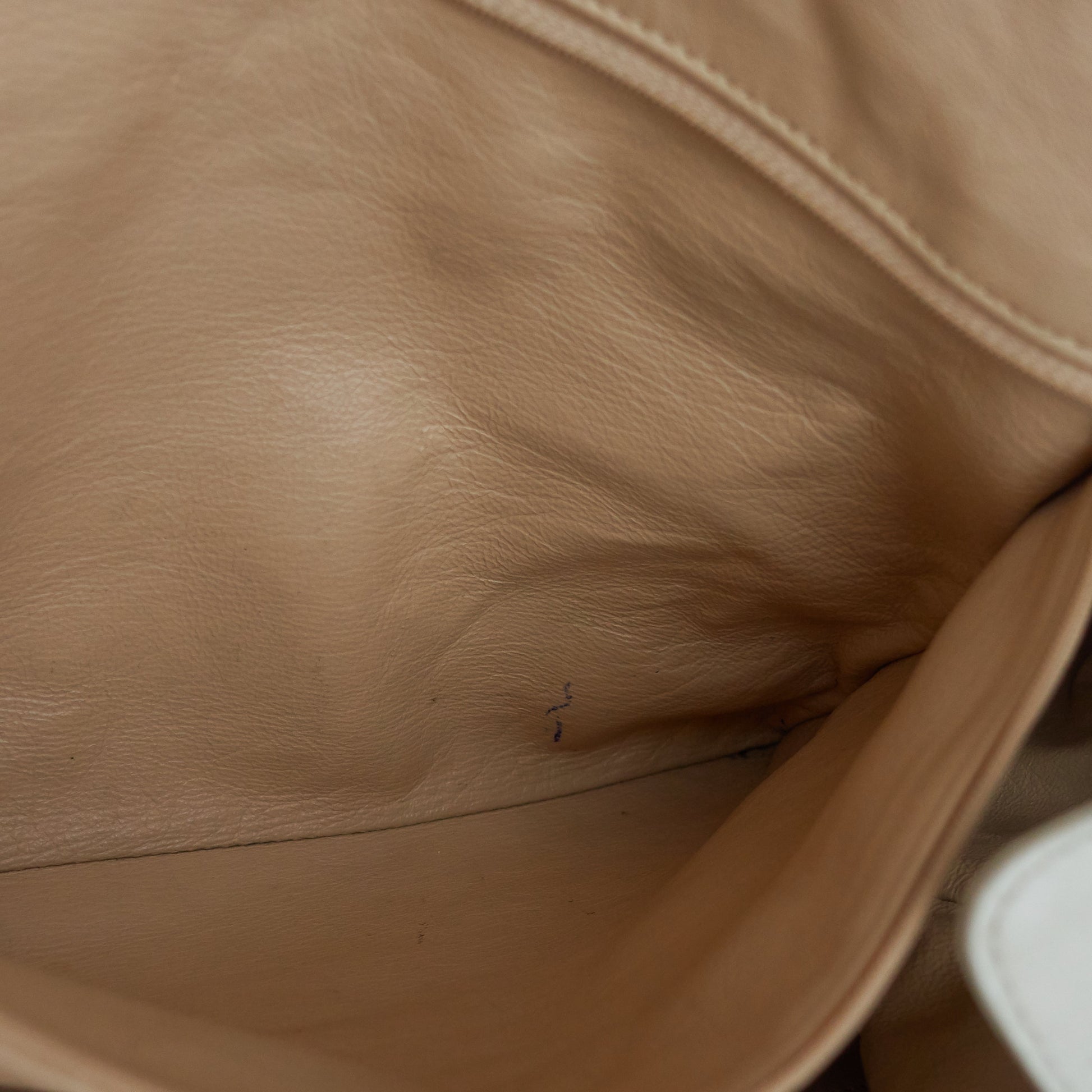 Overall: The exterior has signs of wear, including surface scratches and several cracks. There are signs of rubbing to the leather used in the straps. The base of the straps (where they attach to the bag) shows fraying. The interior has signs of wear and scratching, as well as several small stains. The hardware remains bright and shiny with no visible wear.
