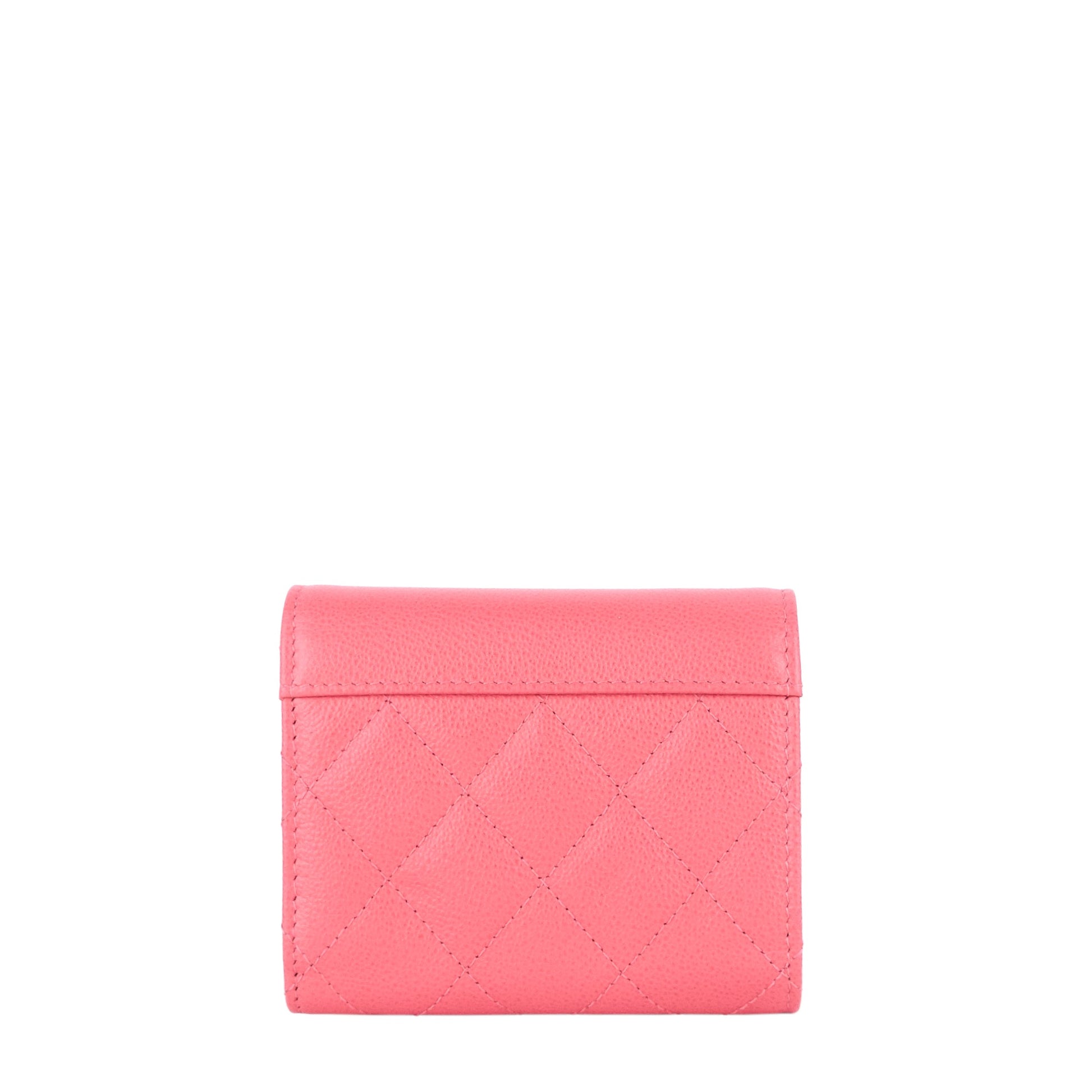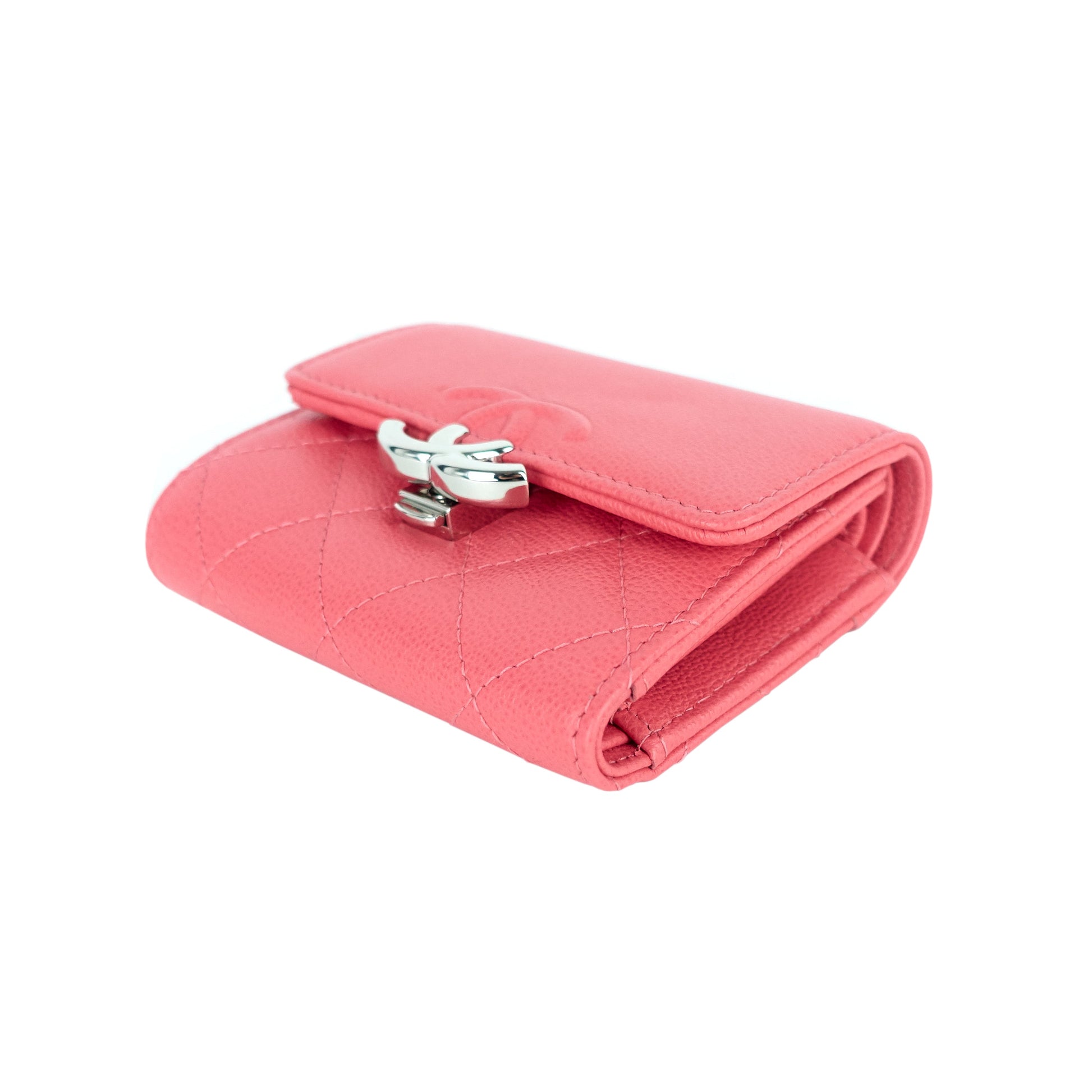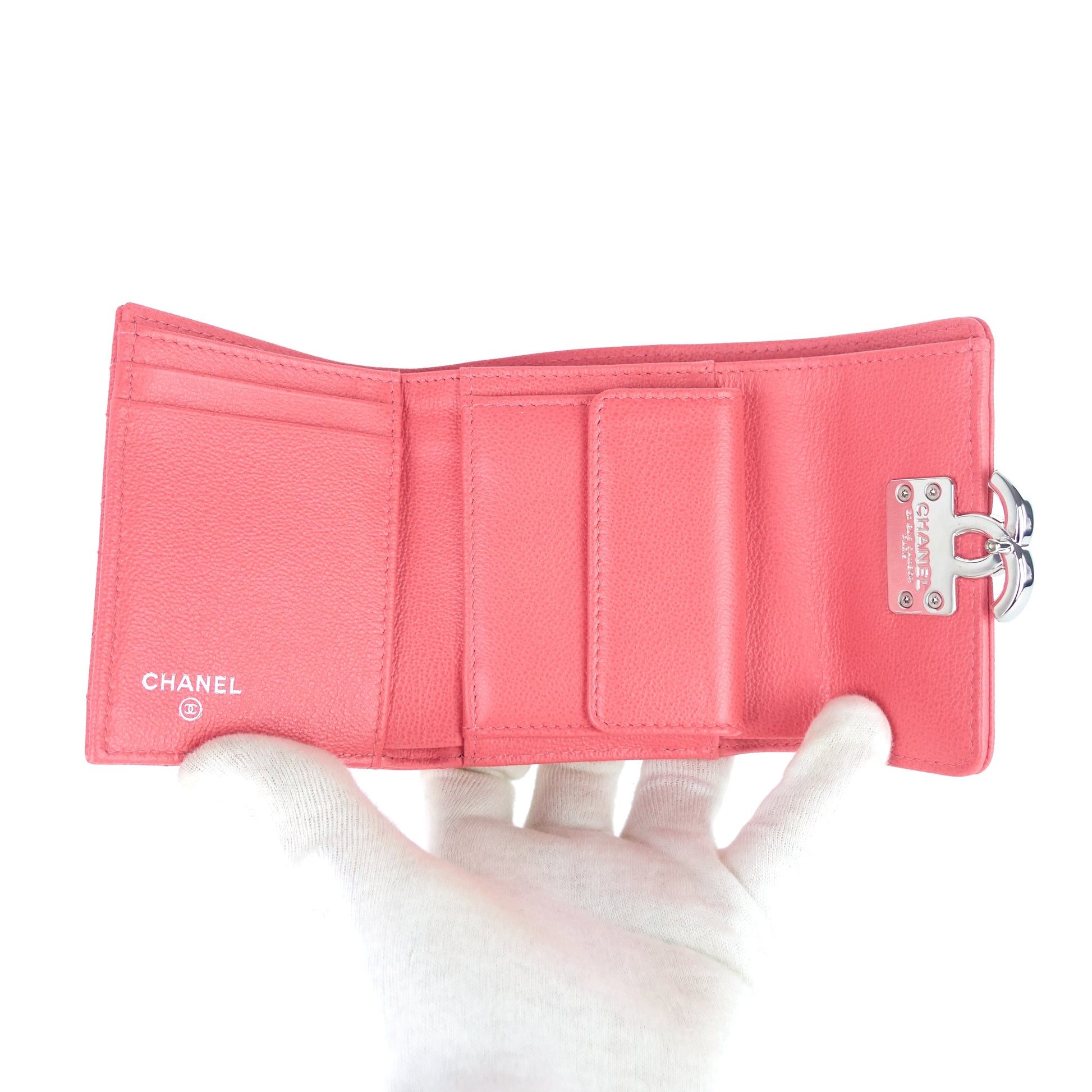 Chanel's unmistakable double-C logo—done here in embossed leather and polished metal—boldly brands a quilted trifold wallet containing plenty of slots and pockets to hold your cards, cash and receipts.