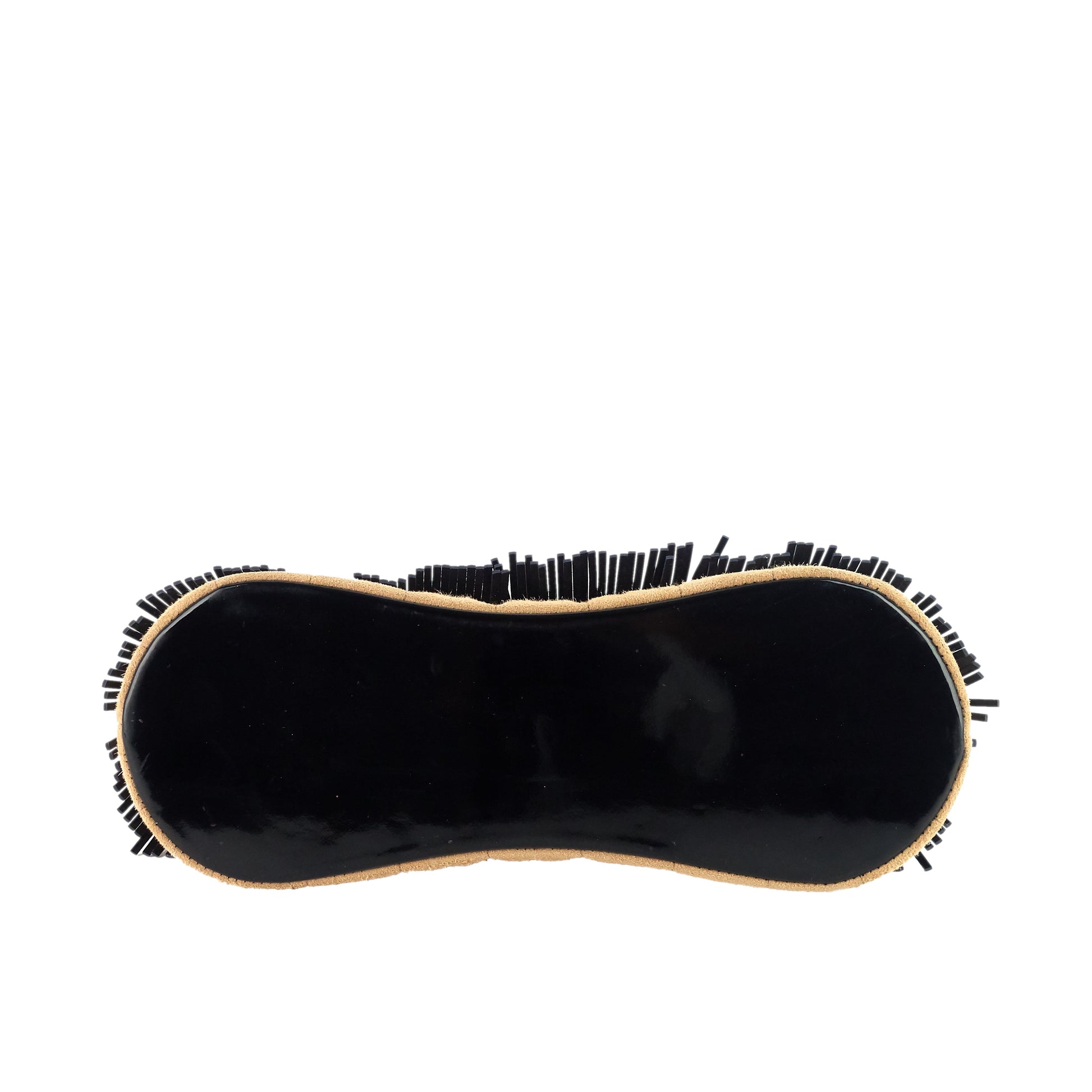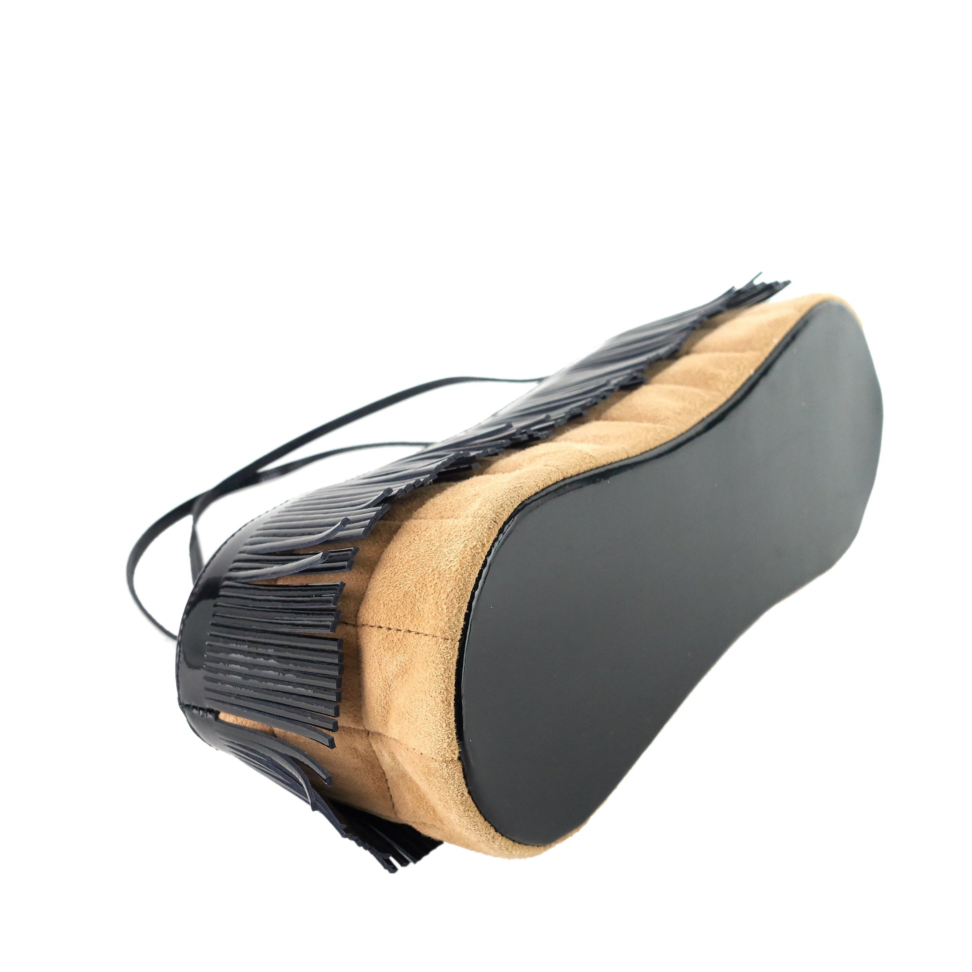 Overall: Both the exterior suede and interior textile are in excellent condition with no conspicuous wear. The black patent leather is in good condition with signs of scratching, staining, rubbing, and general surface wear. Some of the fringes are slightly bent.