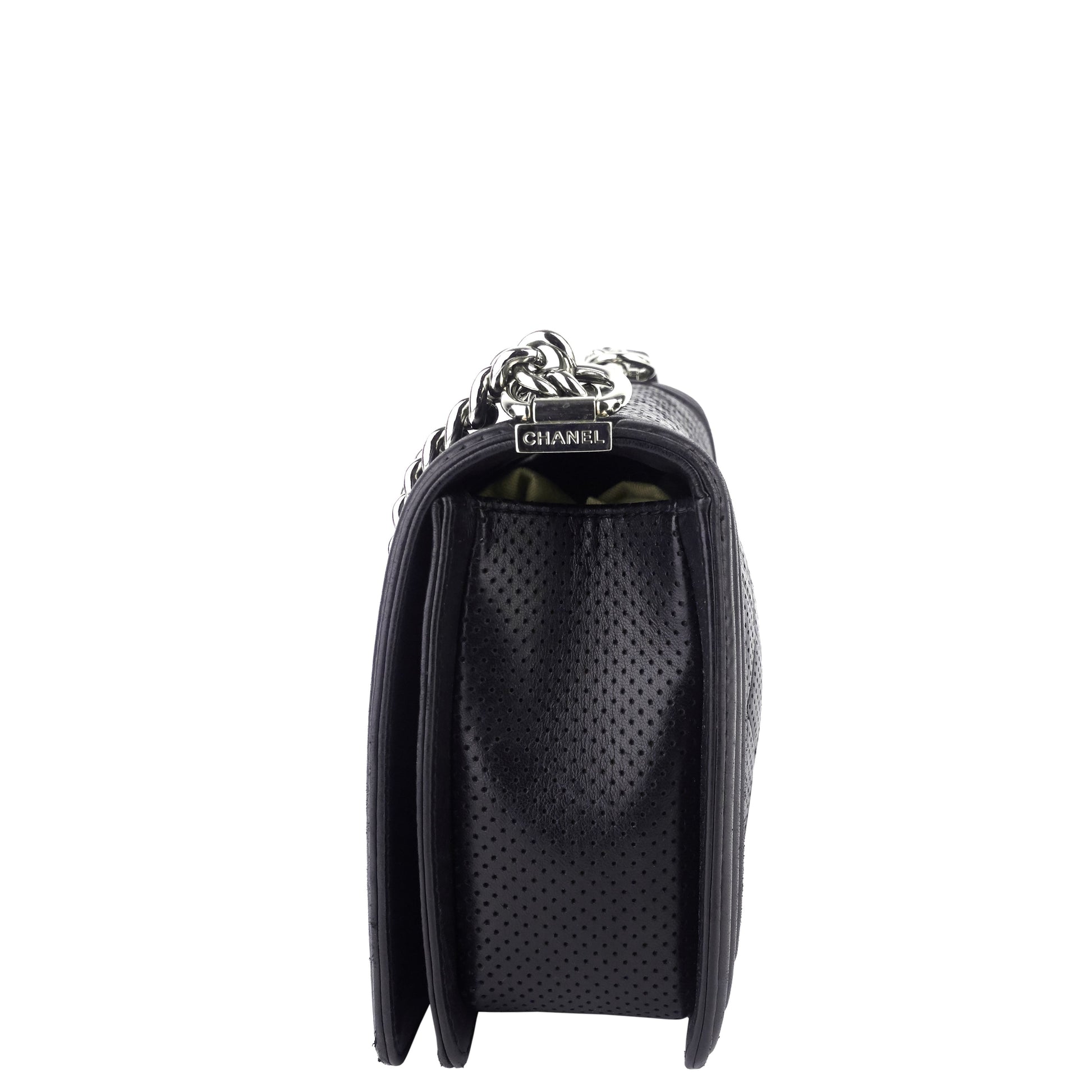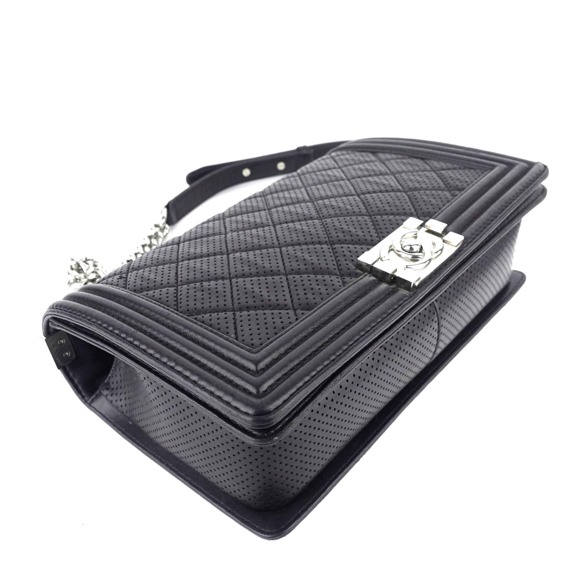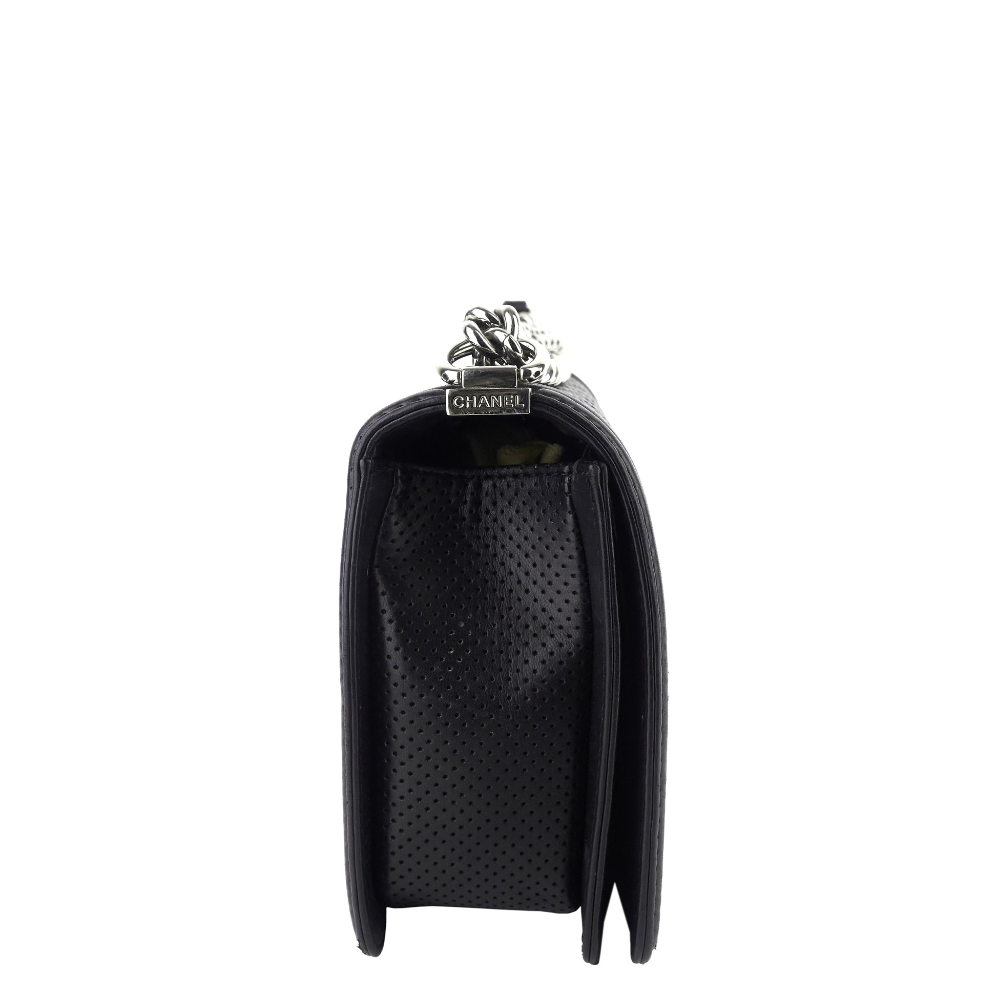 The boxy Boy Bag made its debut on Chanel's Fall/Winter 2011 runway with a clear target audience in mind: younger, first-time Chanel shoppers seeking a trendy and more masculine bag. The style boasts a quilted border with sleek lines, a chunky chain strap, and an instantly recognizable Double C clasp. Available in six sizes—Mini, Small, Medium (also known as Old Medium), New Medium, Large, and Extra Large—it offers options to suit various preferences. This specific bag has been skillfully made from lambskin leather that has been perforated.