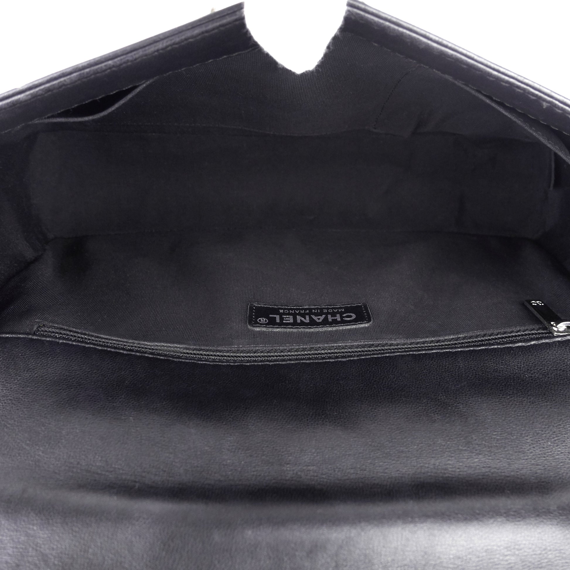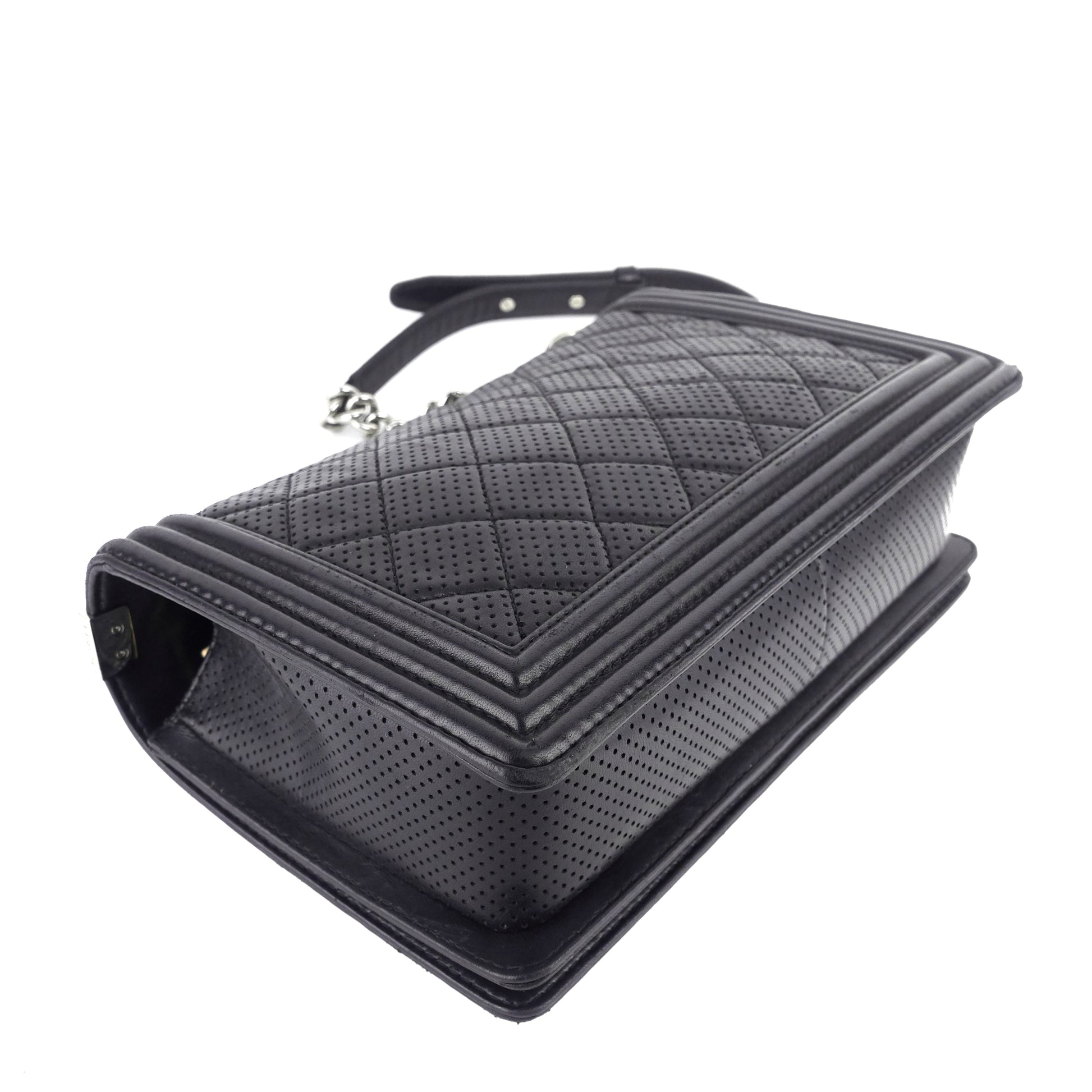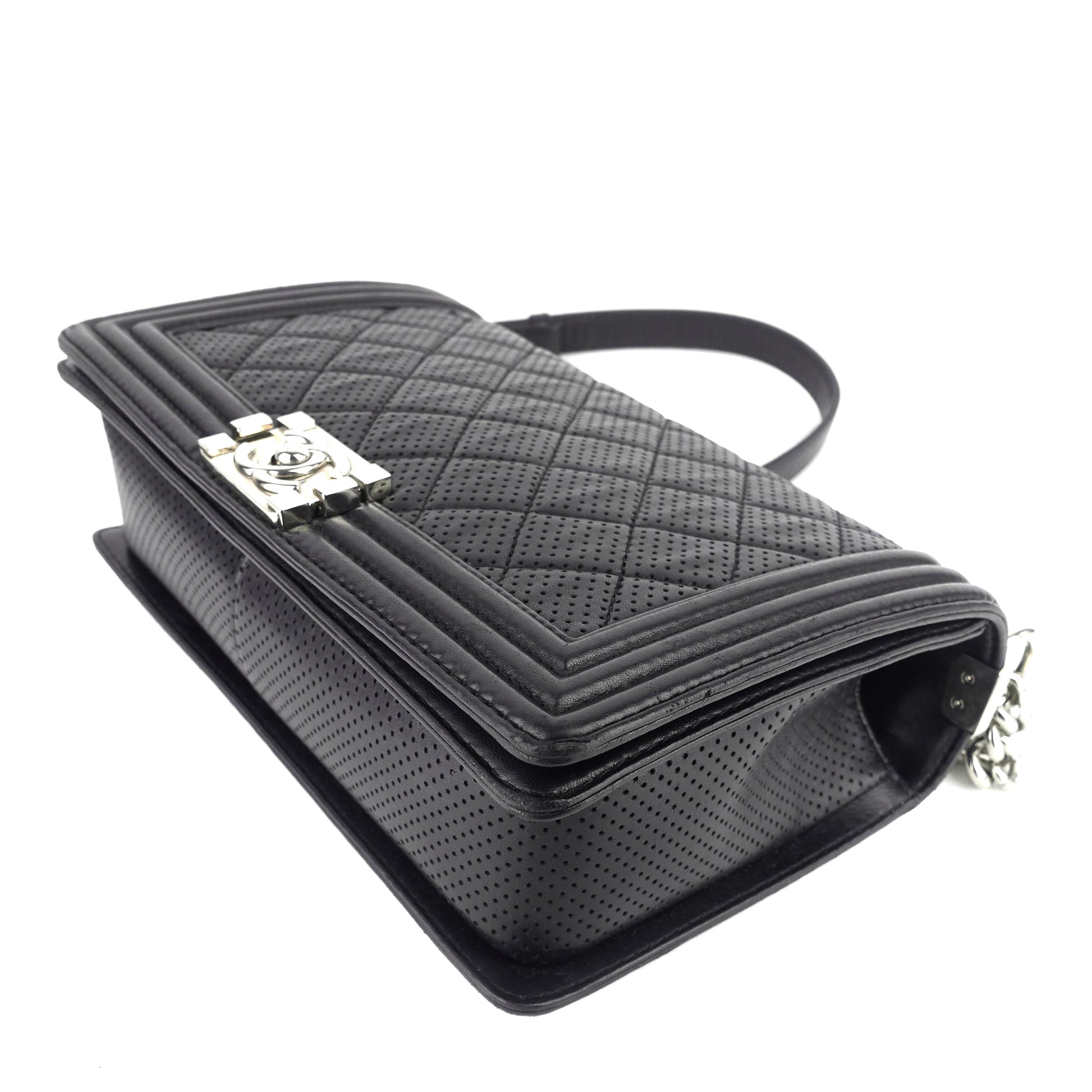 The boxy Boy Bag made its debut on Chanel's Fall/Winter 2011 runway with a clear target audience in mind: younger, first-time Chanel shoppers seeking a trendy and more masculine bag. The style boasts a quilted border with sleek lines, a chunky chain strap, and an instantly recognizable Double C clasp. Available in six sizes—Mini, Small, Medium (also known as Old Medium), New Medium, Large, and Extra Large—it offers options to suit various preferences. This specific bag has been skillfully made from lambskin leather that has been perforated.