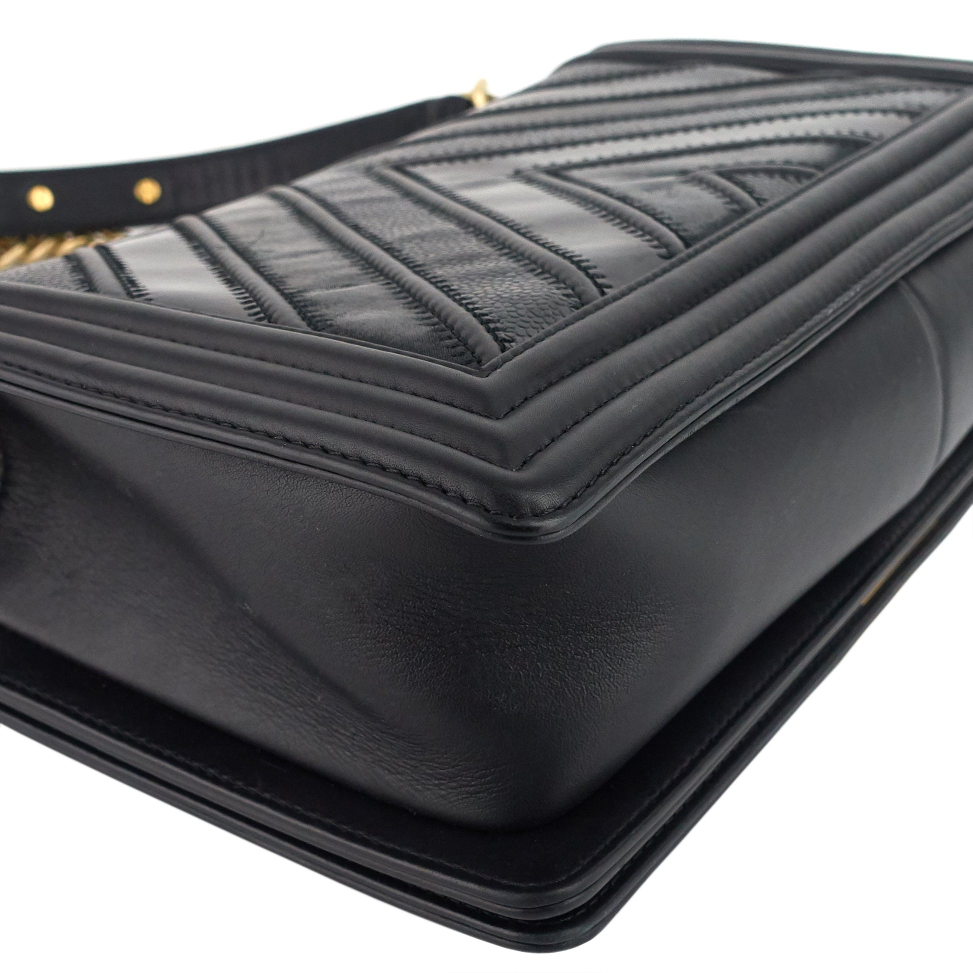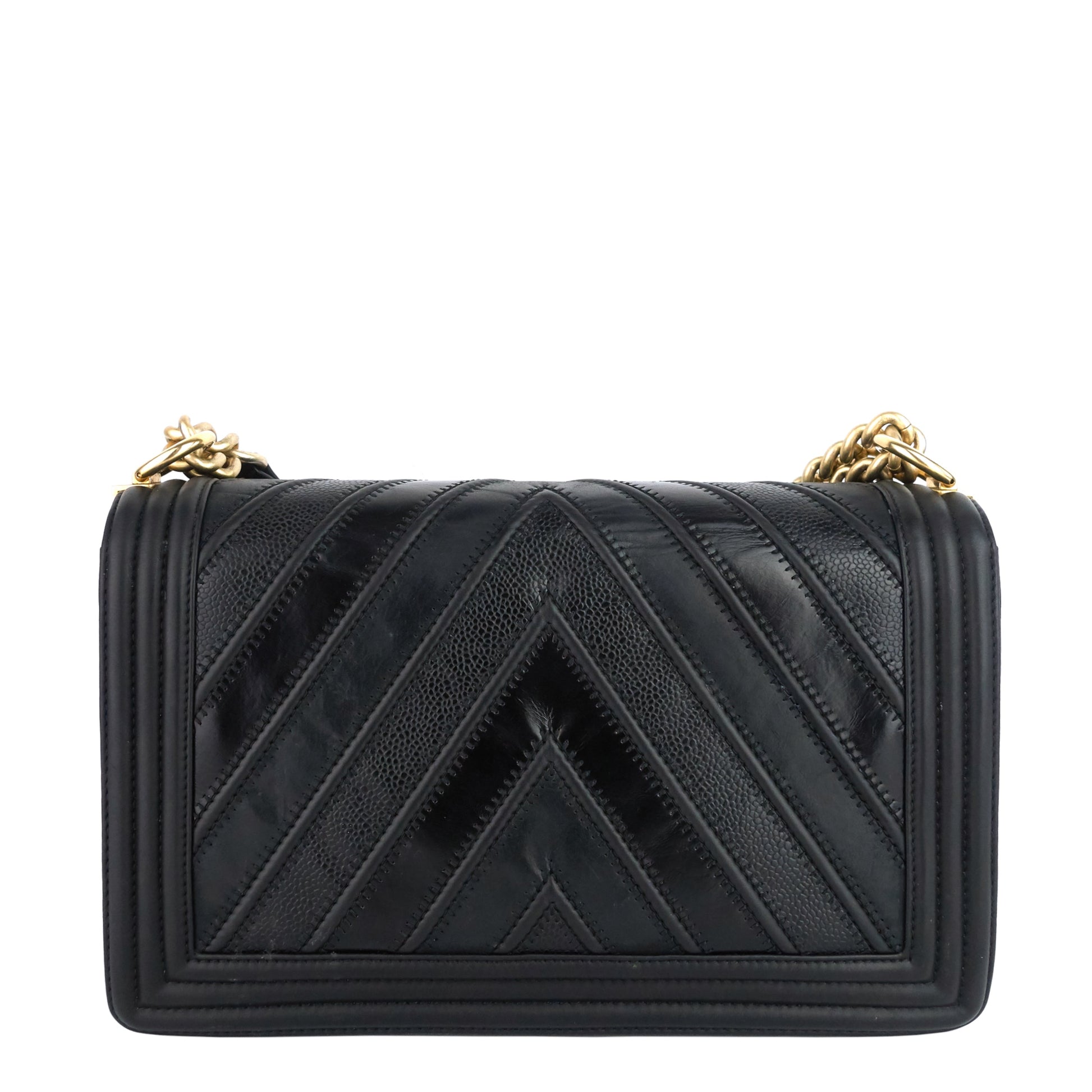 The boxy Boy Bag made its debut on Chanel's Fall/Winter 2011 runway with a clear target audience in mind: younger, first-time Chanel shoppers seeking a trendy and more masculine bag. The style boasts a quilted border with sleek lines, a chunky chain strap, and an instantly recognizable Double C clasp. Available in six sizes—Mini, Small, Medium (also known as Old Medium), New Medium, Large, and Extra Large—it offers options to suit various preferences. This particular bag is a unique blend of three types of leather—smooth calfskin, suede calfskin, and grained calfskin.