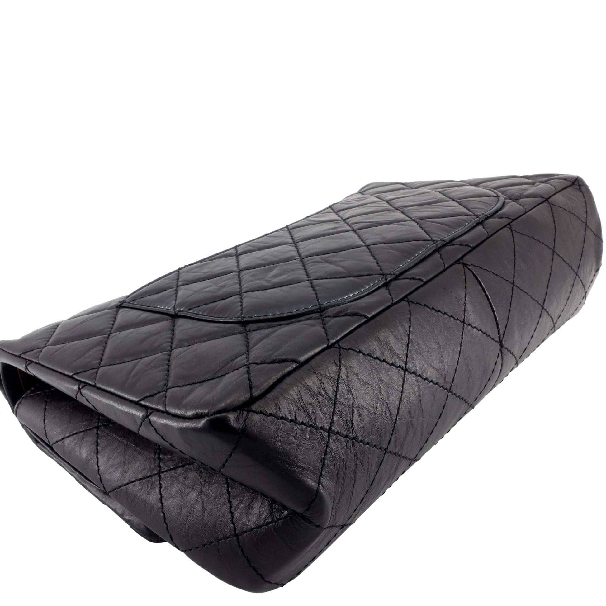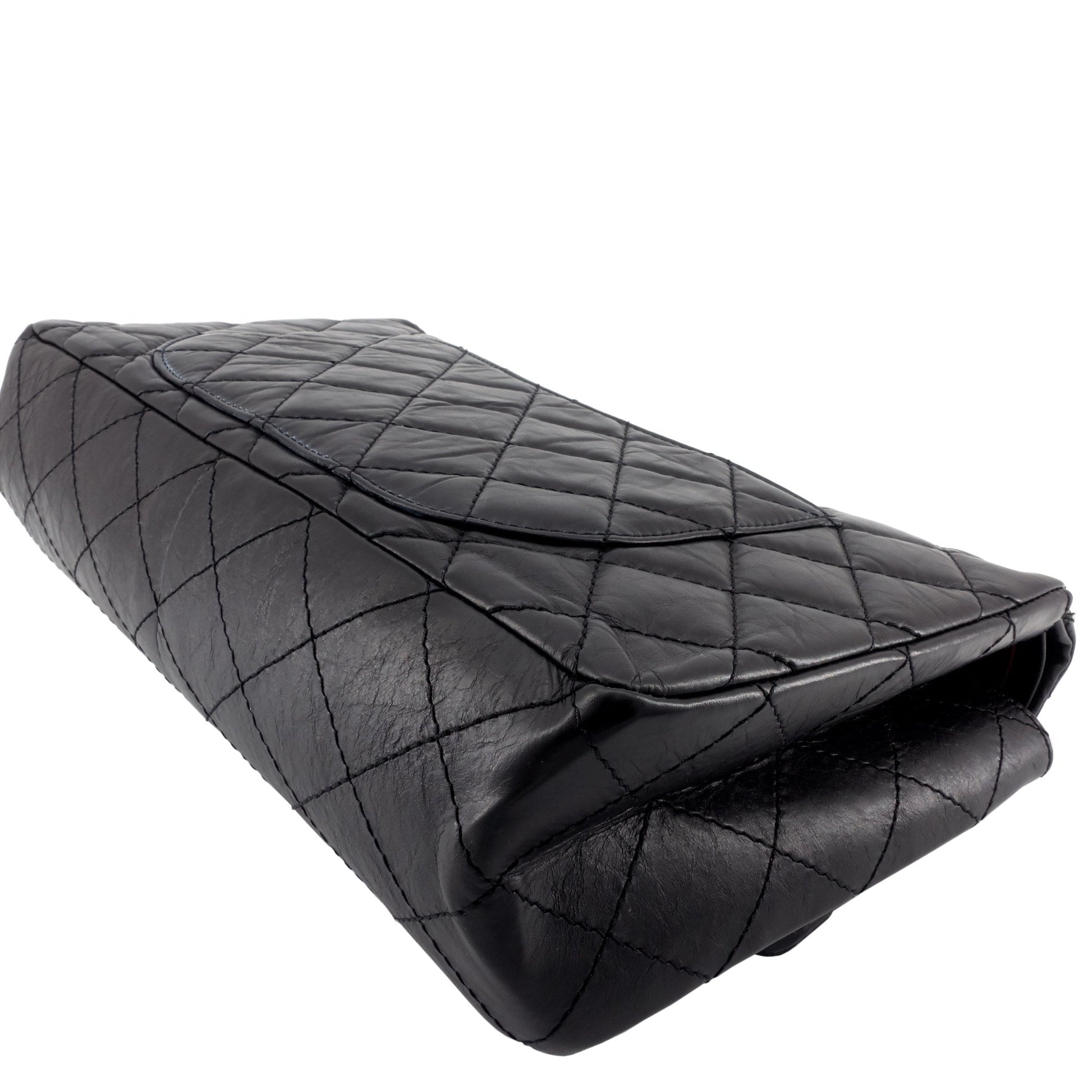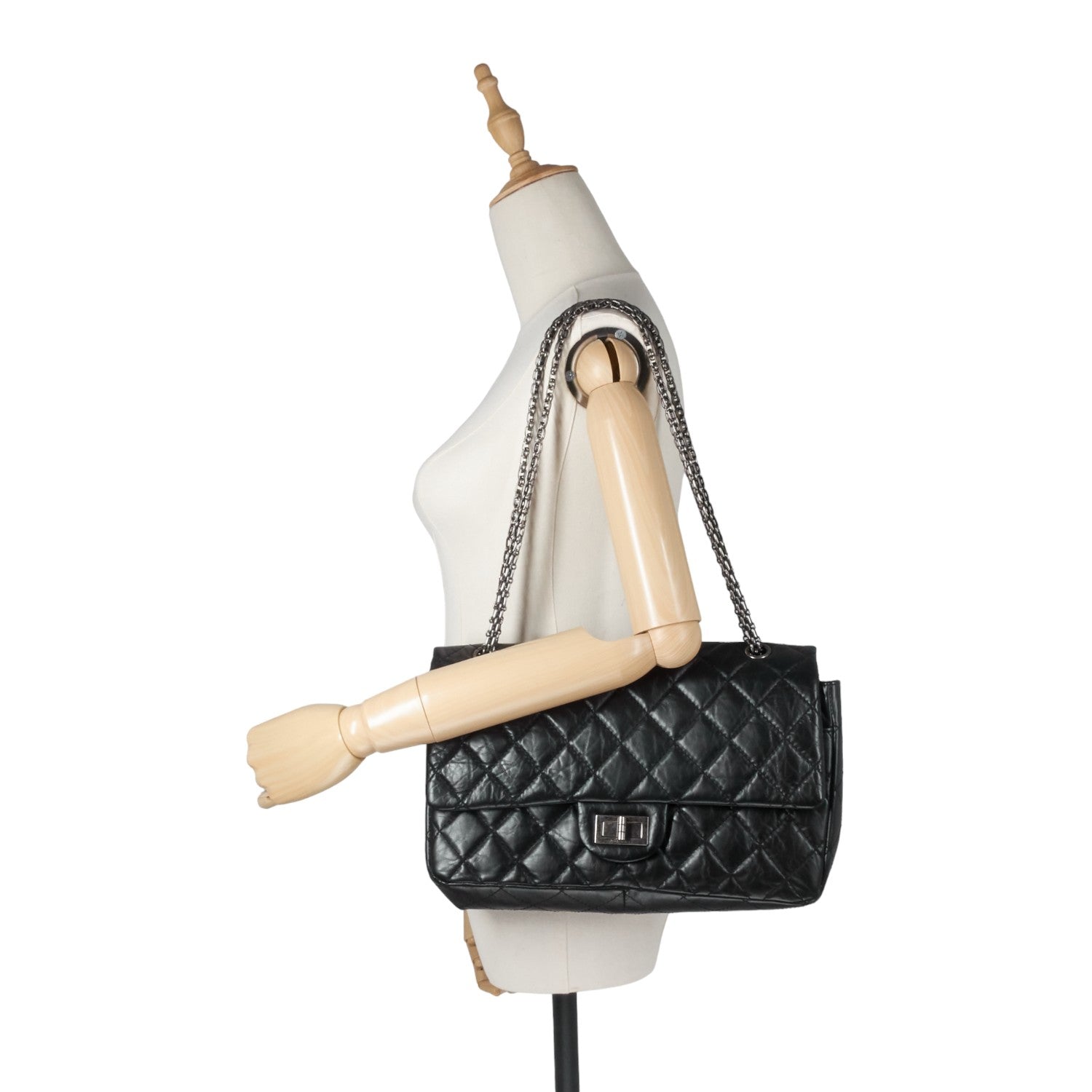 A Chanel Double Flap Bag in aged leather. The Flap Bag has a storied history: it was first debuted by Gabrielle “Coco” Chanel in the '50s and then later re-envisioned by Karl Lagerfeld in the '80s. In 2005, Lagerfeld rereleased Coco's original 2.55 design as the Reissue (2.55 refers to the month and year—February 1955—of Coco's original design).