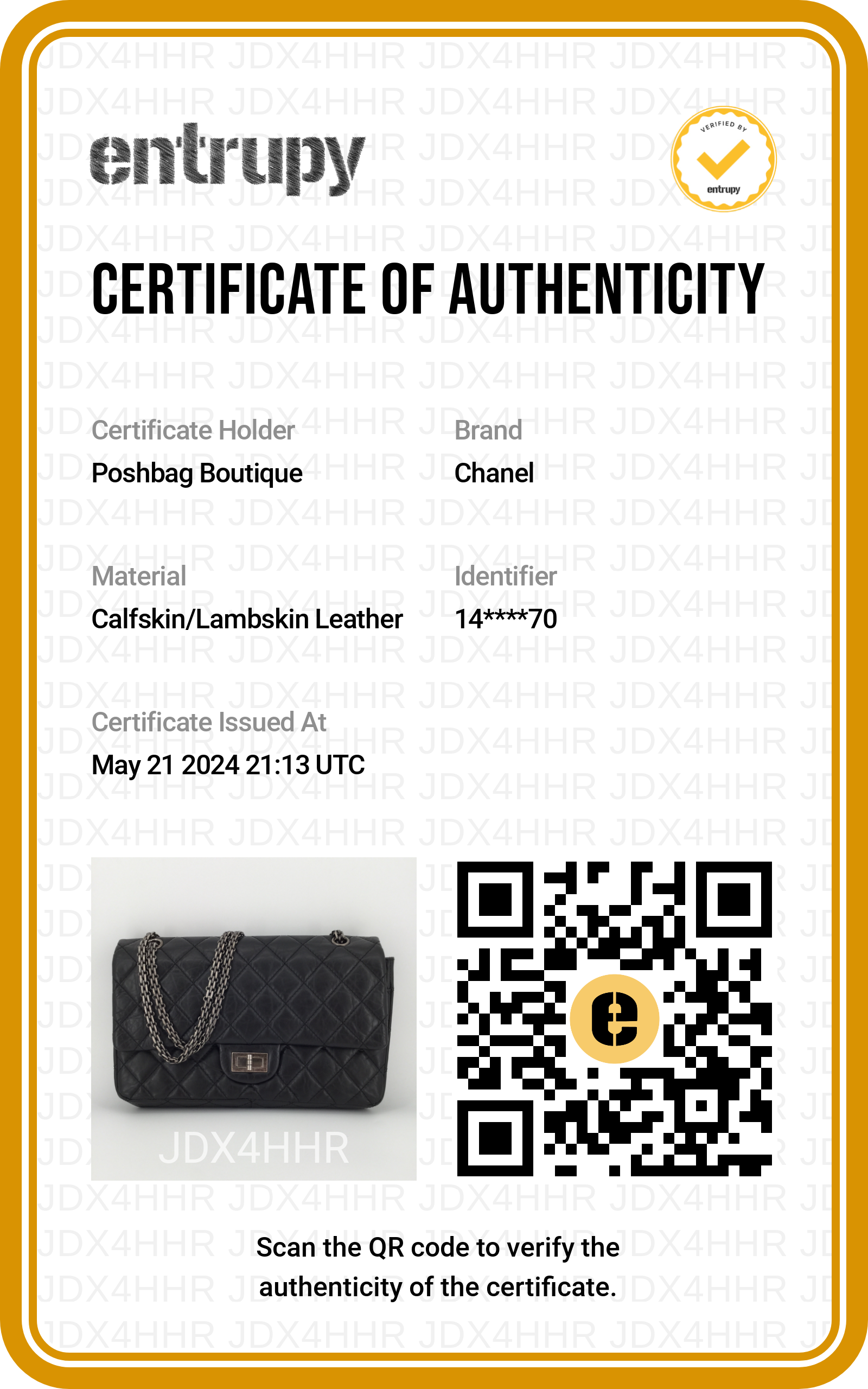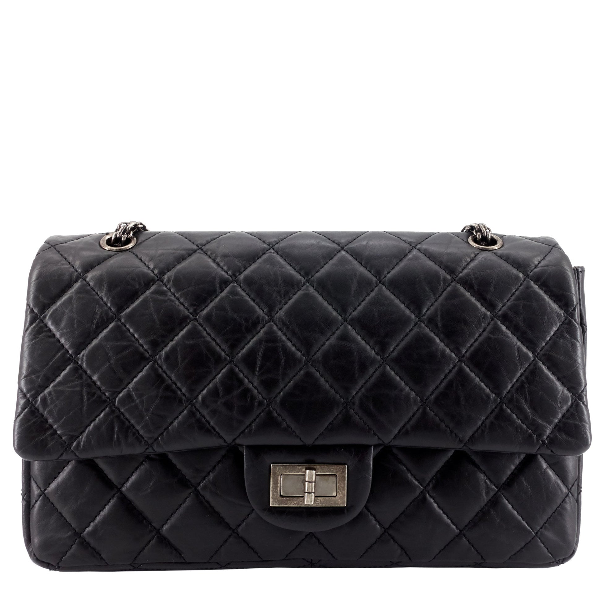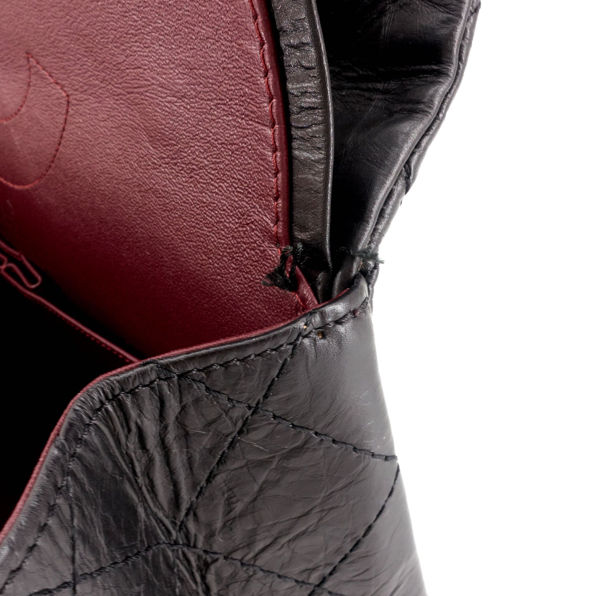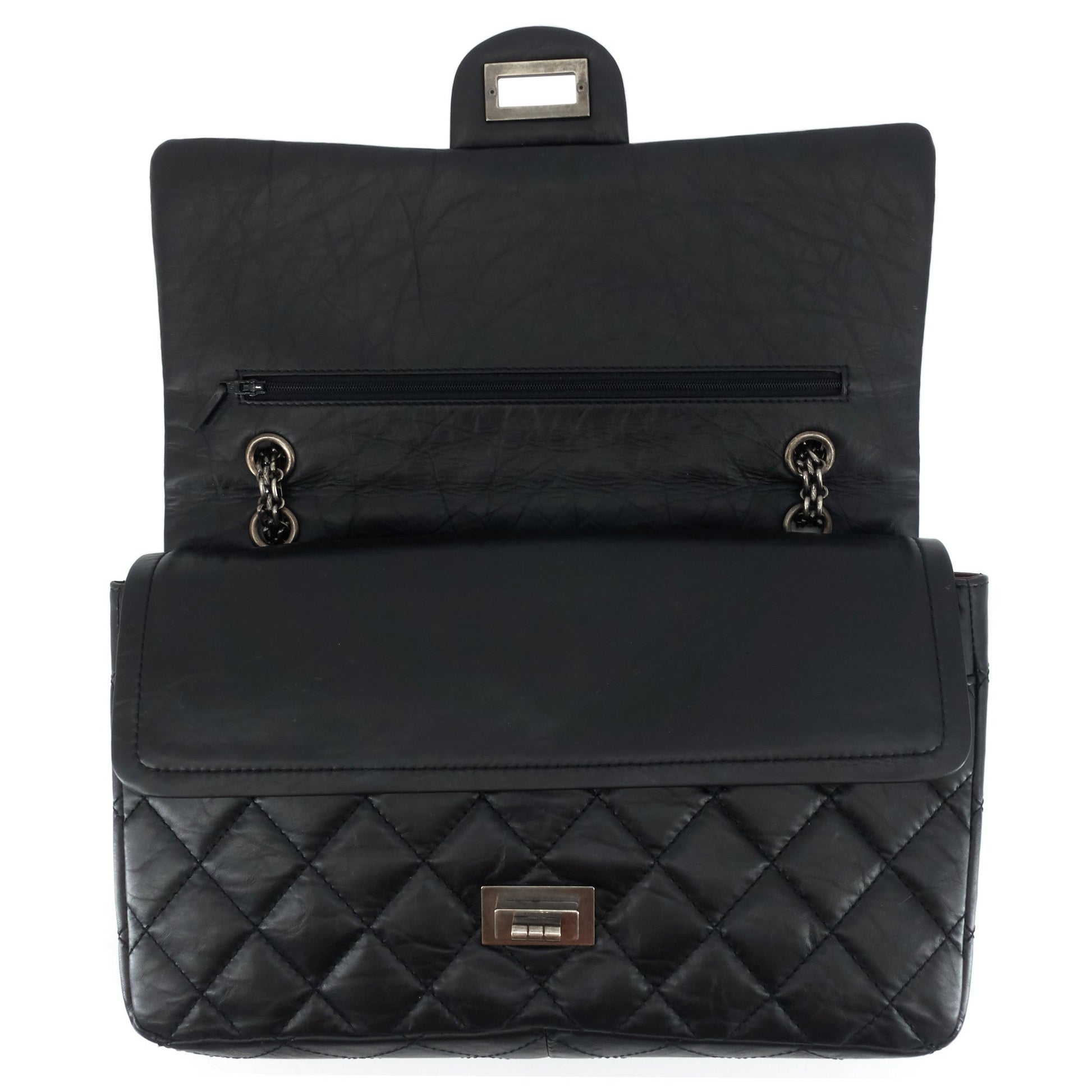 A Chanel Double Flap Bag in aged leather. The Flap Bag has a storied history: it was first debuted by Gabrielle “Coco” Chanel in the '50s and then later re-envisioned by Karl Lagerfeld in the '80s. In 2005, Lagerfeld rereleased Coco's original 2.55 design as the Reissue (2.55 refers to the month and year—February 1955—of Coco's original design).