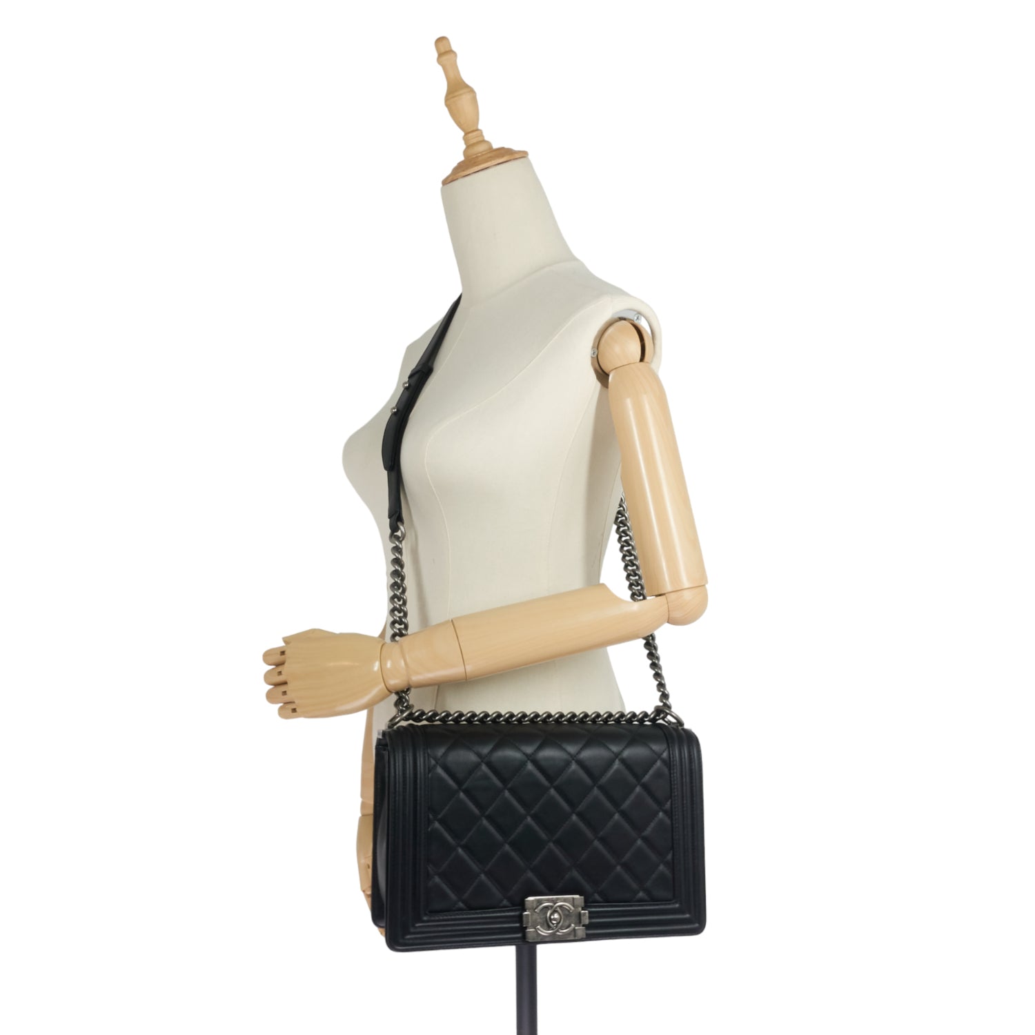 The boxy Boy Bag made its debut on Chanel's Fall/Winter 2011 runway with a clear target audience in mind: younger, first-time Chanel shoppers seeking a trendy and more masculine bag. The style boasts a quilted border with sleek lines, a chunky chain strap, and an instantly recognizable Double C clasp. Available in six sizes—Mini, Small, Medium (also known as Old Medium), New Medium, Large, and Extra Large—it offers options to suit various preferences.