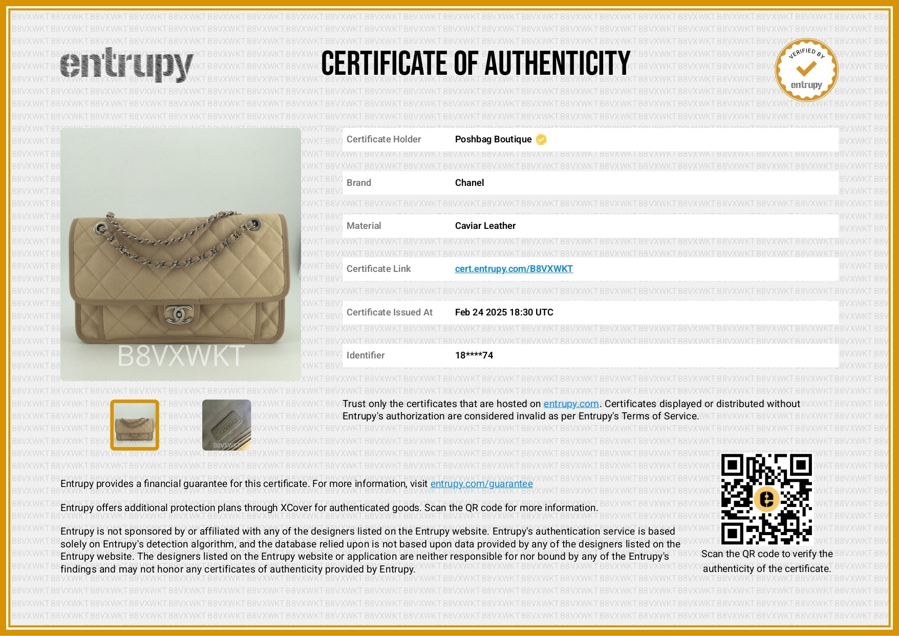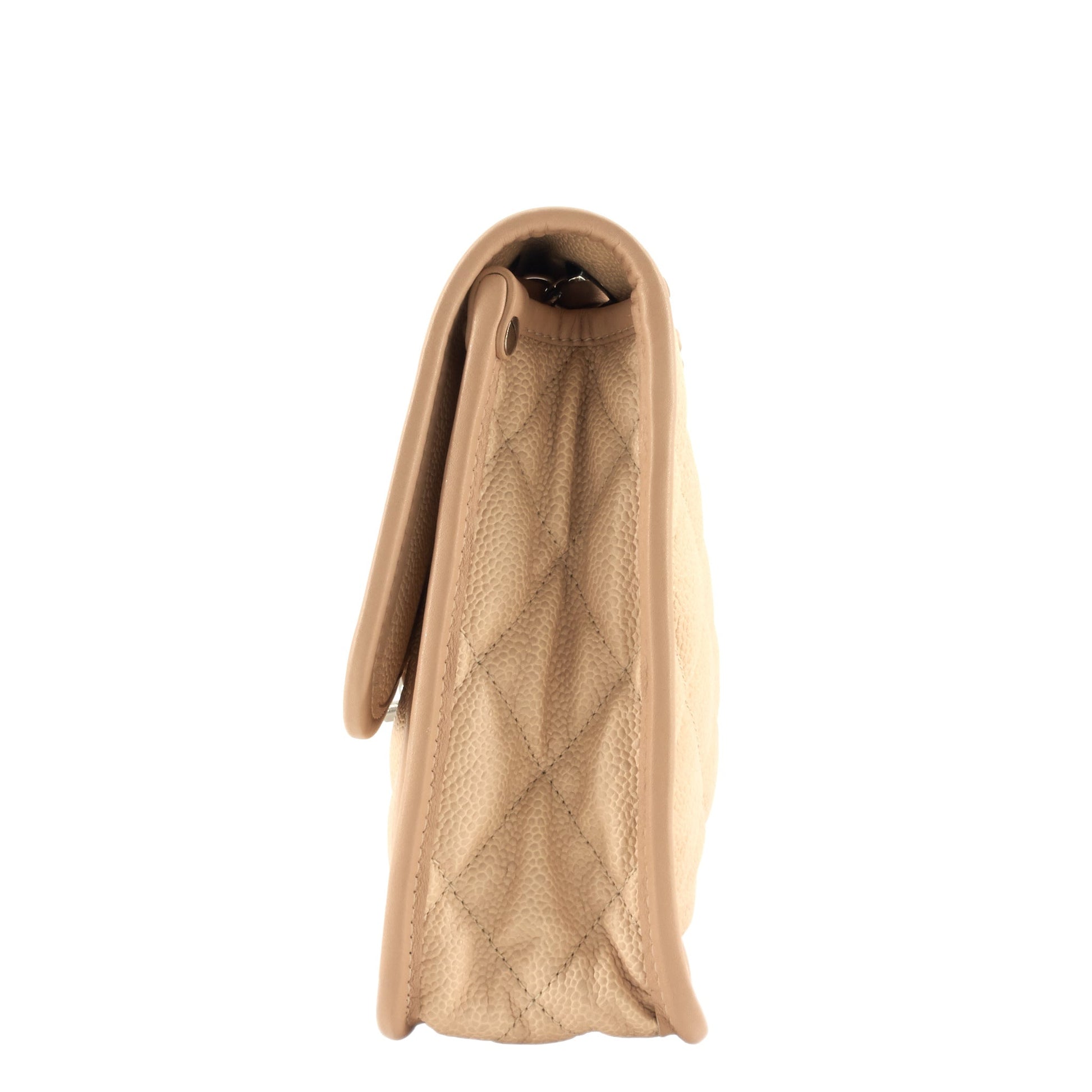 A Chanel Flap Bag in caviar leather. The Flap Bag has a storied history: it was first debuted by Gabrielle “Coco” Chanel in the '50s and then later re-envisioned by Karl Lagerfeld in the '80s.