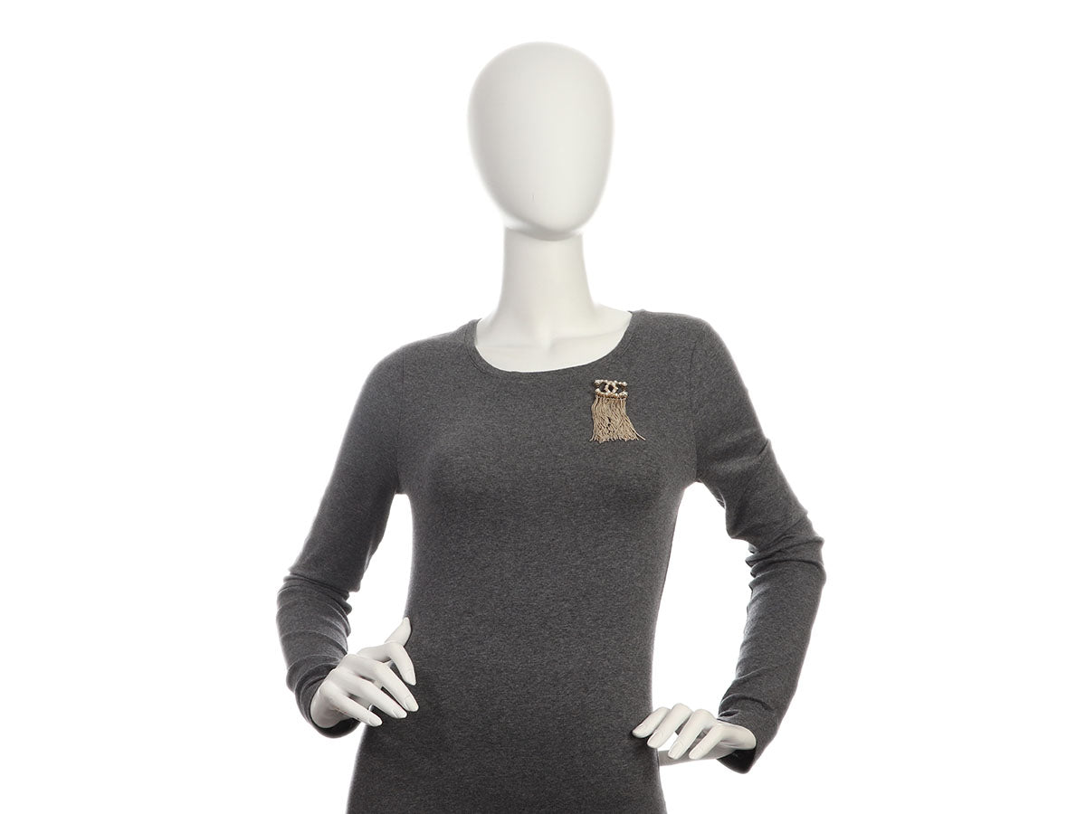 Chanel’s Pearl CC Chain Fringe Brooch is a dazzling accent that moves with you! This costume piece features a gold-tone CC logo studded with round and star-shaped faux pearls above a swinging fringe of fine chains. Brand new with a box, this charming pin sports a lot of Chanel sparkle!