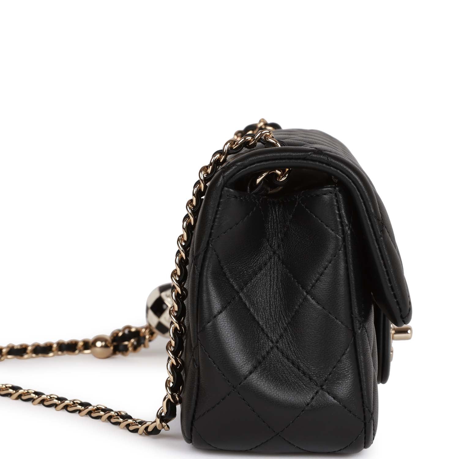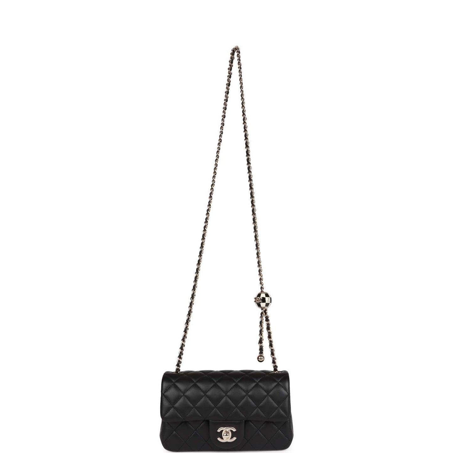 This Pearl Crush Mini Rectangular flap bag is of black lambskin with light gold tone hardware and has a front flap with signature CC turnlock closure, rear half moon pocket, single interwoven black leather and light gold tone chain link shoulder/crossbody strap with adjustable "pearl" ball.