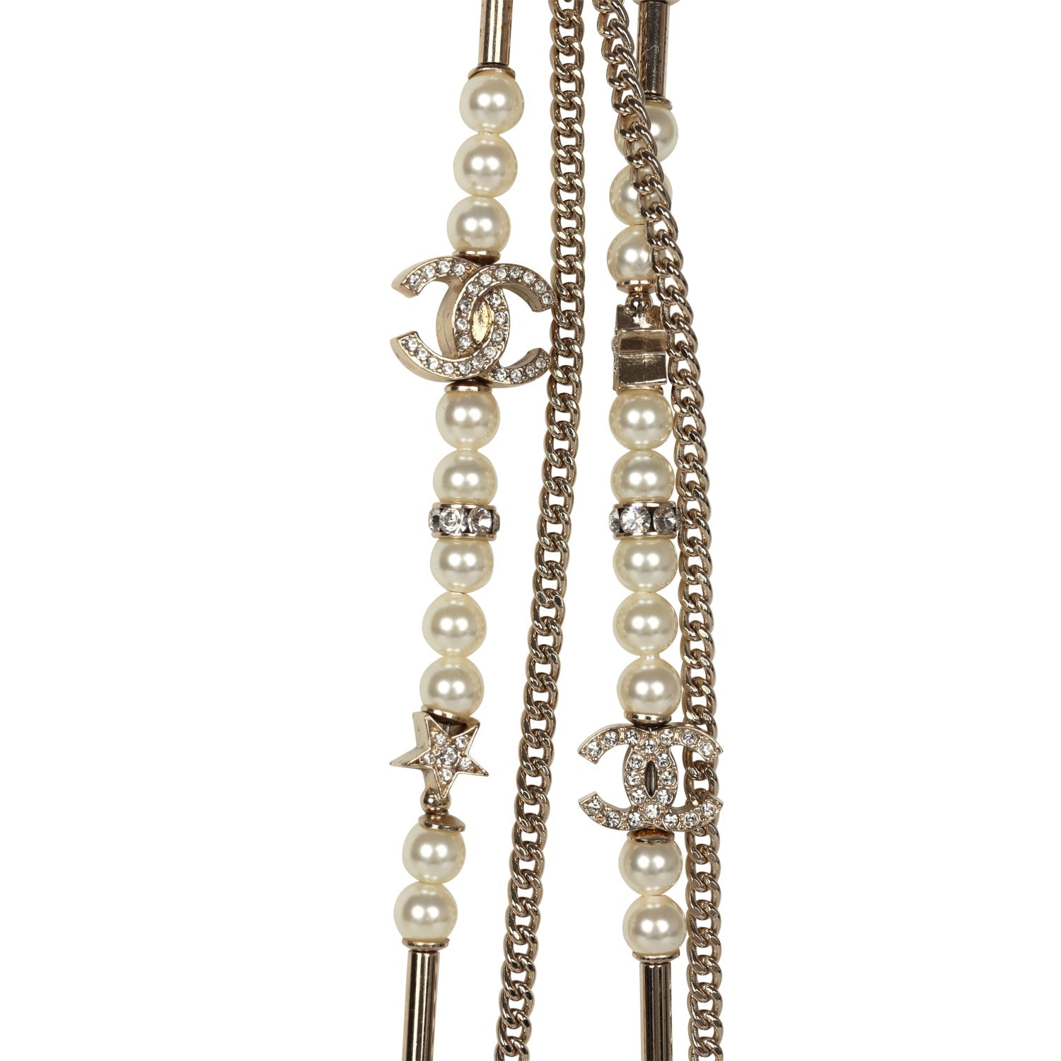 This Chanel flap bag pendant necklace is made of pearls with light gold tone hardware and features a front flap with signature CC magnetic closure, and a light gold tone chain link with pearl, CC pendants, and star pendants.