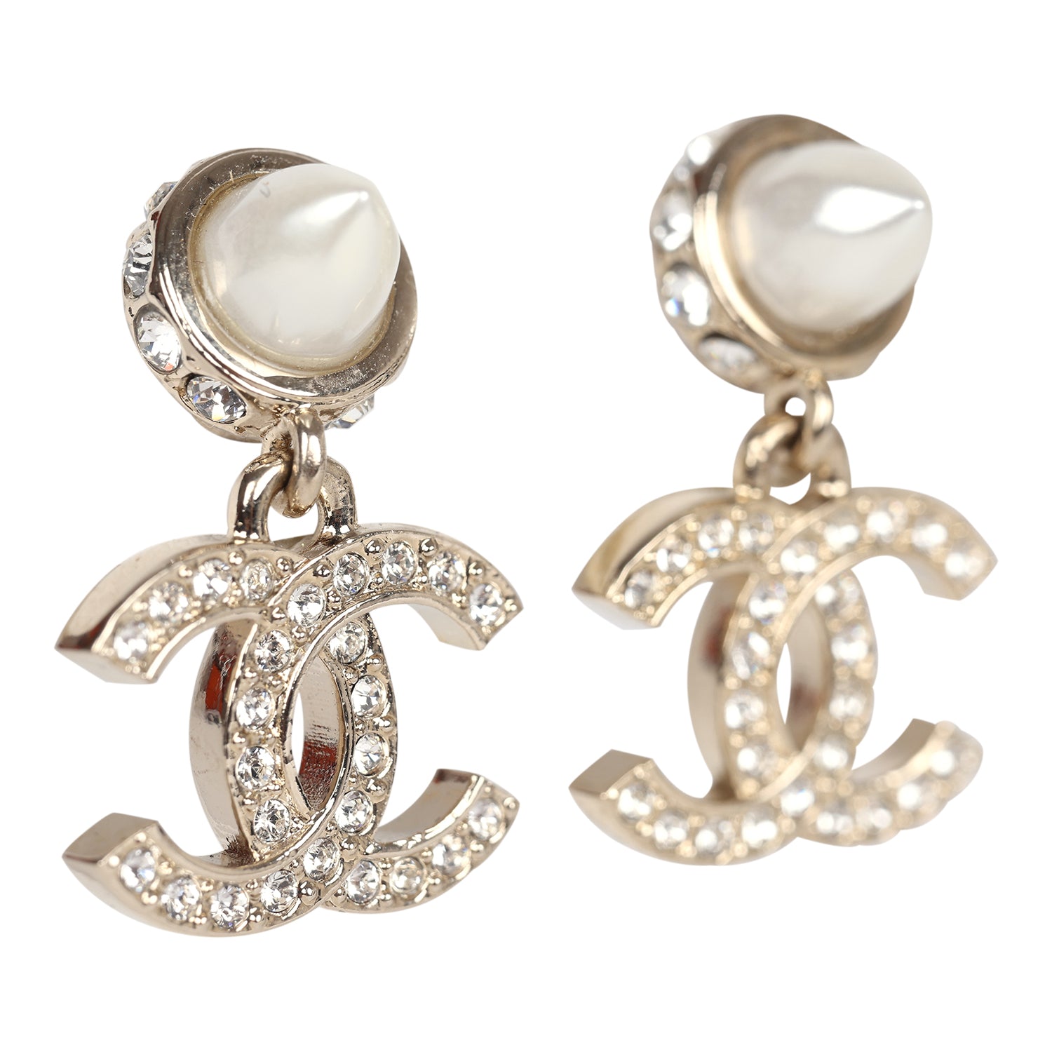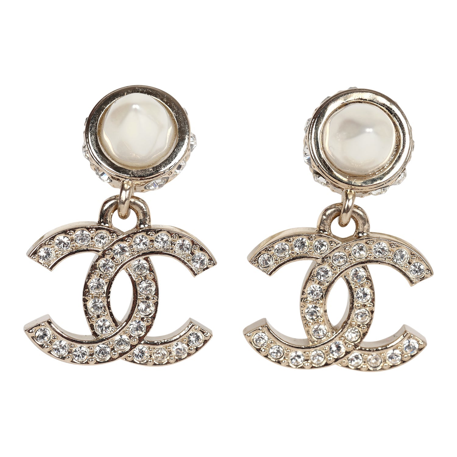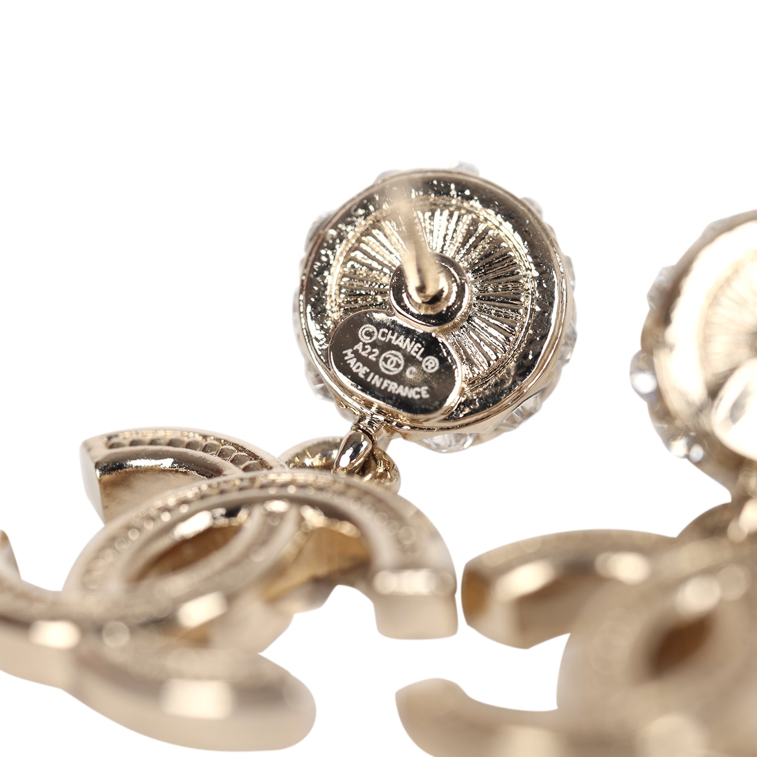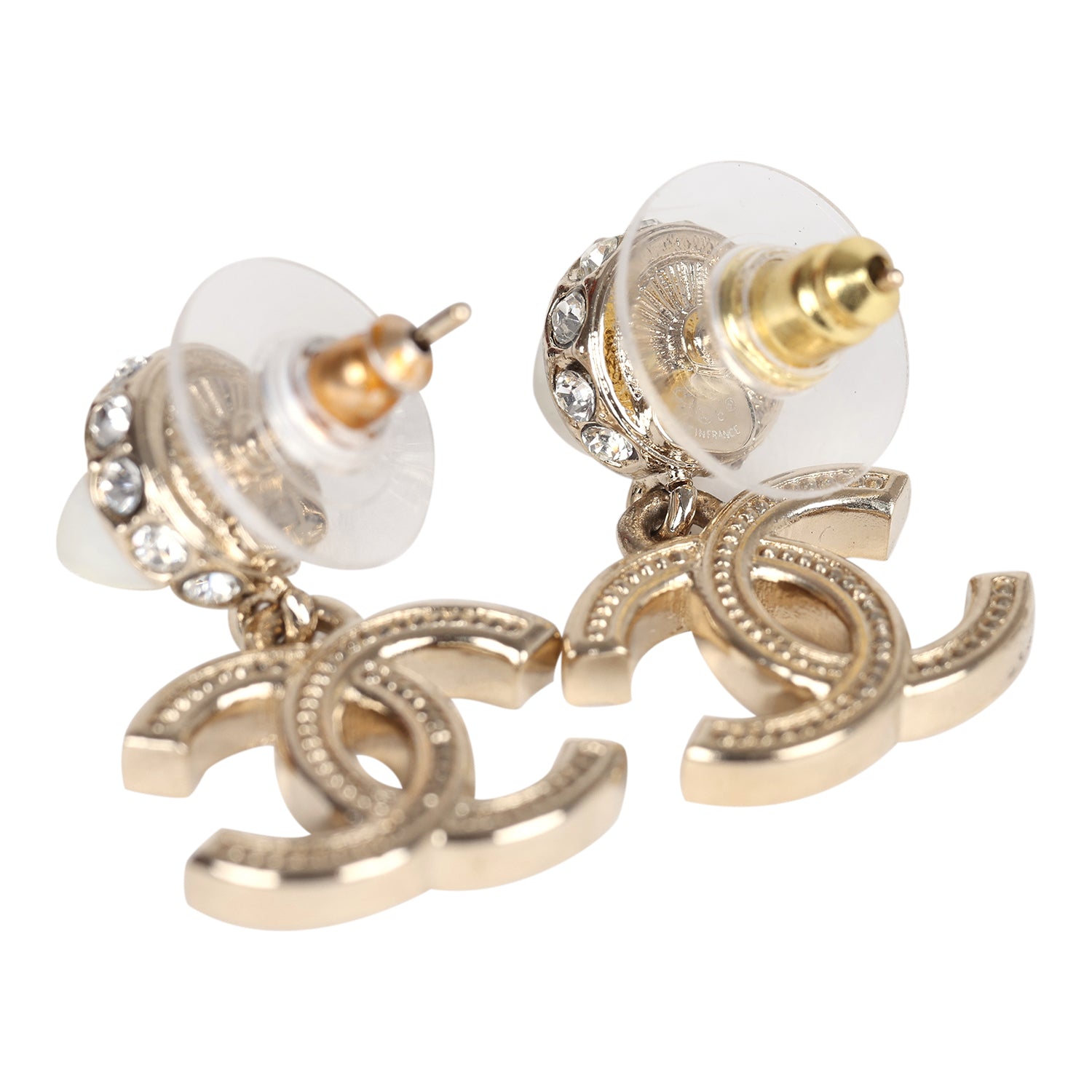 Chanel Pearl Spike CC Crystal Dangle Earrings Light Gold Hardware