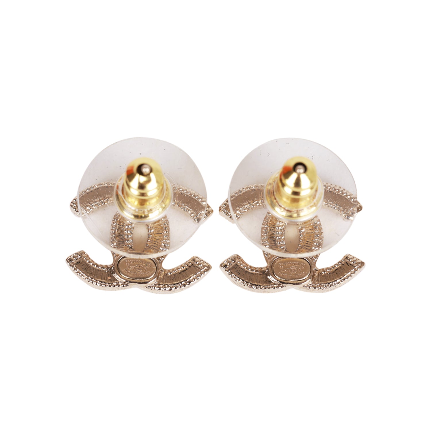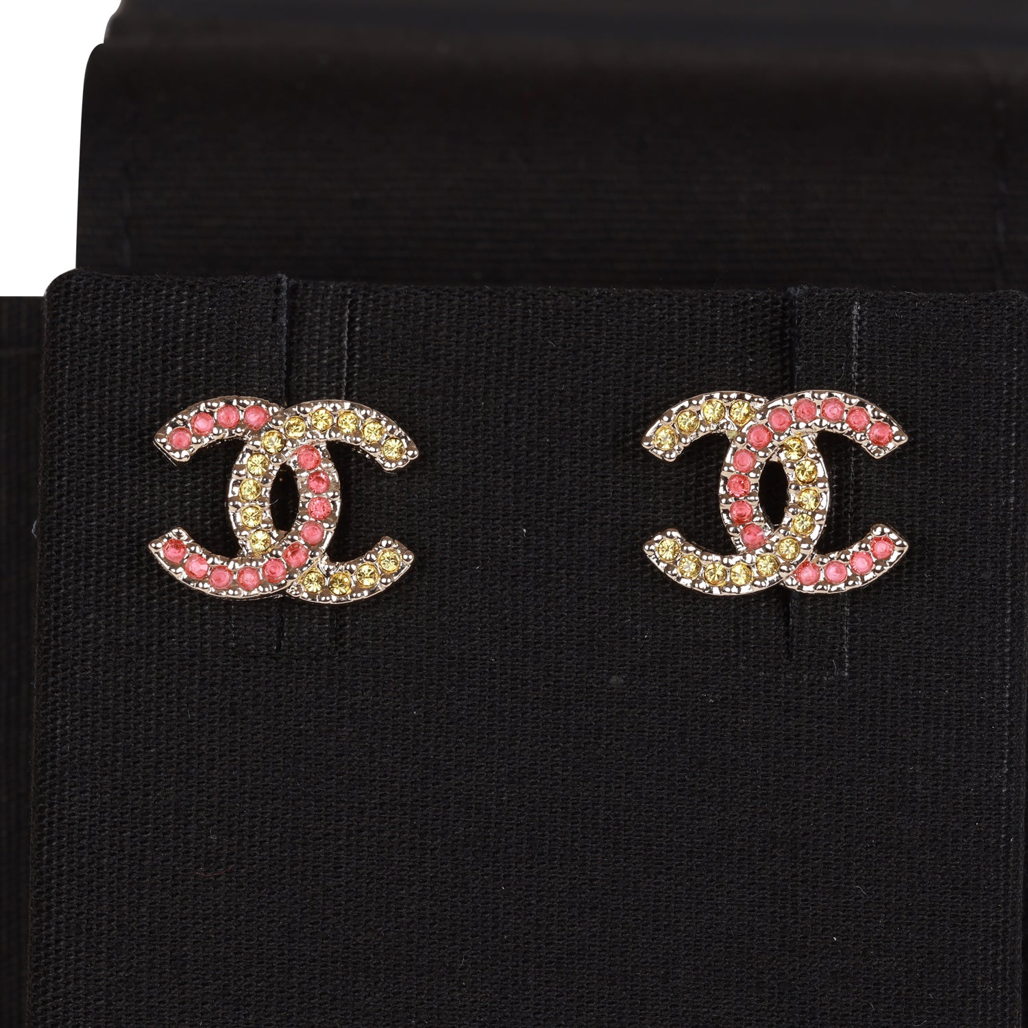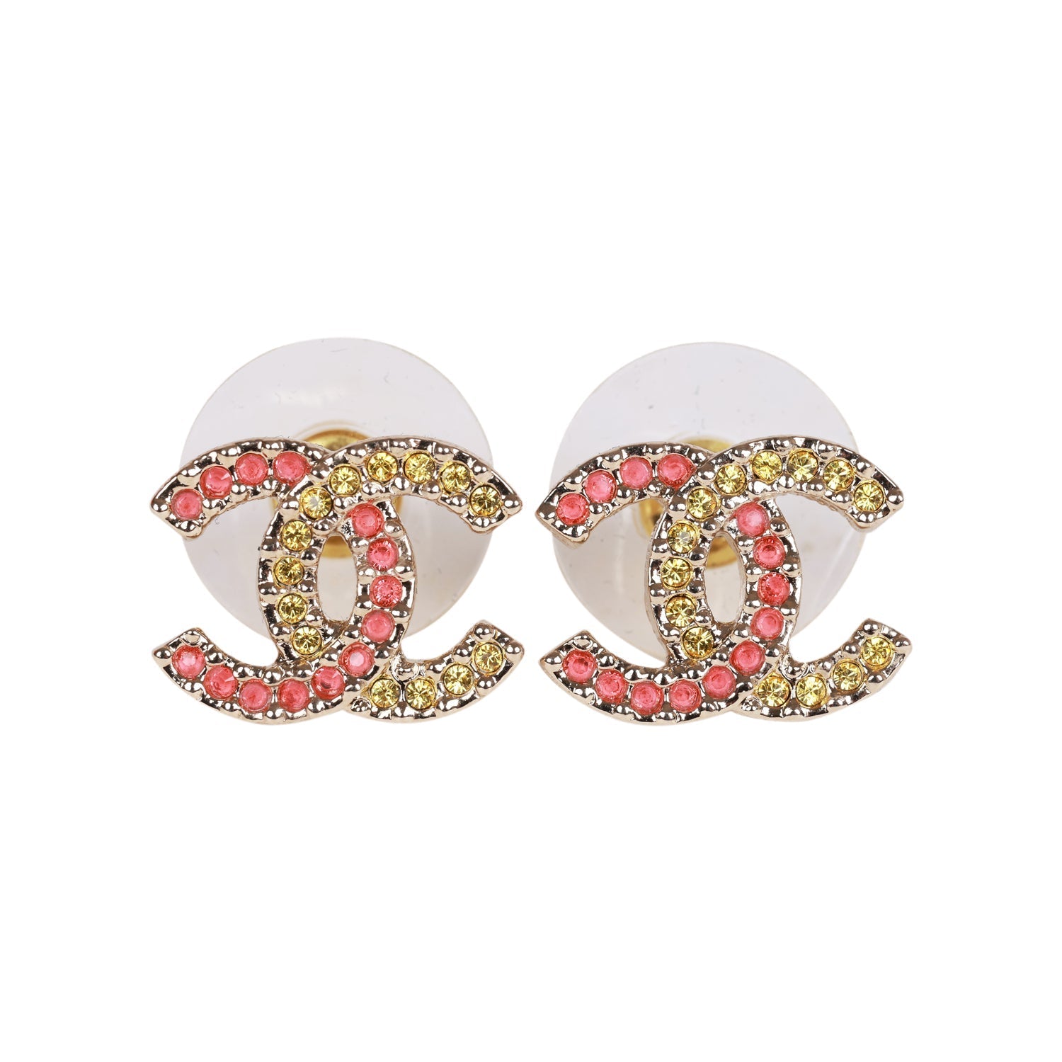 These CC logo earrings are in gold tone metal with pink and gold crystals.