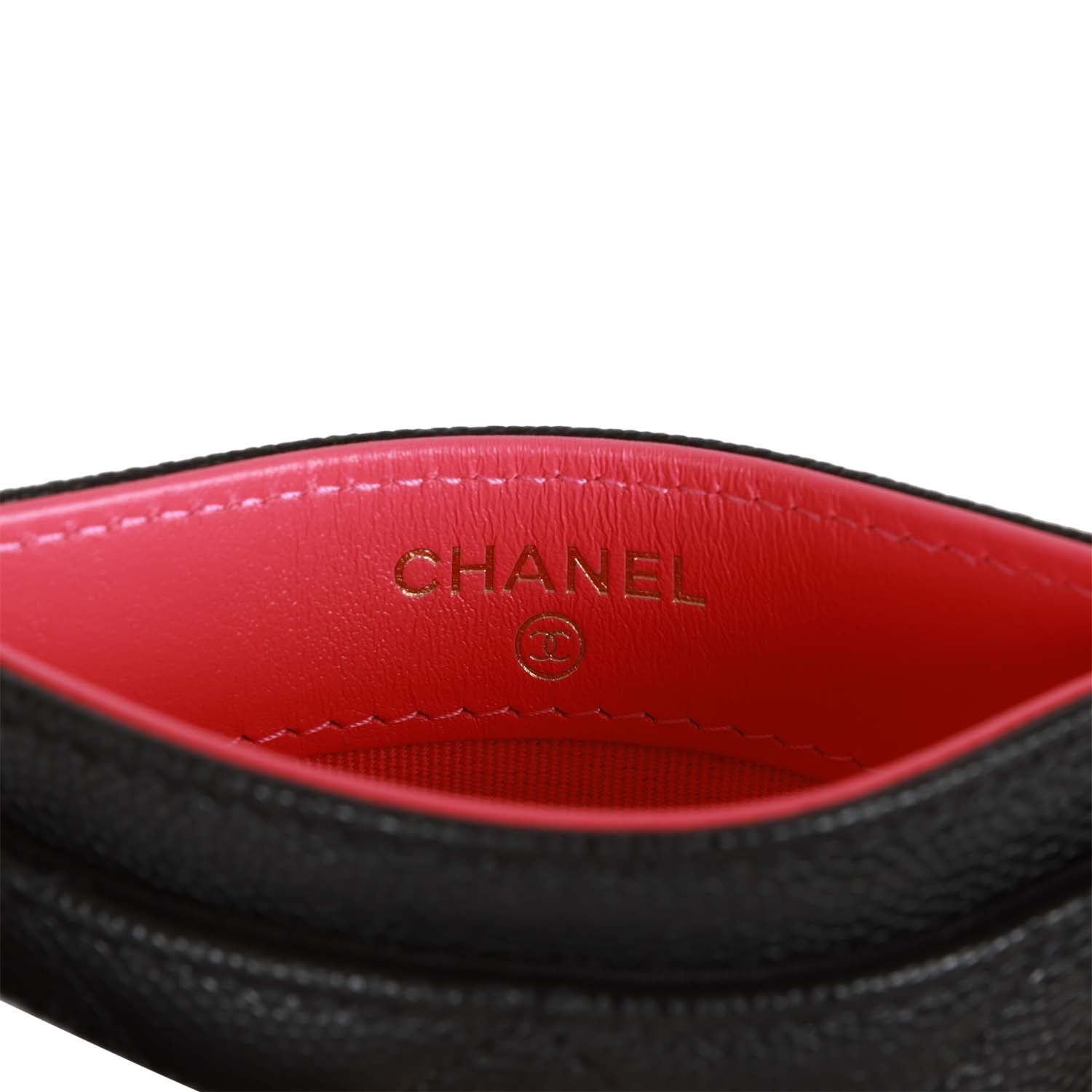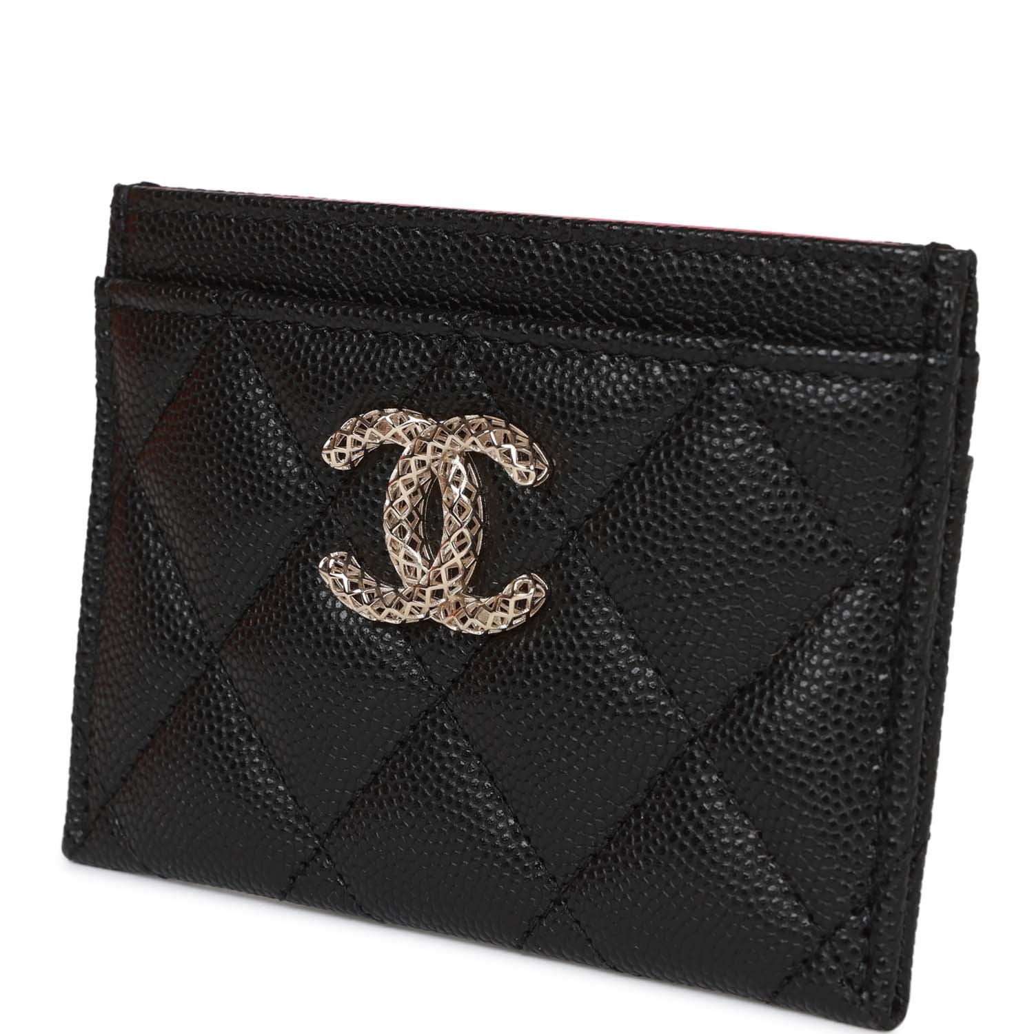 This Chanel cardholder is in black caviar leather with light gold hardware and features a wire CC logo, pink leather interior, and four card slots.