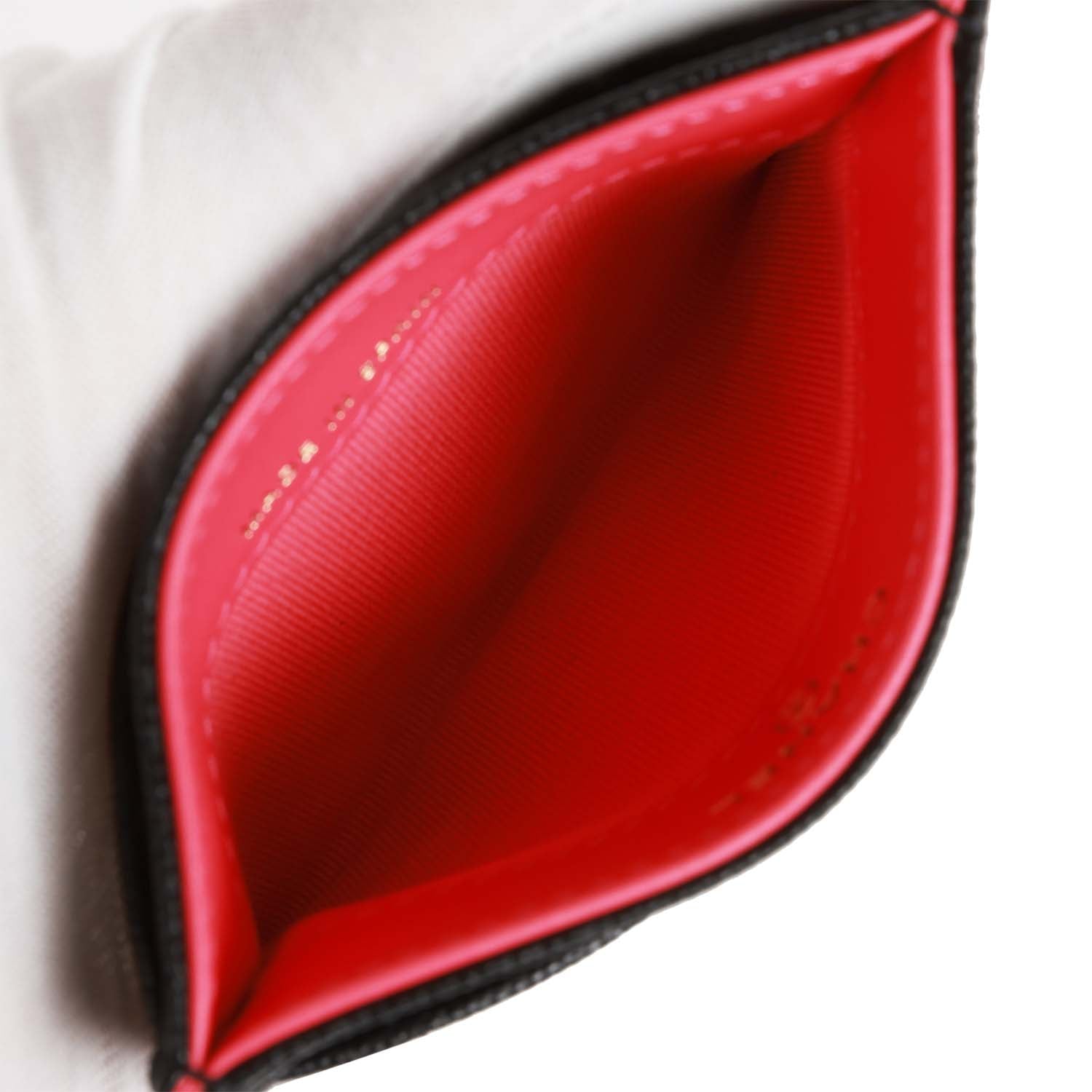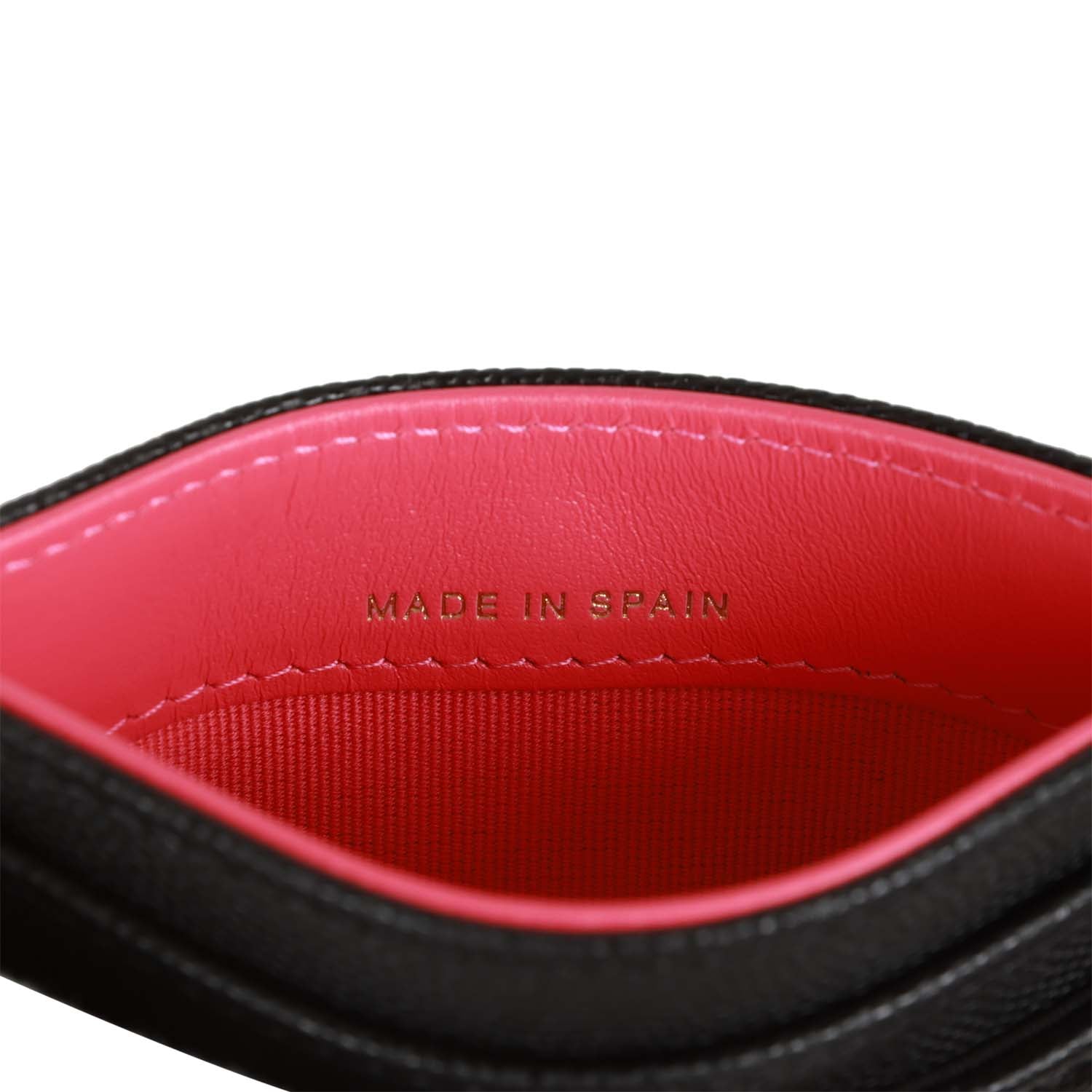 The interior is lined in pink leather. It has a 4 card holders one in front, middle, and 2 on the back.