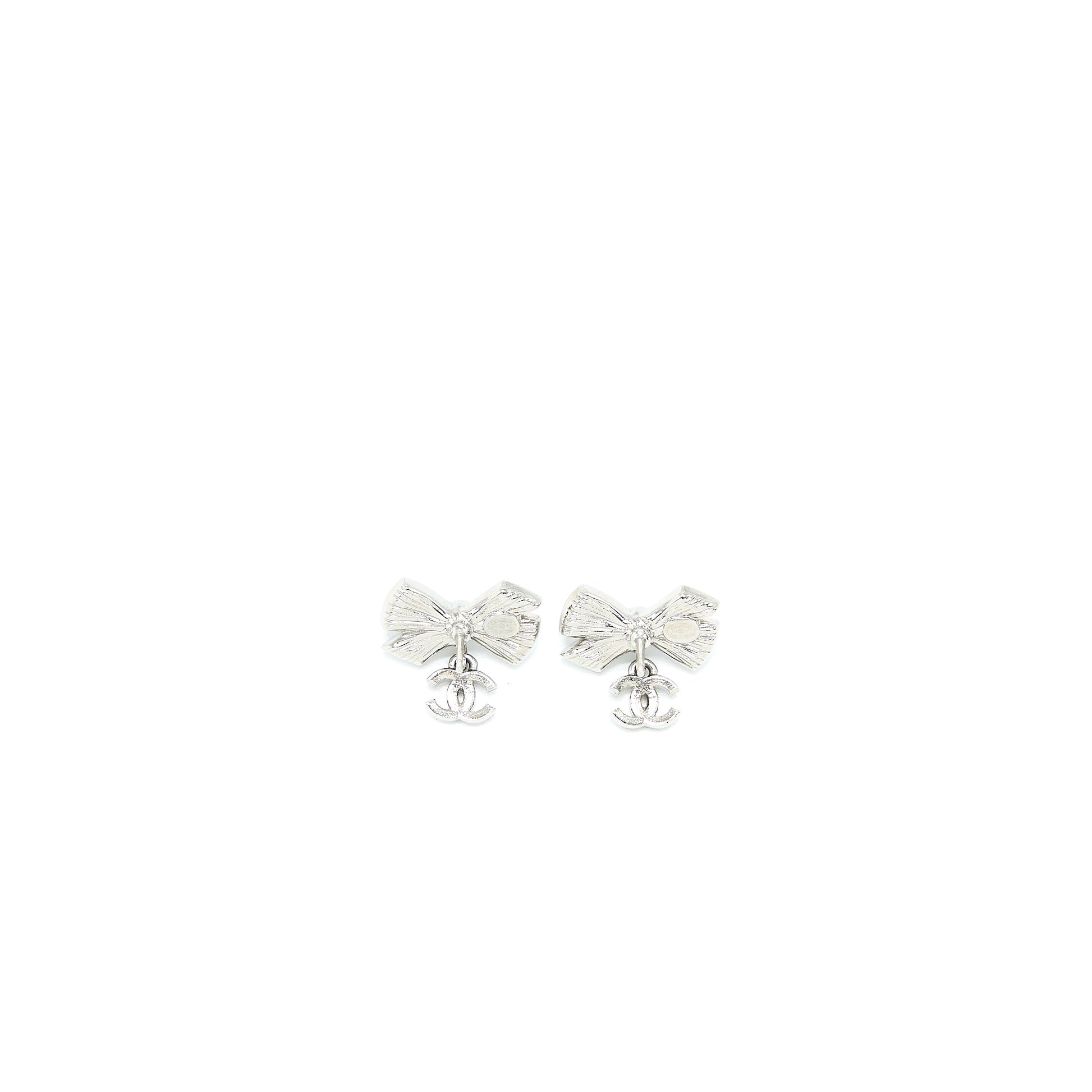 Chanel Ribbon with CC Drop Earrings Pearl/Crystal Silver Tone