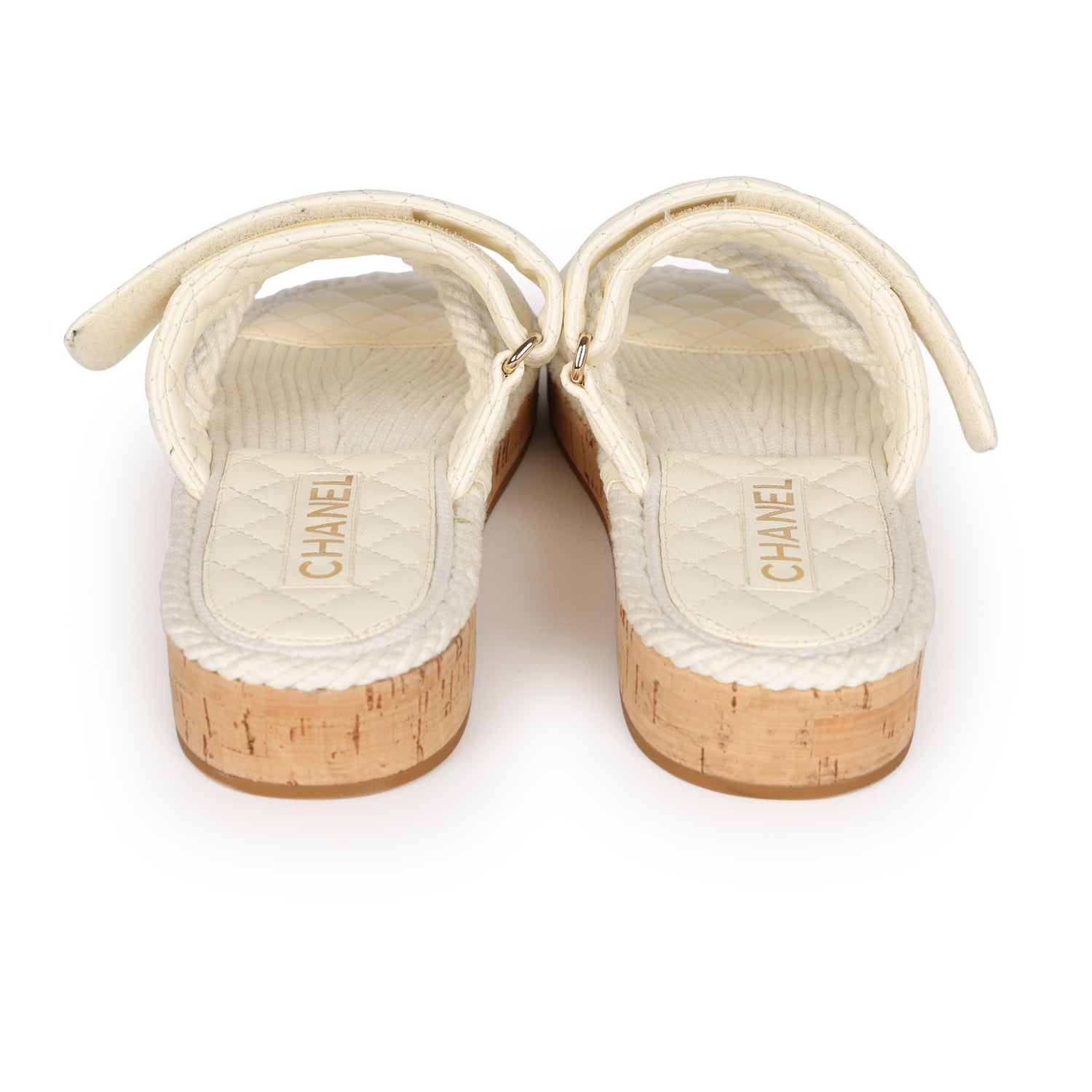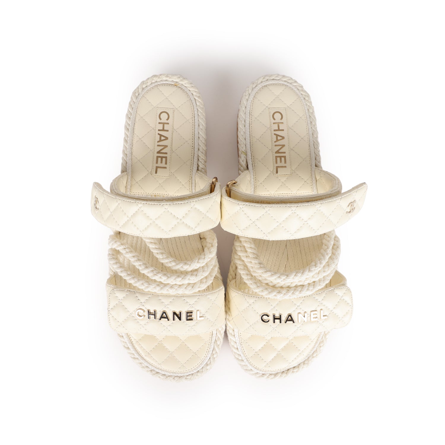These White Chanel Rope Sandals are made of white rope with white quilted leather detail on the insole and upper straps, gold Chanel lettering across front toe strap, and an adjustable strap with gold CC.