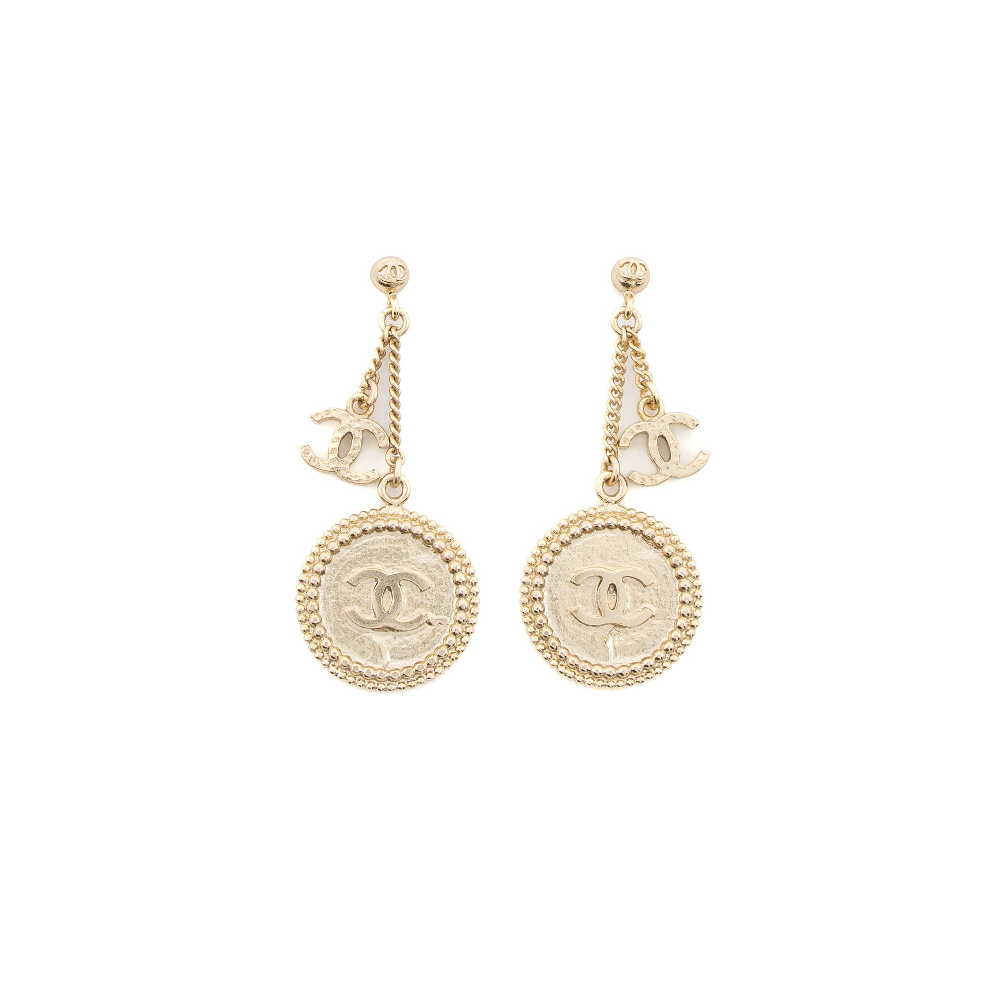 Chanel Round CC Logo Drop Earrings Gold Tone