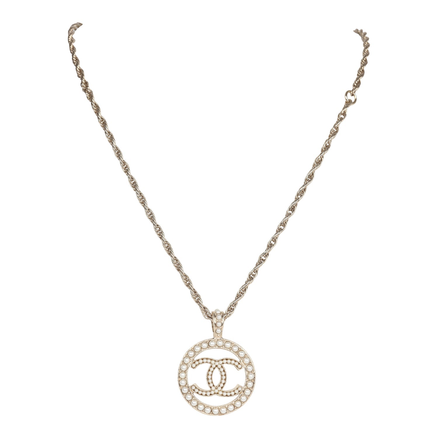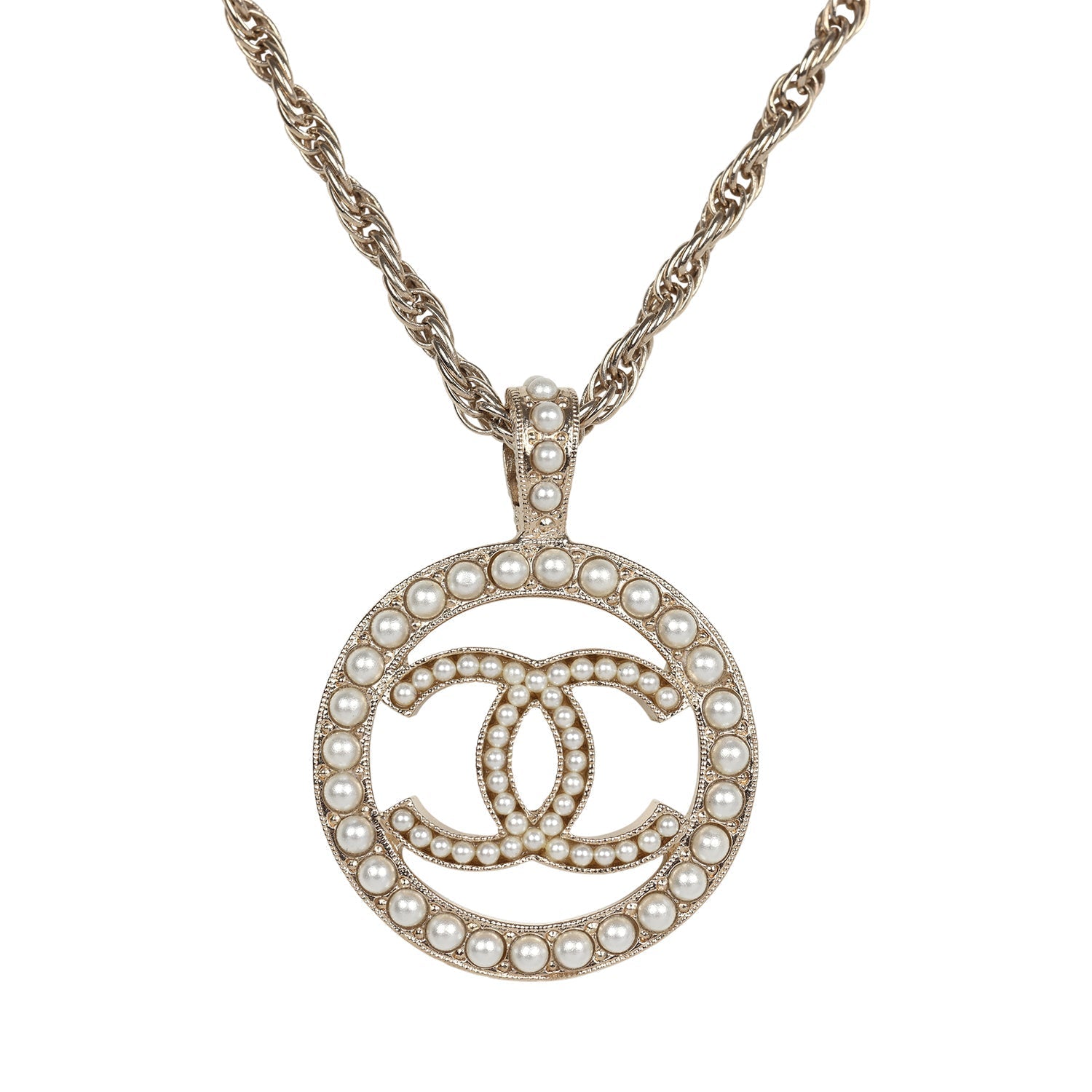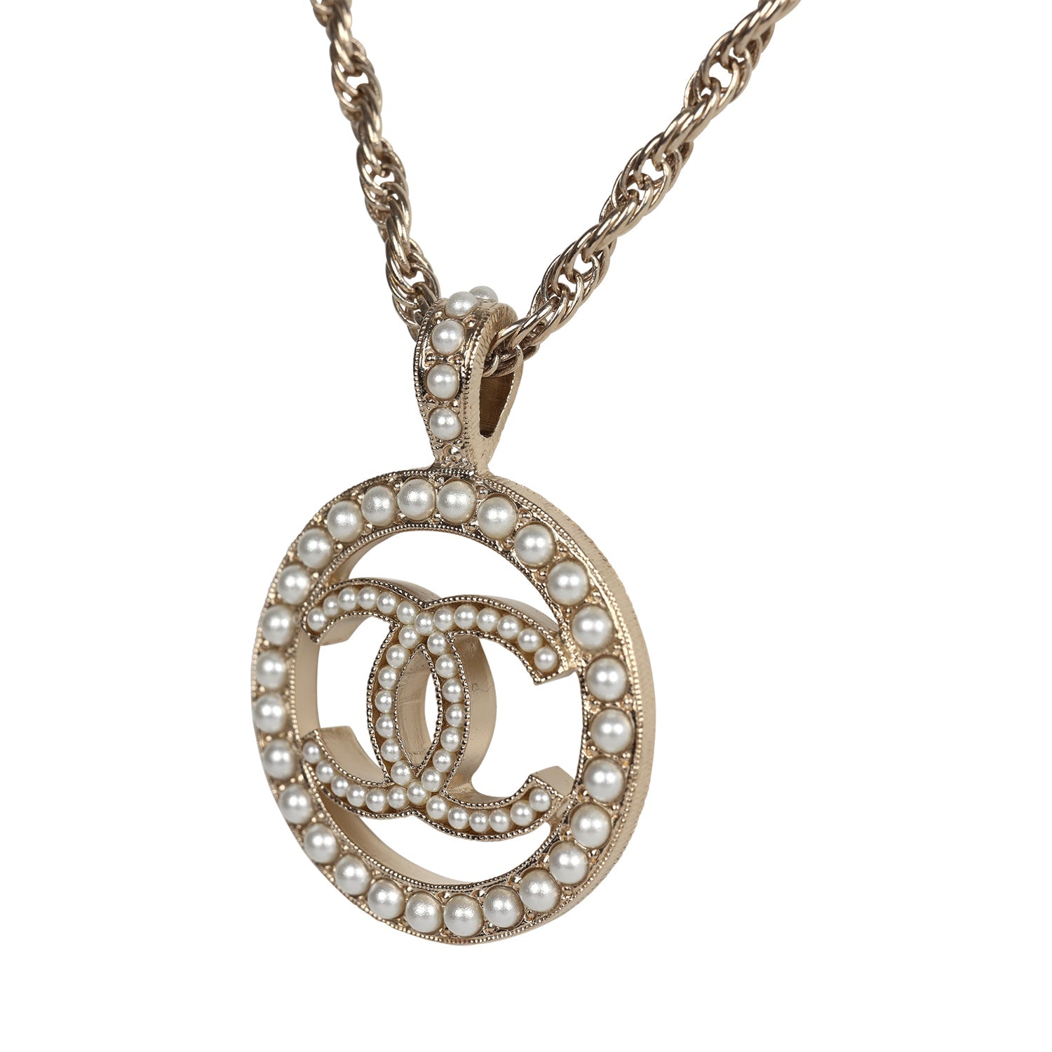 Chanel Round CC Pearl Pendant Necklace Light Gold Hardware