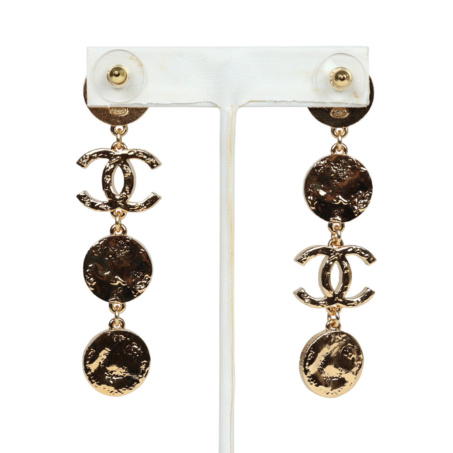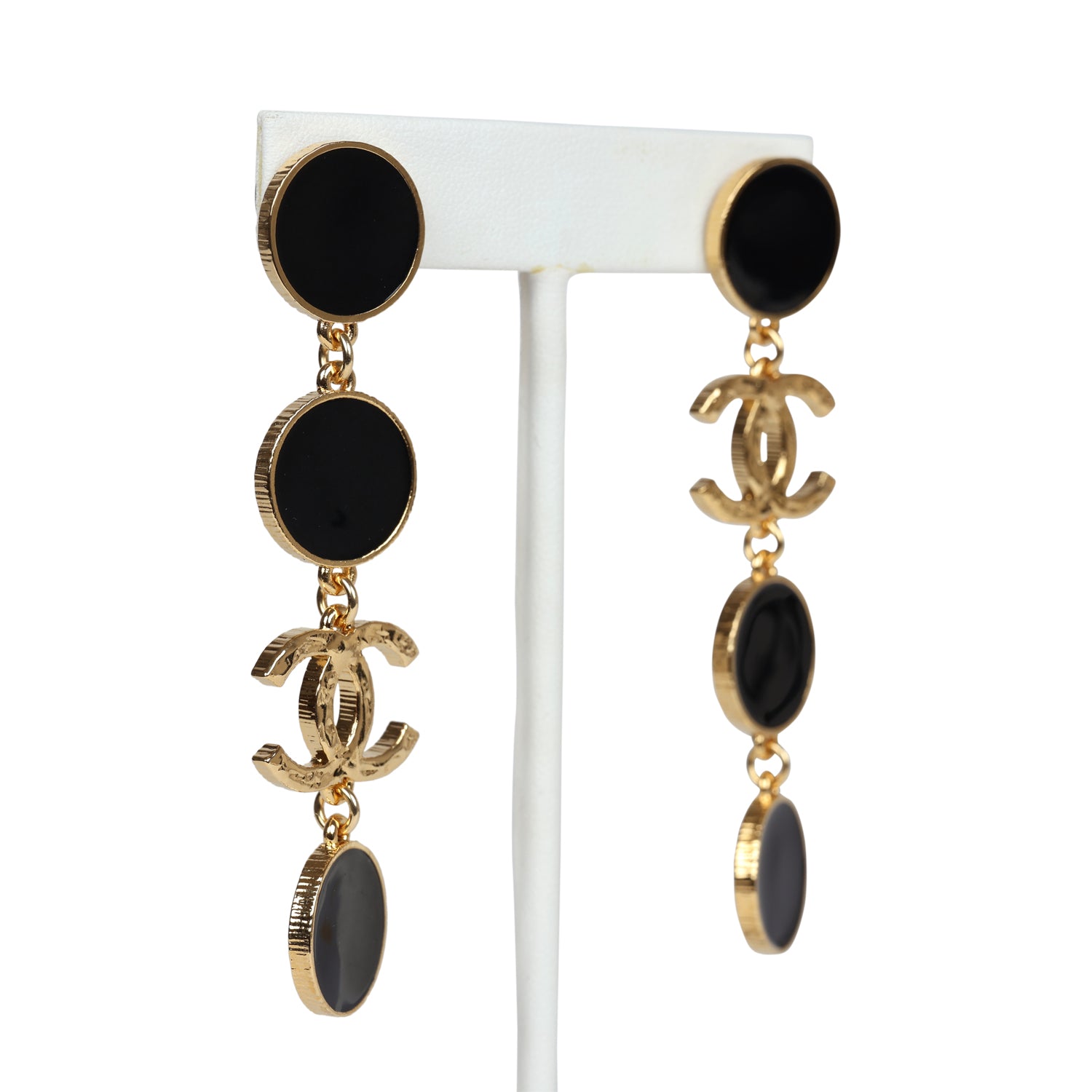 These Dangle CC Earrings are in Black enamel with gold tone metal and feature CC's and black enamel dangling circles with post back earring closure.