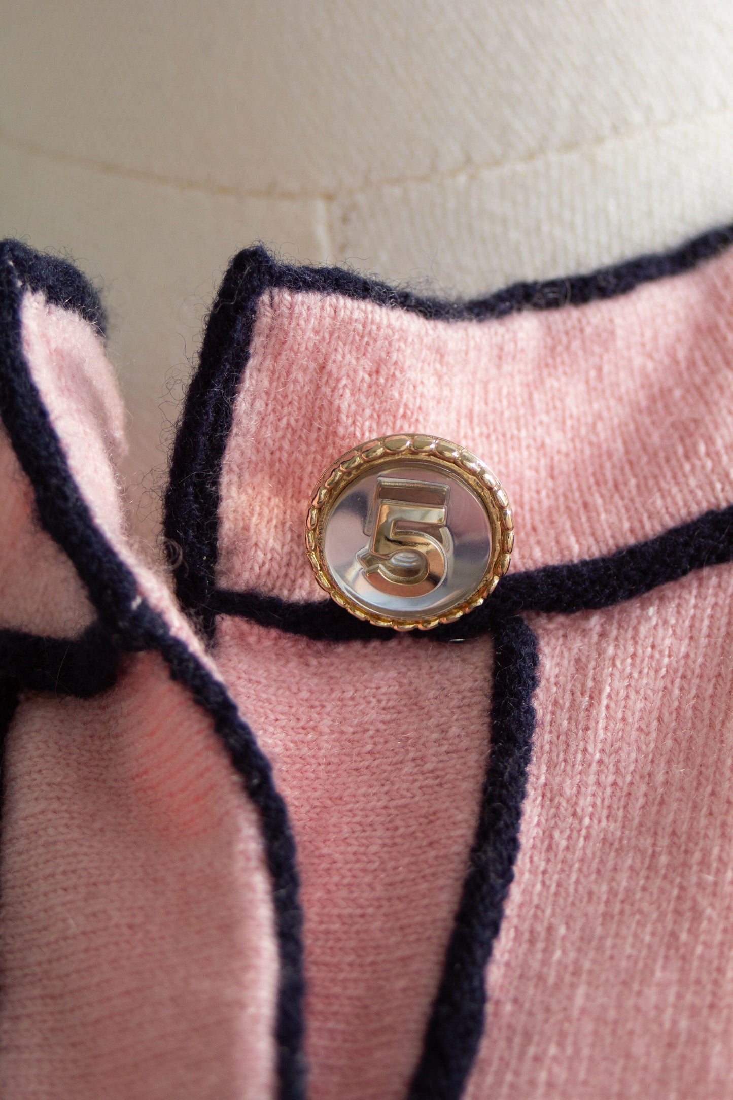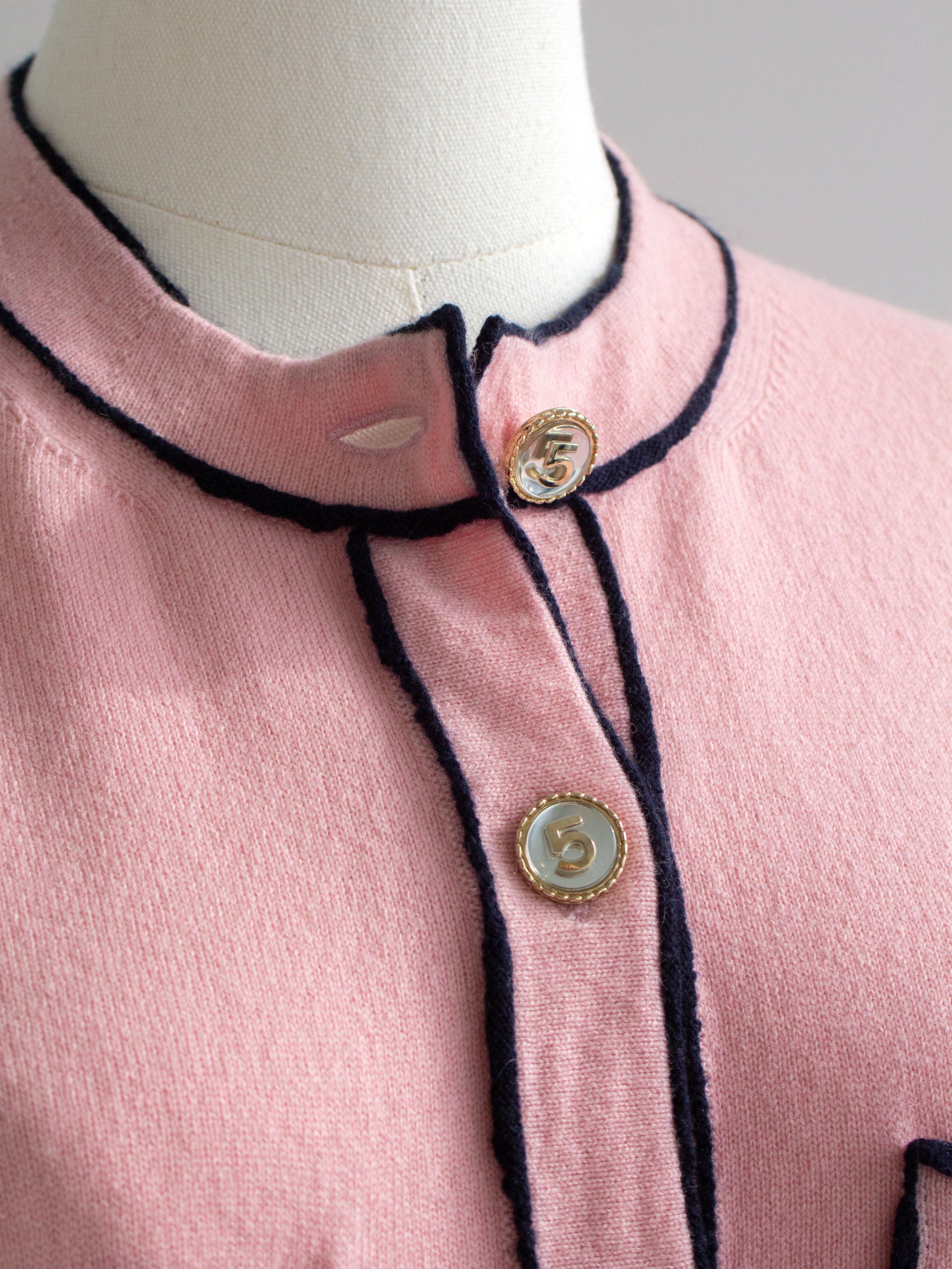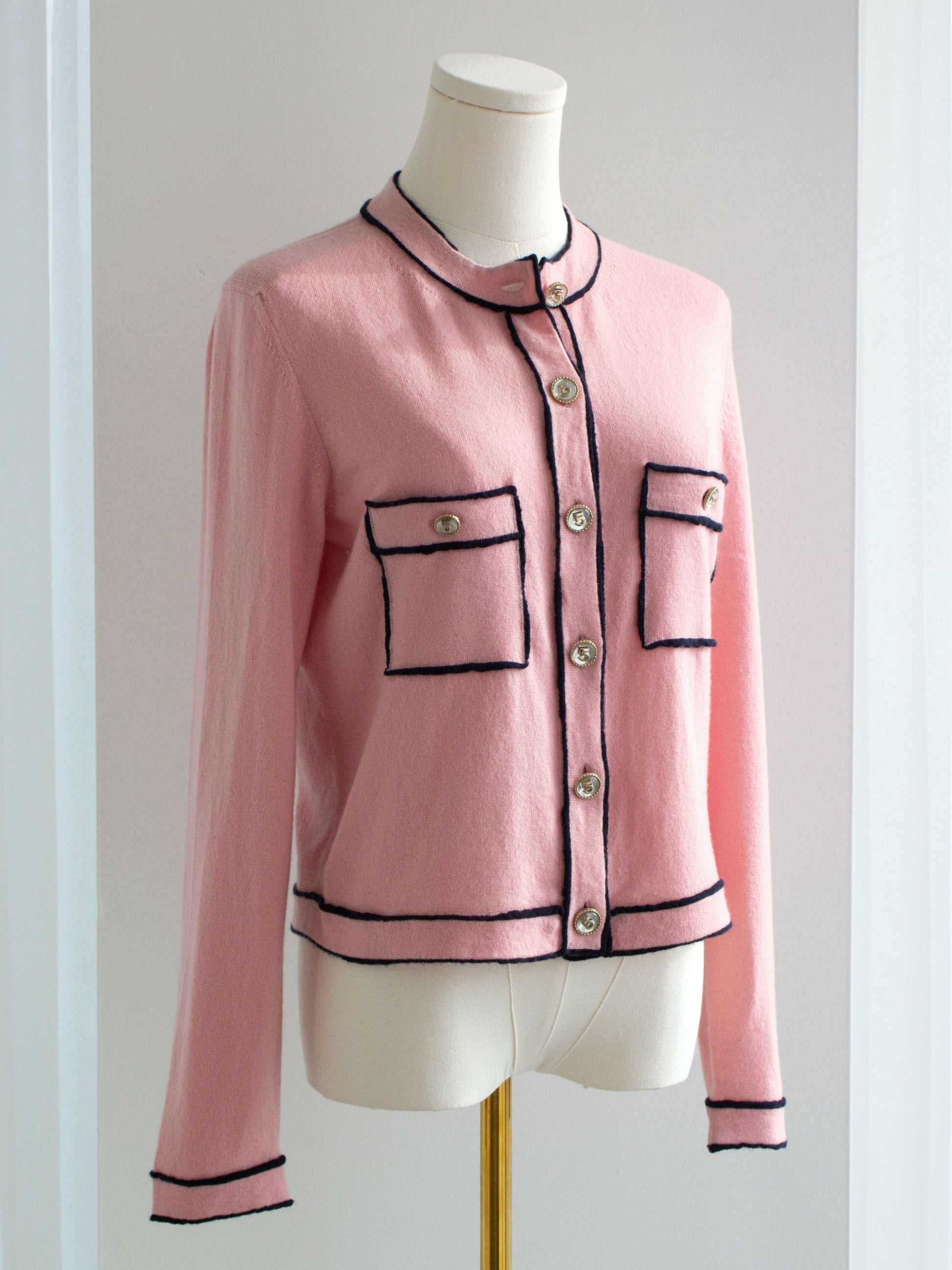 From the Chanel Spring 2021 collection, this iconic pink cashmere cardigan became a favorite among fashion bloggers and celebrities. Its soft pastel hue is beautifully contrasted by midnight blue trim, accentuating the structured silhouette and refined craftsmanship. The front is adorned with signature gold-tone buttons featuring the number "5", a subtle homage to the brand’s legendary history.