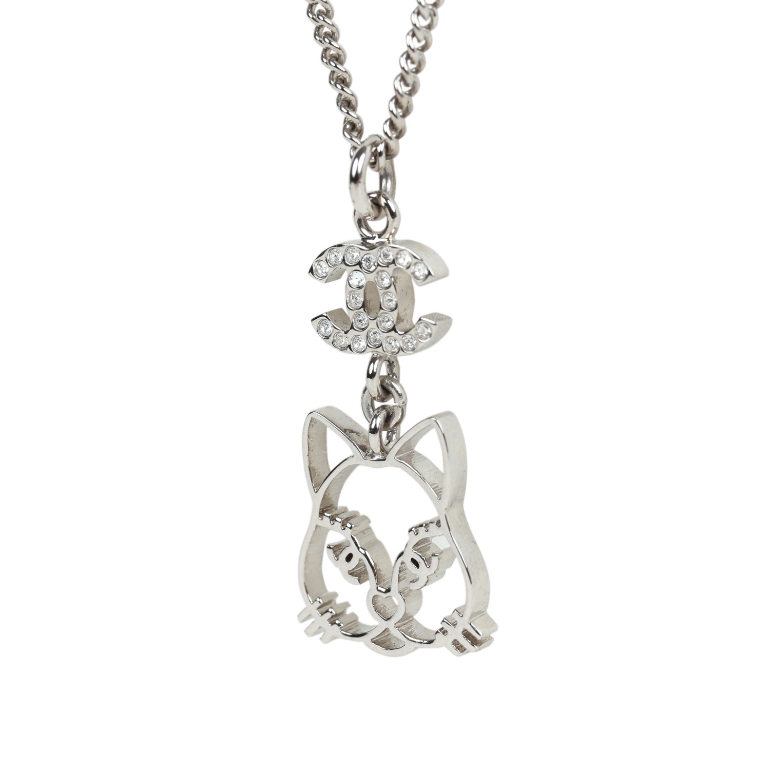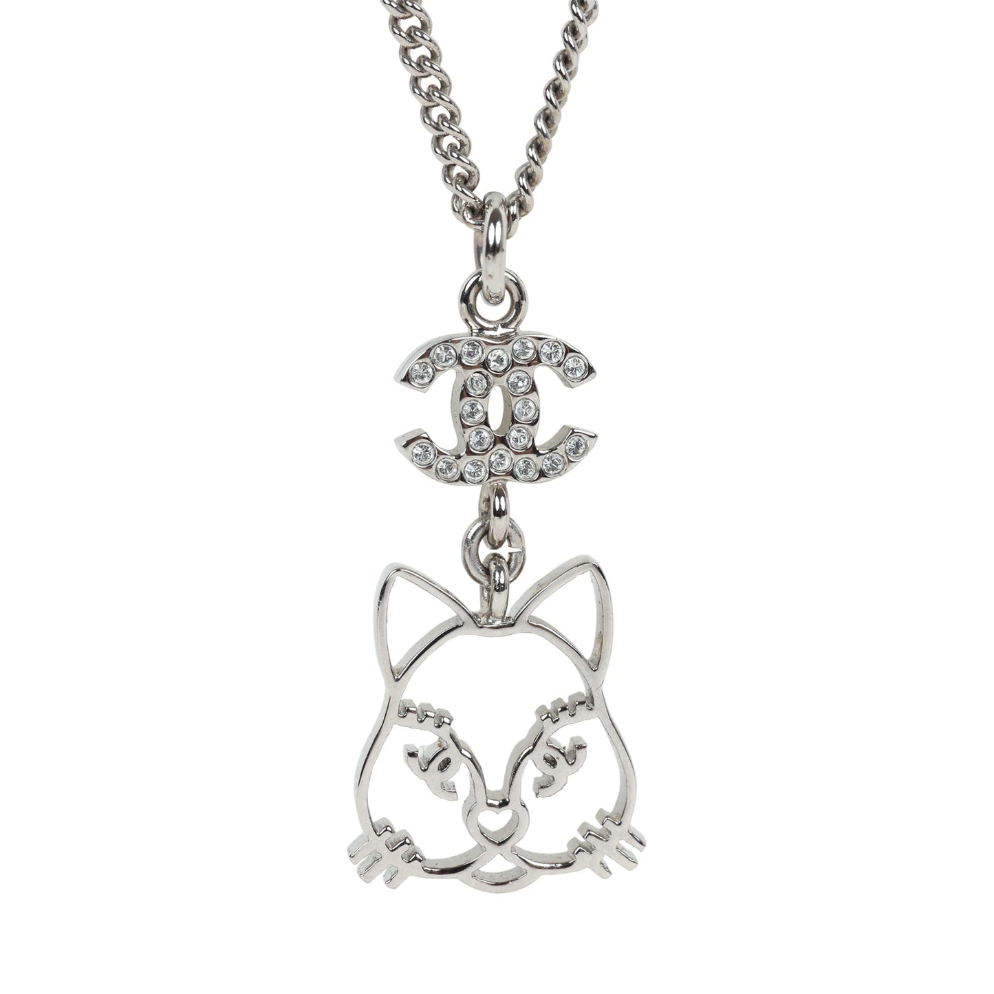Chanel Silver CC Crystal Choupette Cat Emoji Pendant Necklace