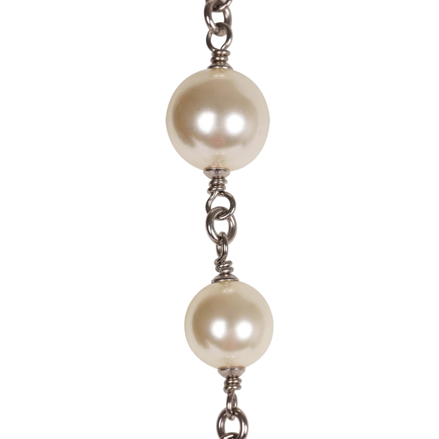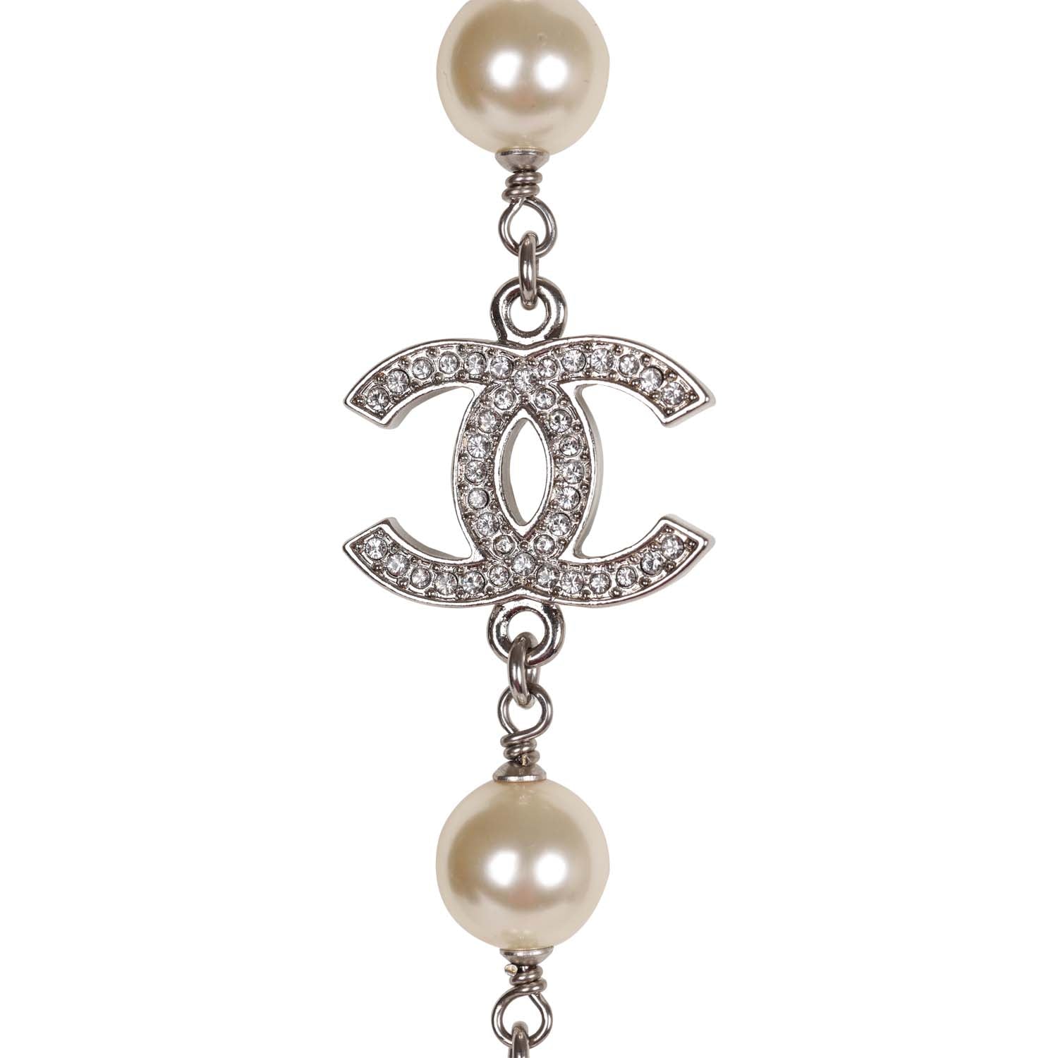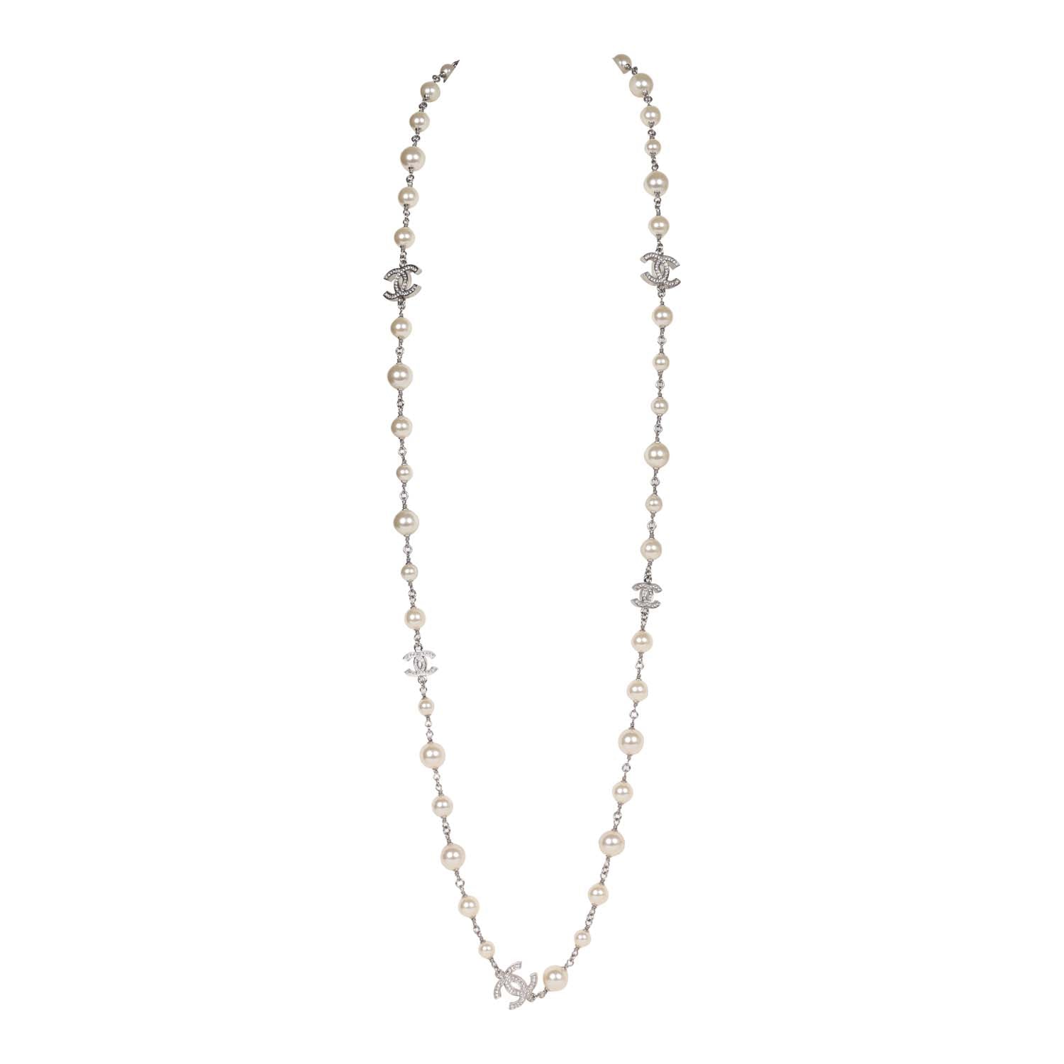Chanel Silver Metal, White Strass, and White Pearl Logo Sautoir Necklace