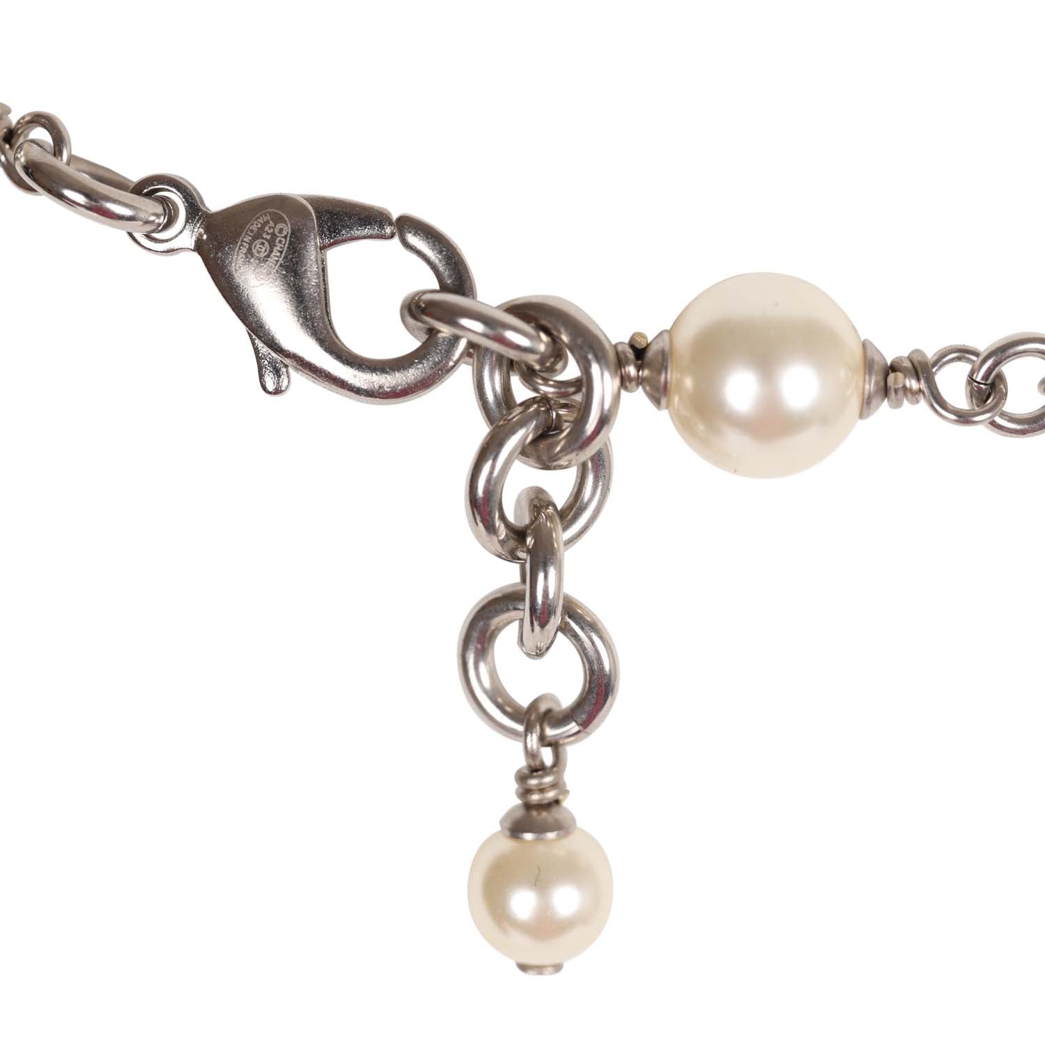 This Chanel logo necklace is in silver metal, white strass, and pearls.