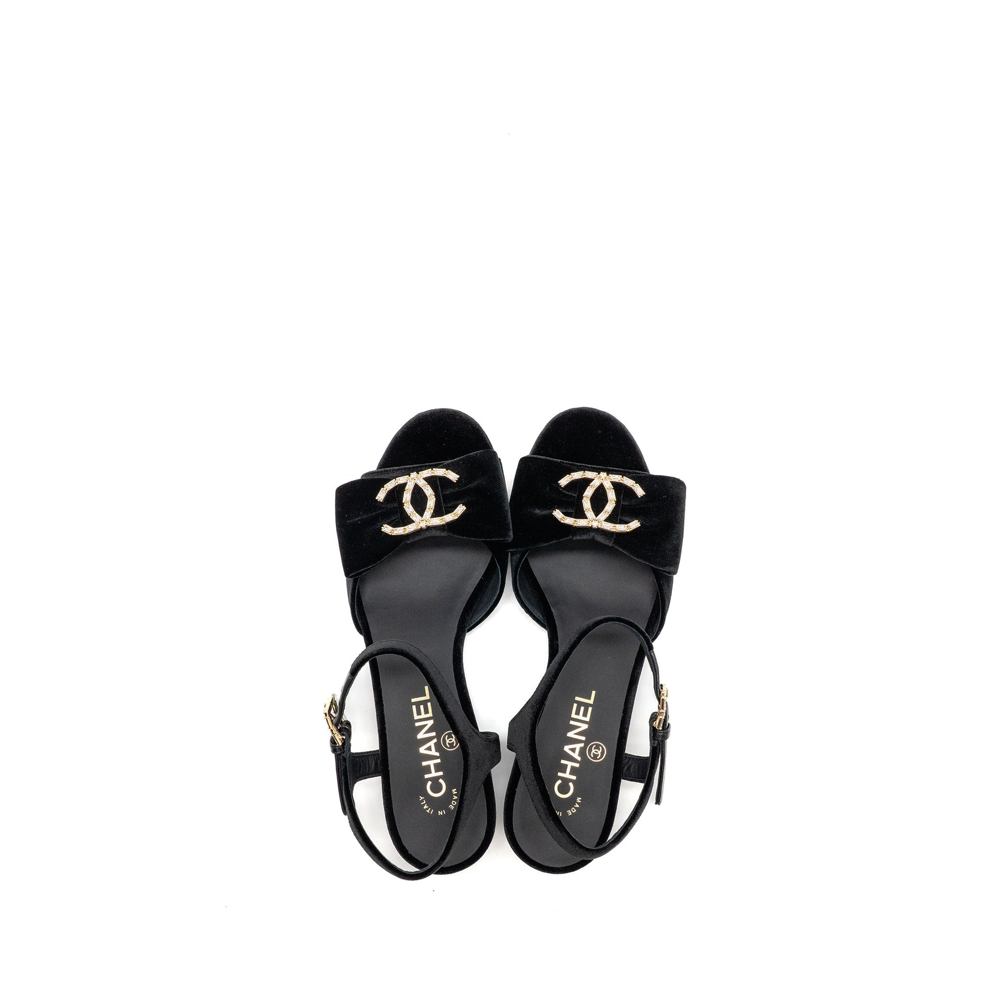 Chanel Size 36 24K Crystal CC Logo Sandals Velvet Black L