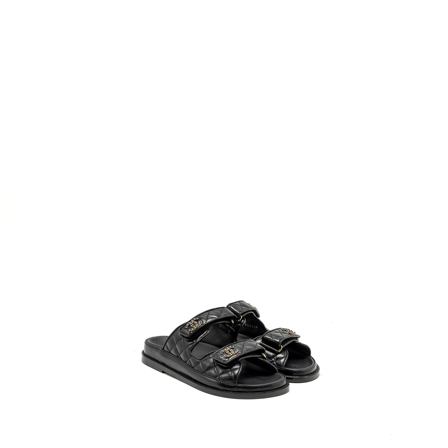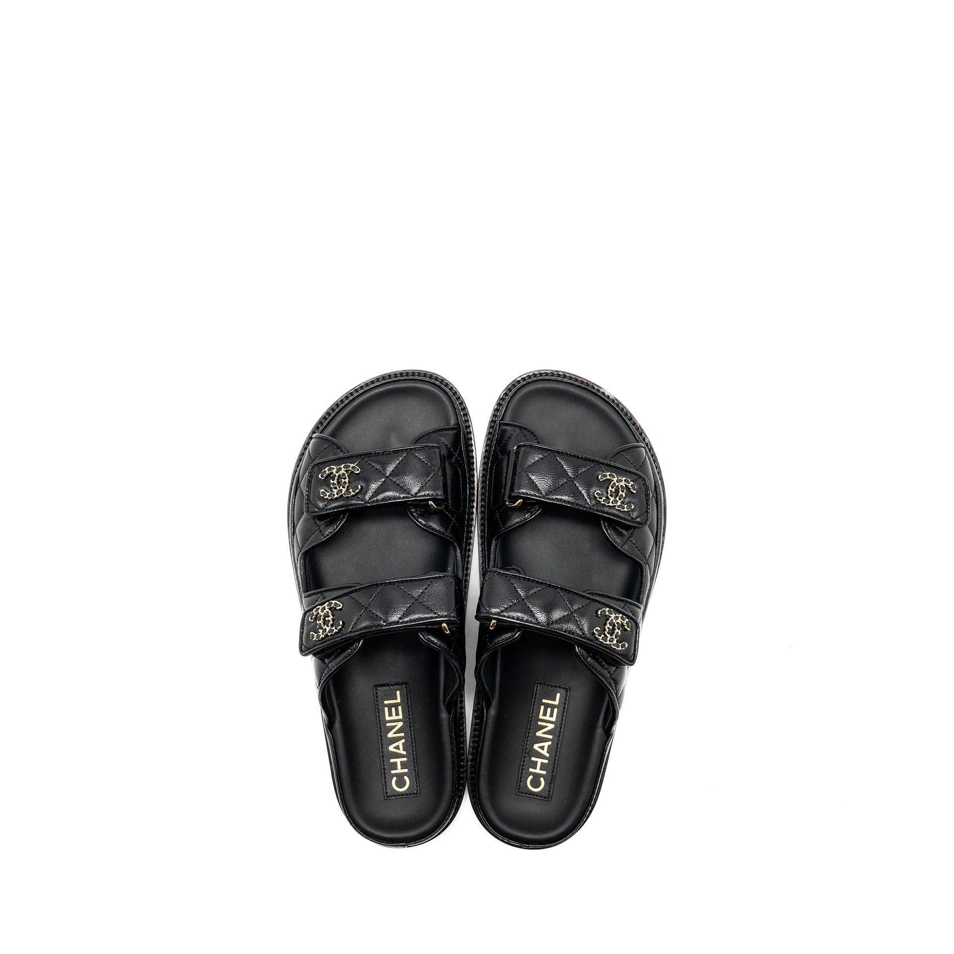 Chanel Size 38 CC logo Dad Sandals Leather Black Light Gold Tone