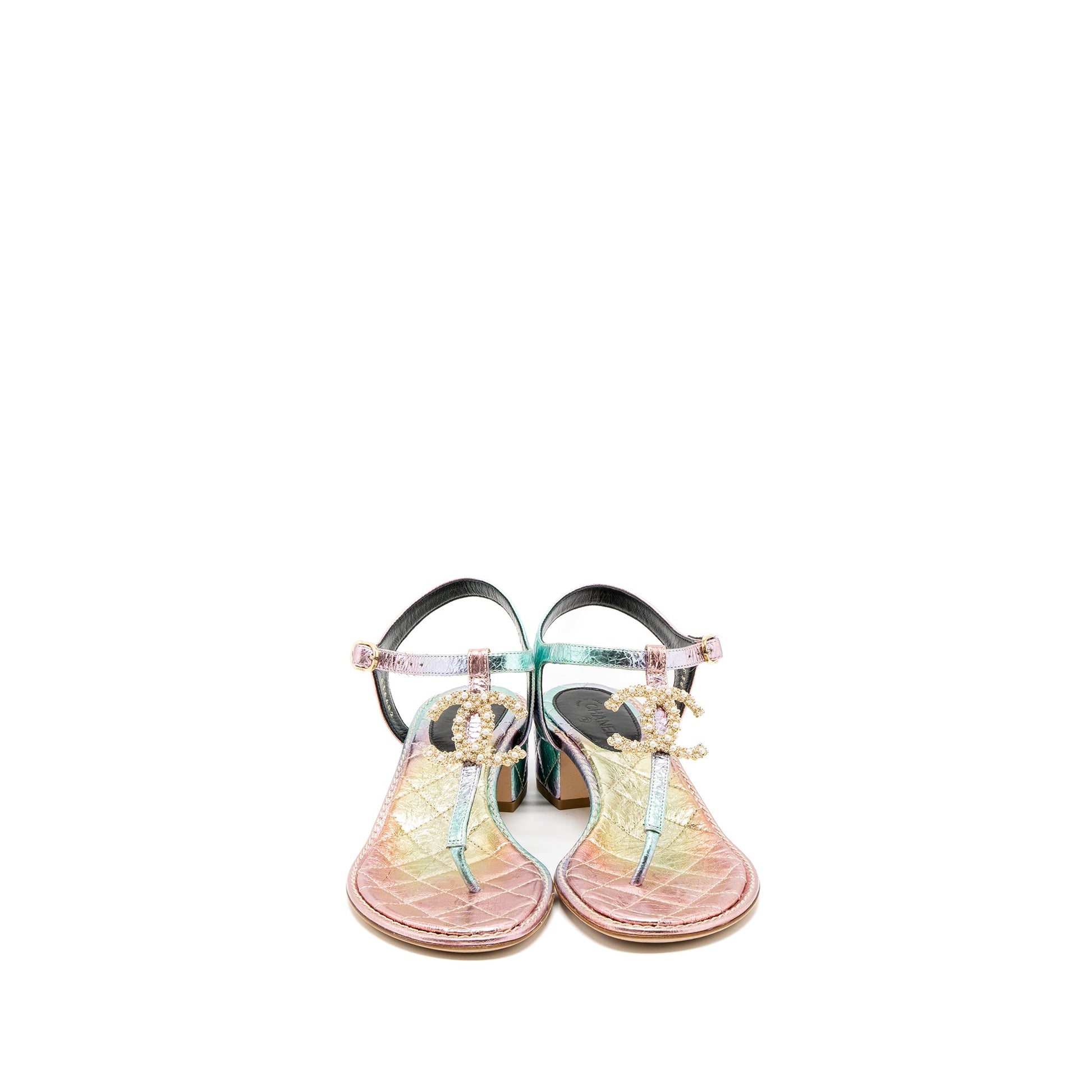 Chanel Size 38 Detailed CC Logo Leather Iridescent Multicolour Sandals