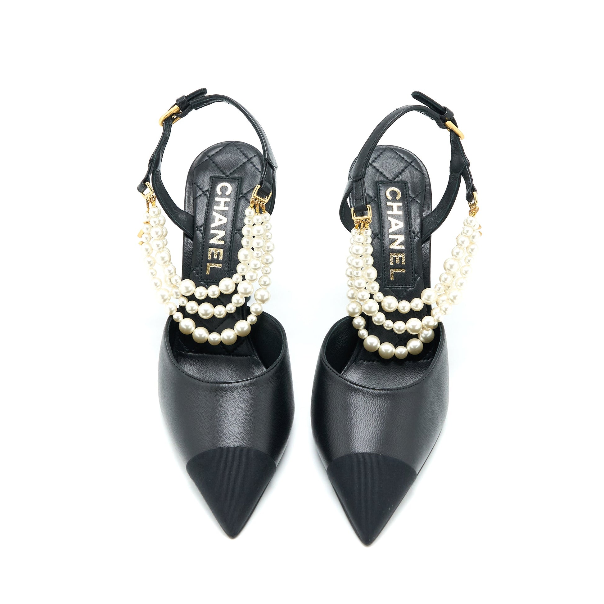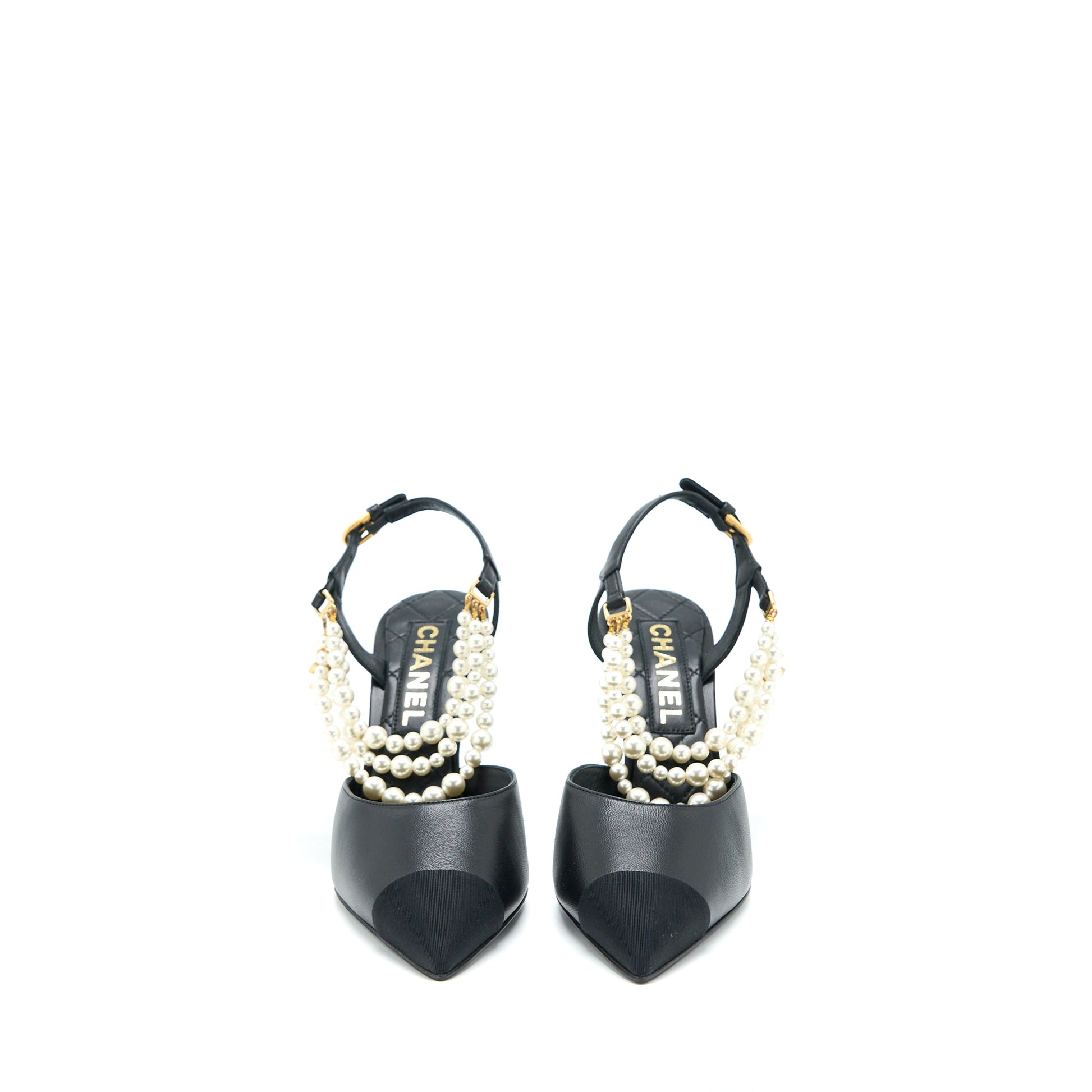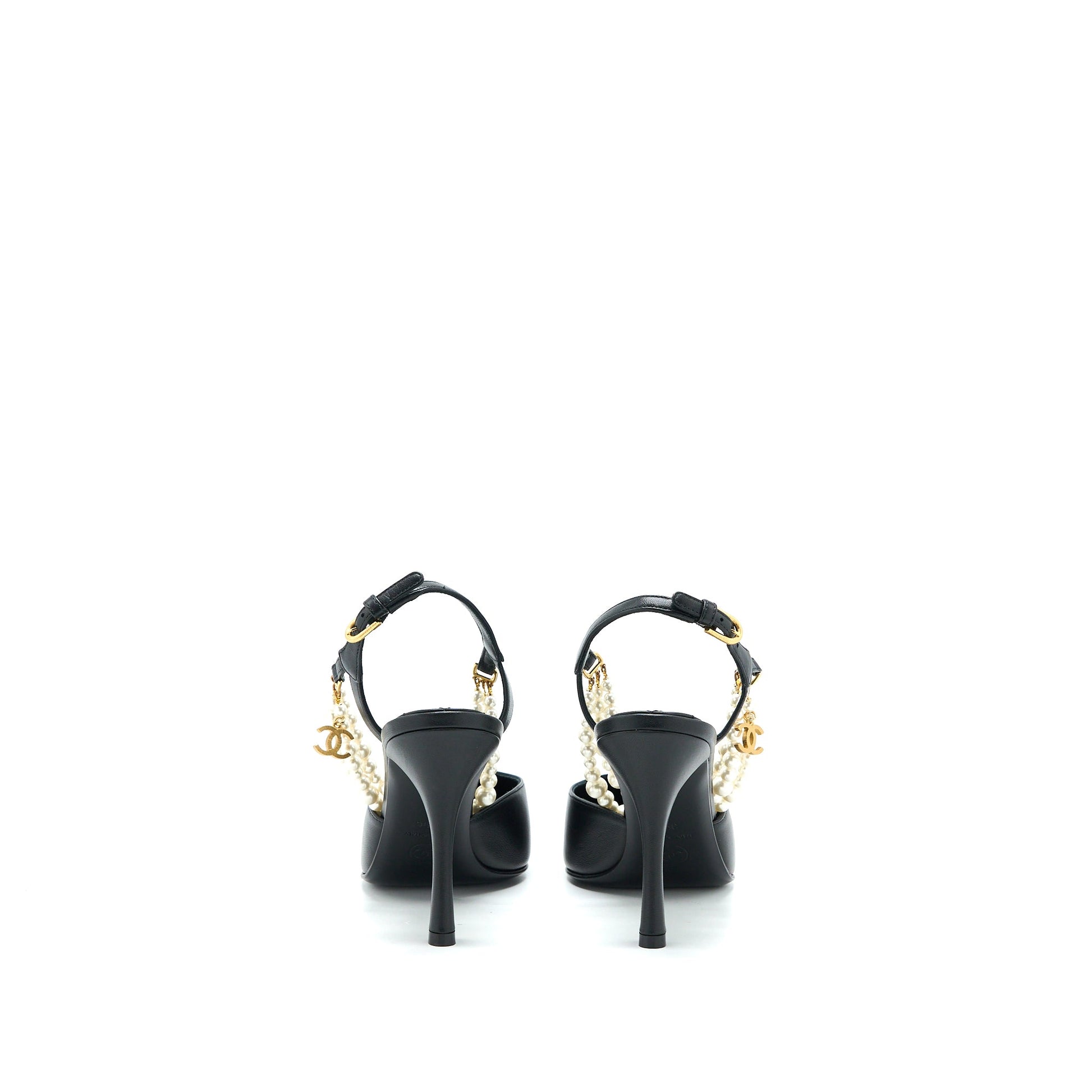 Chanel Size 39 Heel with Pearl Leather/Fabric Black