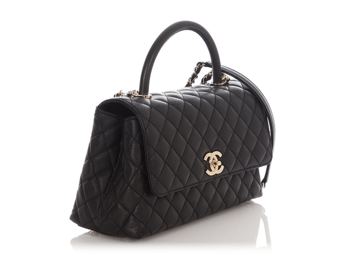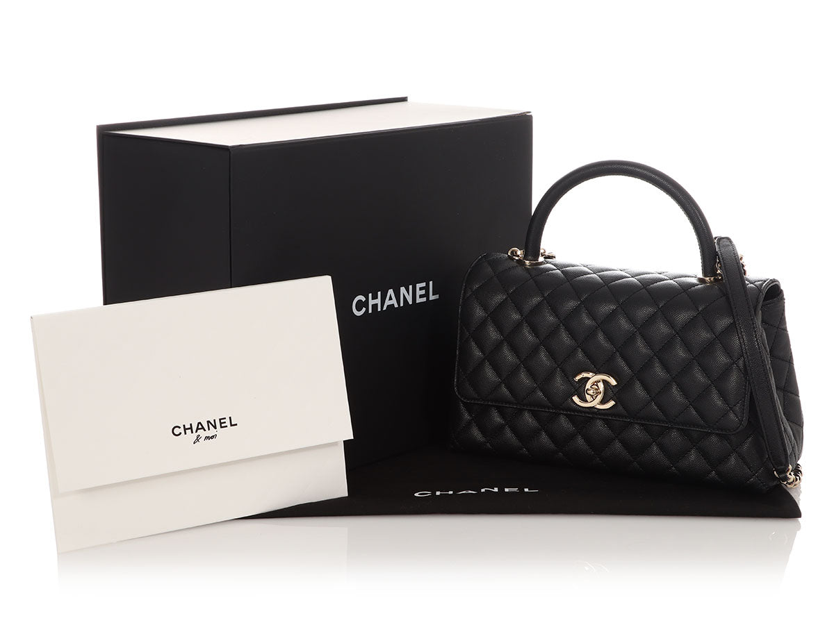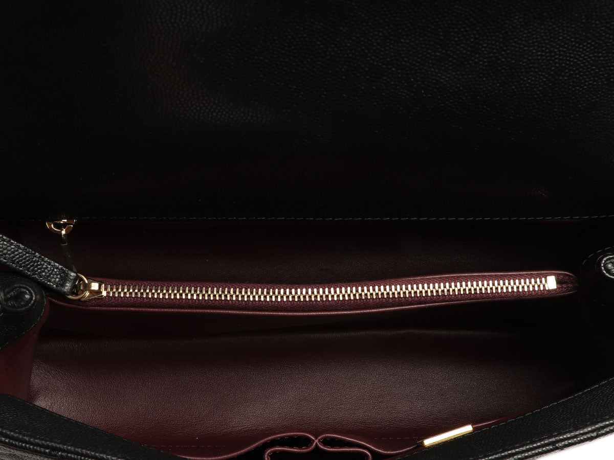 This Chanel Small Black Quilted Caviar Coco Top Handle gives you the best of both worlds—a top handle and a crossbody strap all rolled into one gorgeous carry! Crafted from diamond-quilted Caviar leather with light gold hardware, it features a structured top handle with a 3-inch drop and a detachable leather-through-chain strap with a generous 18-inch drop. The flap secures with a CC logo turnlock and opens to a burgundy leather interior with a center zippered section, two slide pockets in the front, and one zipped pocket in the back. You’ll also find one slide pocket on the back face for quick-access essentials. In great condition from 2024, it comes with a dustbag and box, and has wear on the turnlock and hardware, and a little wear inside. It’s a Coco-approved look no matter how you style it!