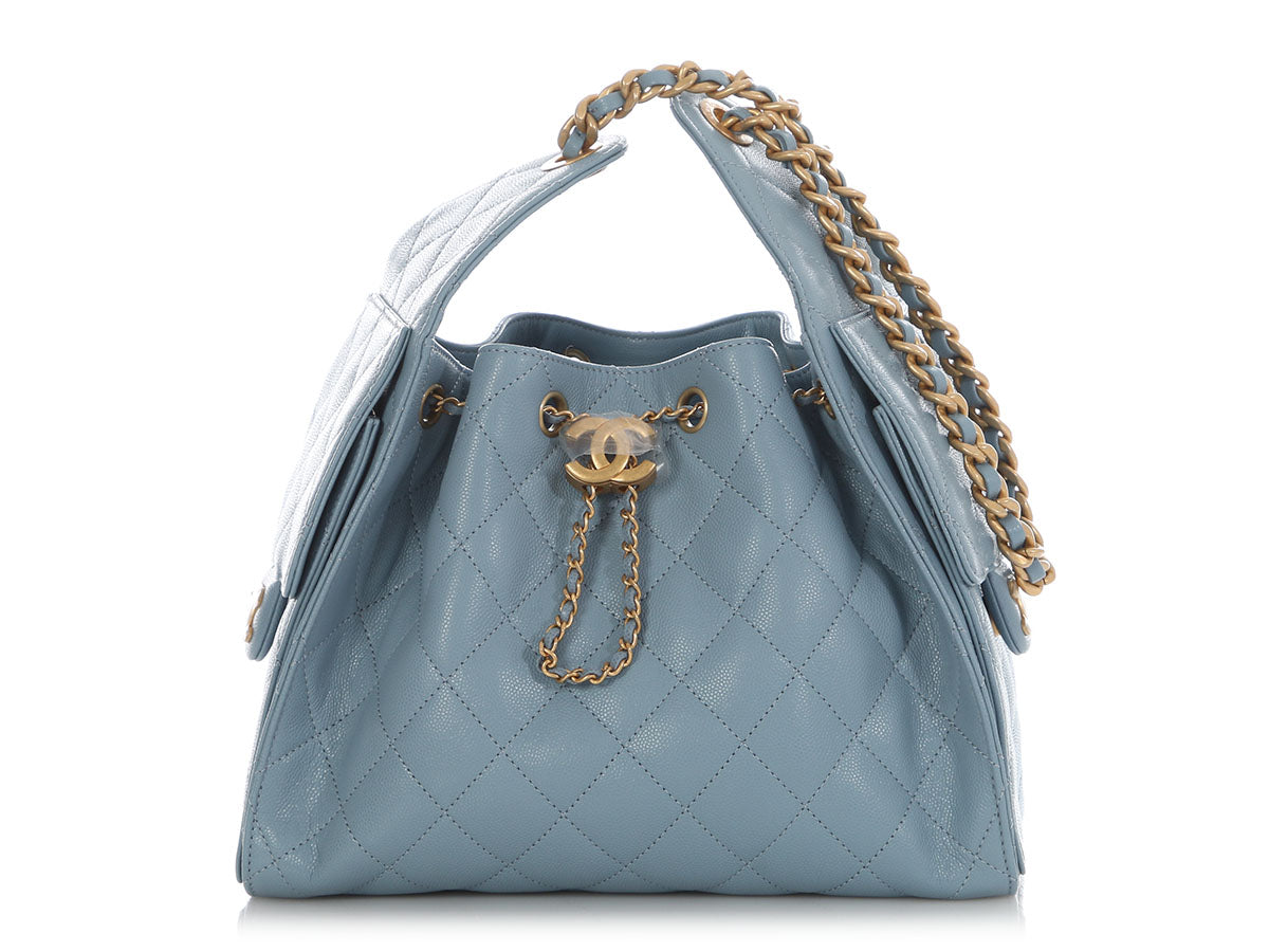 A standout in shape and shade, this Chanel Small Blue Quilted Caviar 25 Bag is a rare gem! Crafted from diamond-quilted leather with antique gold hardware, it features leather-threaded chain handles with a 12-inch drop. A CC logo slider cinches the drawstring threaded through grommets around the open top, while magnetic pockets on each side offer handy exterior storage for a mobile phone or pack of gum. Inside, you’ll find three slide pockets and tonal fabric lining. Brand new from 2025, it’s a true blue beauty!