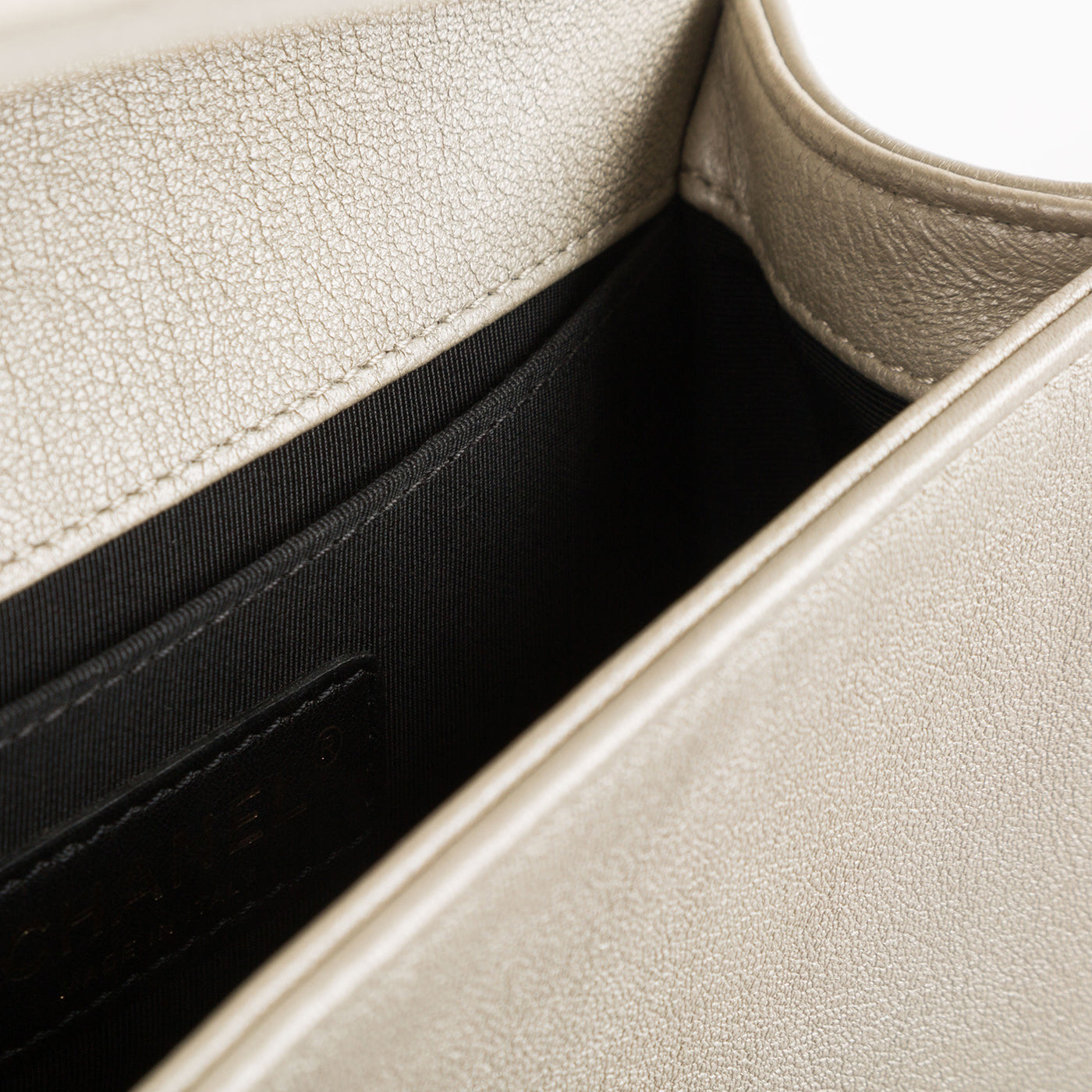 Under the creative direction of Karl Lagerfeld and for his Cruise 2015 collection, Chanel presented this truly magnificent Boy bag. A classic piece with an elegant twist, this gem is carefully crafted from metallic lambskin. Although from a distance it resembles reptile skin, it actually is crafted from small dots instead of Chanel's signature quilted leather. A statement piece that will remain in style and in your wardrobe forever, this Boy is an absolute must-have for any woman with a love for luxury. Dress this bag up for any formal event, or even dress it down with a more casual outfit if you really want to make a statement! Wherever you go or whatever you were it with, all eyes will definitely be on you. No luxury handbag collection is truly complete without a Chanel bag - and let's be honest, not all women need a man, but they definitely need a Boy. ;)