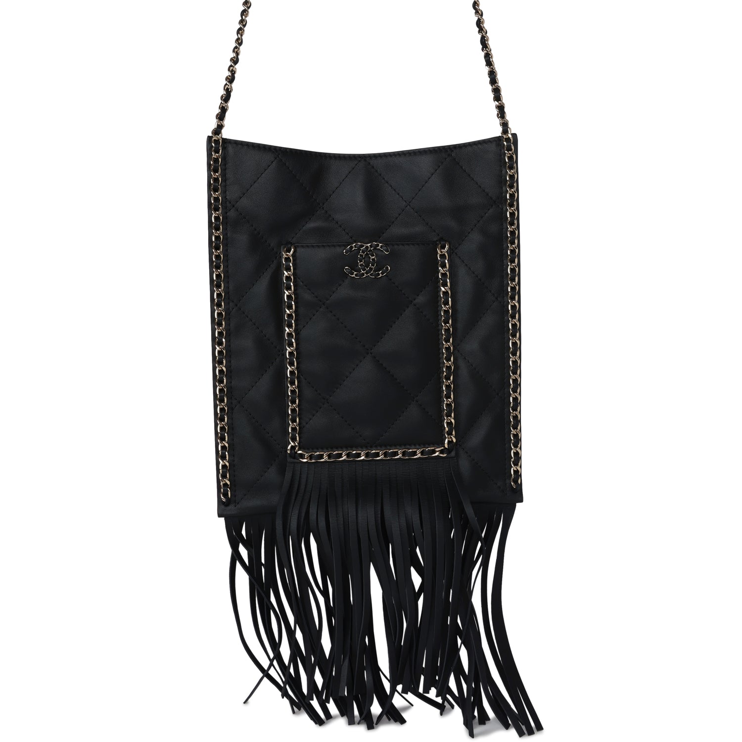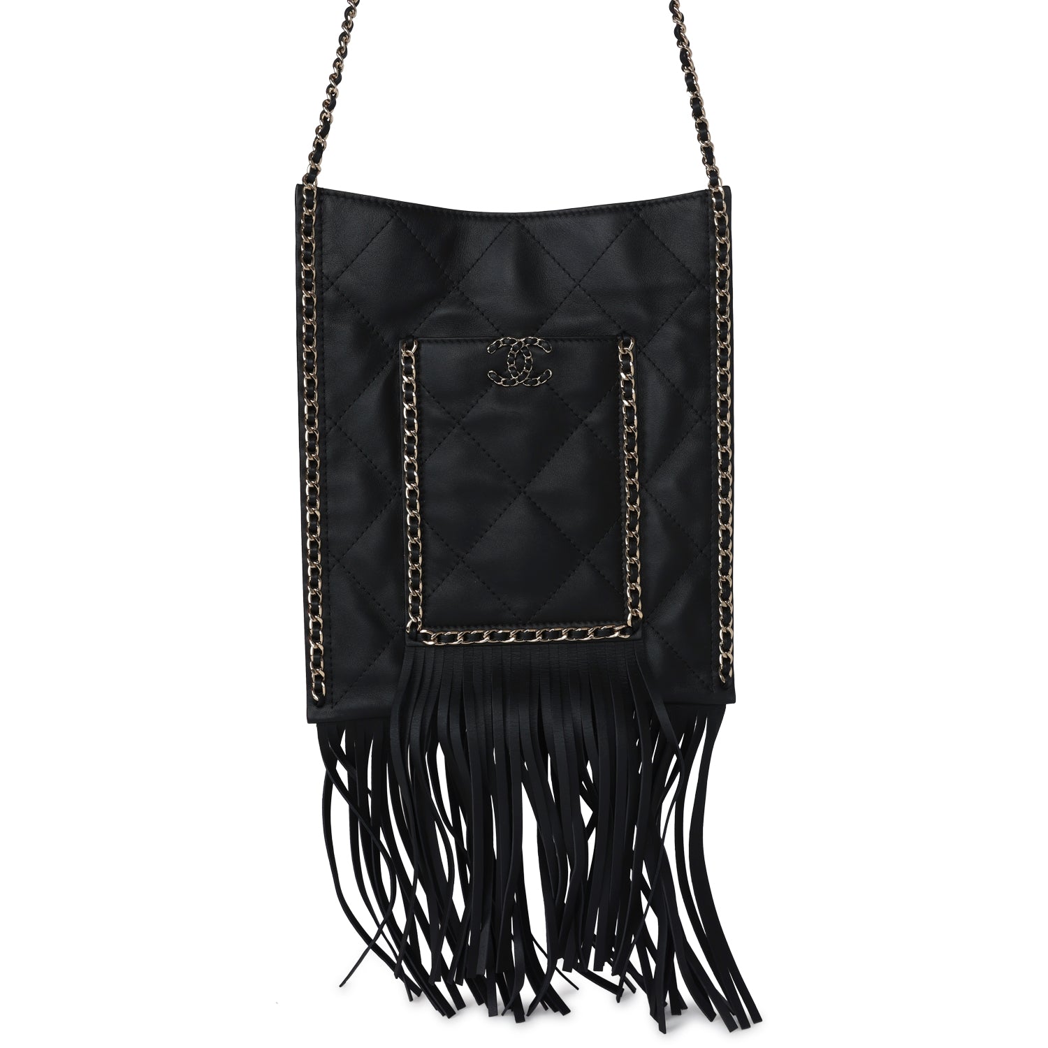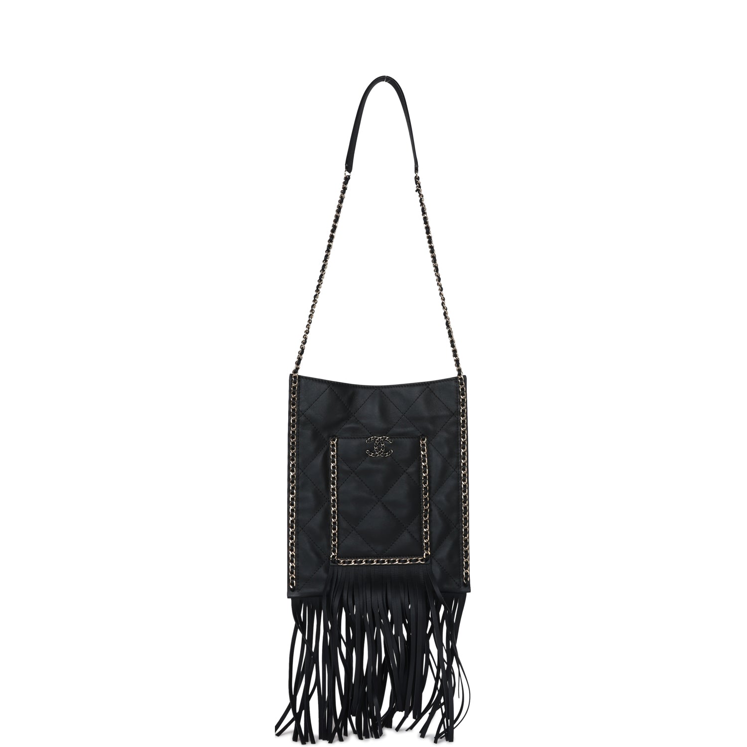 This Chanel small CC fringe shopping bag is in black calfskin leather with light gold hardware, featuring a flat quilted tote, front pocket with interwoven leather and light gold hardware chainlink trimming with a matching CC logo on the front pocket, light gold chainlink and black leather trimming along the sides of tote with fringe on the ends of the front pocket and tote. It has a single interwoven light gold and black leather chain shoulder strap and a magnetic snap closure.