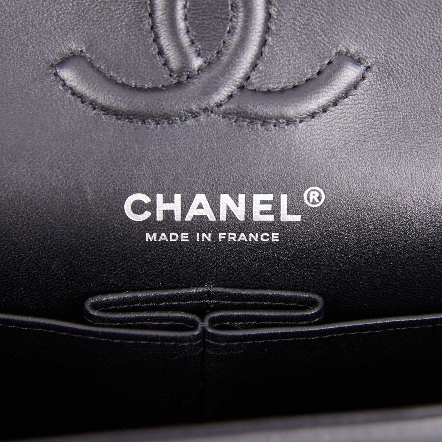 This Small Chevron Classic Double Flap bag is in black calfskin leather with silver tone hardware and features a front flap with signature CC turnlock closure, half moon back pocket, and adjustable interwoven silver tone chain link and black leather shoulder strap.
