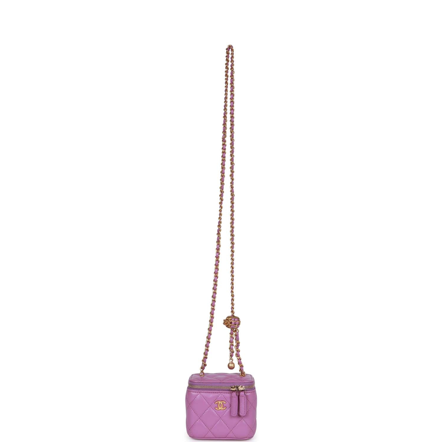 This Small Classic CC Vanity Case is in purple lambskin leather with gold hardware, CC logo, and an interwoven enamel charm chain shoulder/crossbody strap with gold metal and purple leather.